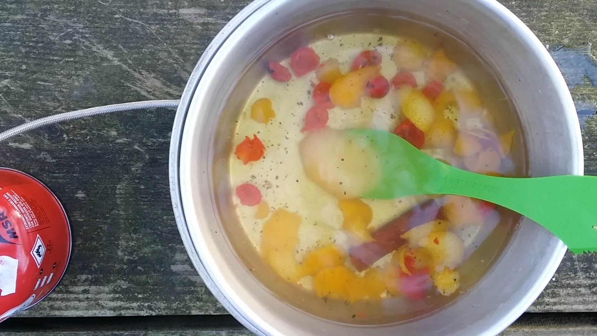 Skala av skalet av en halv apelsin och tillsätt till grytan. Som vanligt när det kommer till apelsin, se till att inte få med för mycket av det vita då det inte smakar jätte gott..