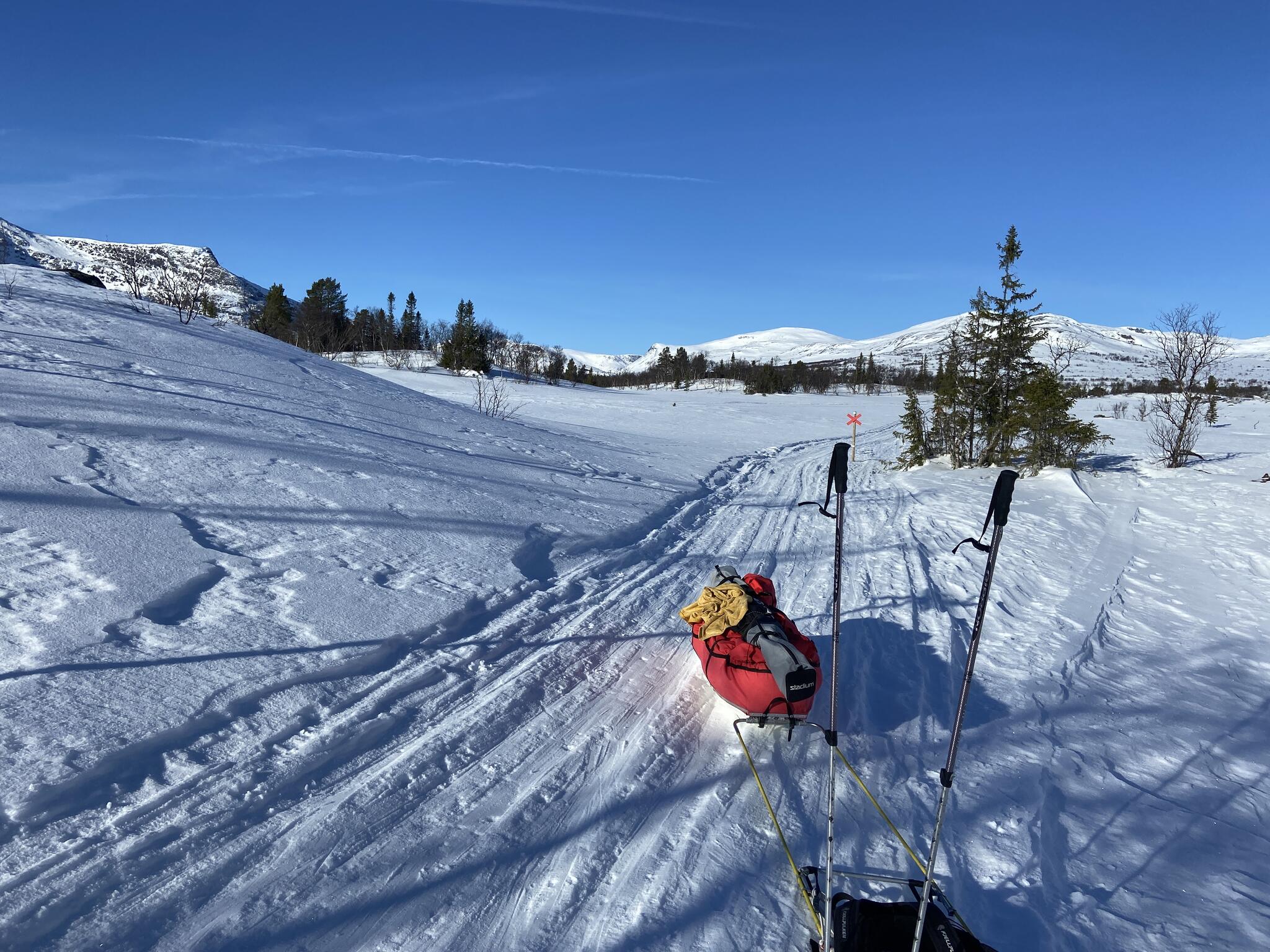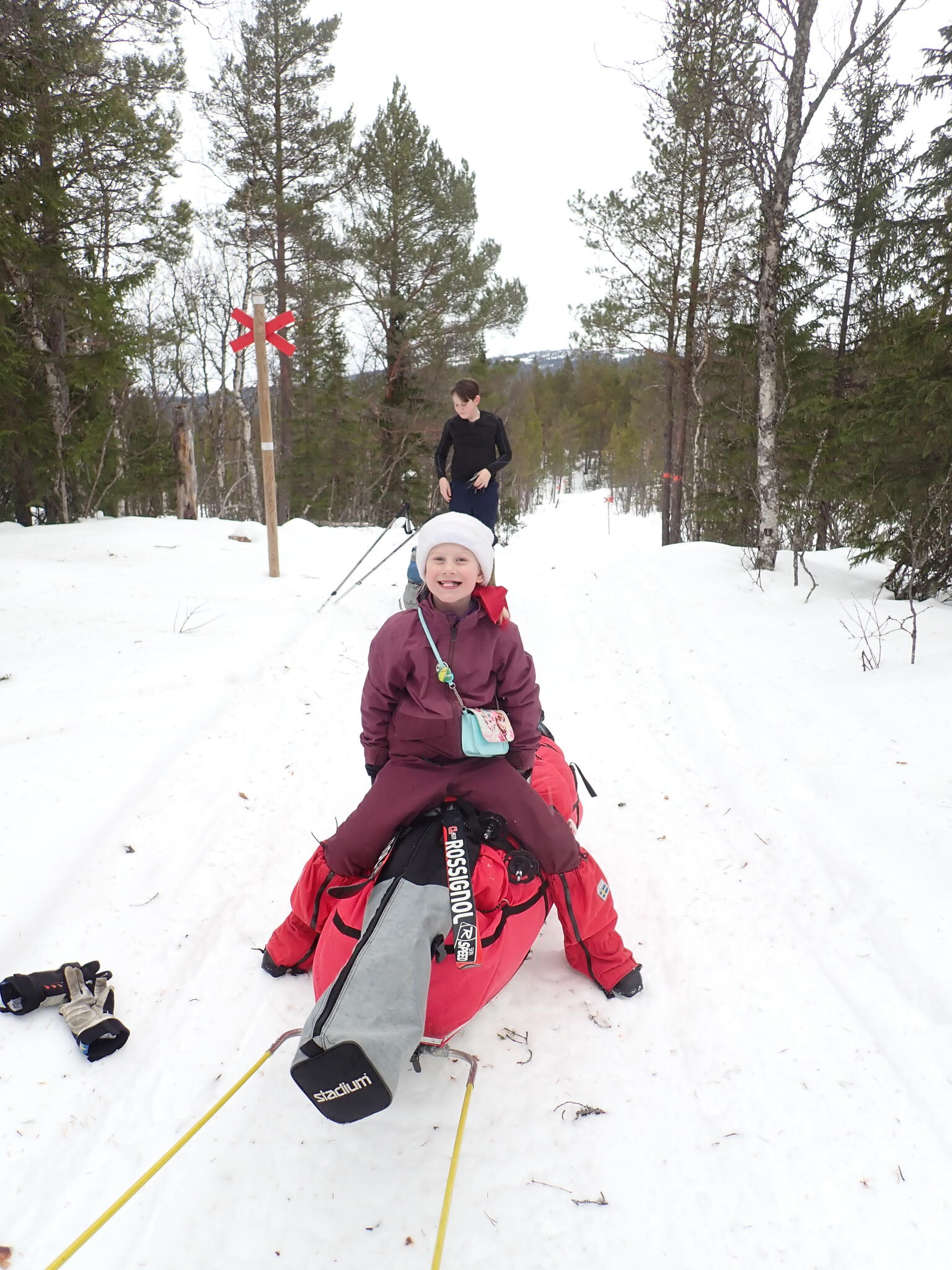 Denna etapp är mestadels uppför. Jag hade den mesta packningen i min pulka medan Emil samtliga dagar hade dagens lunch/fika i en ryggsäck.