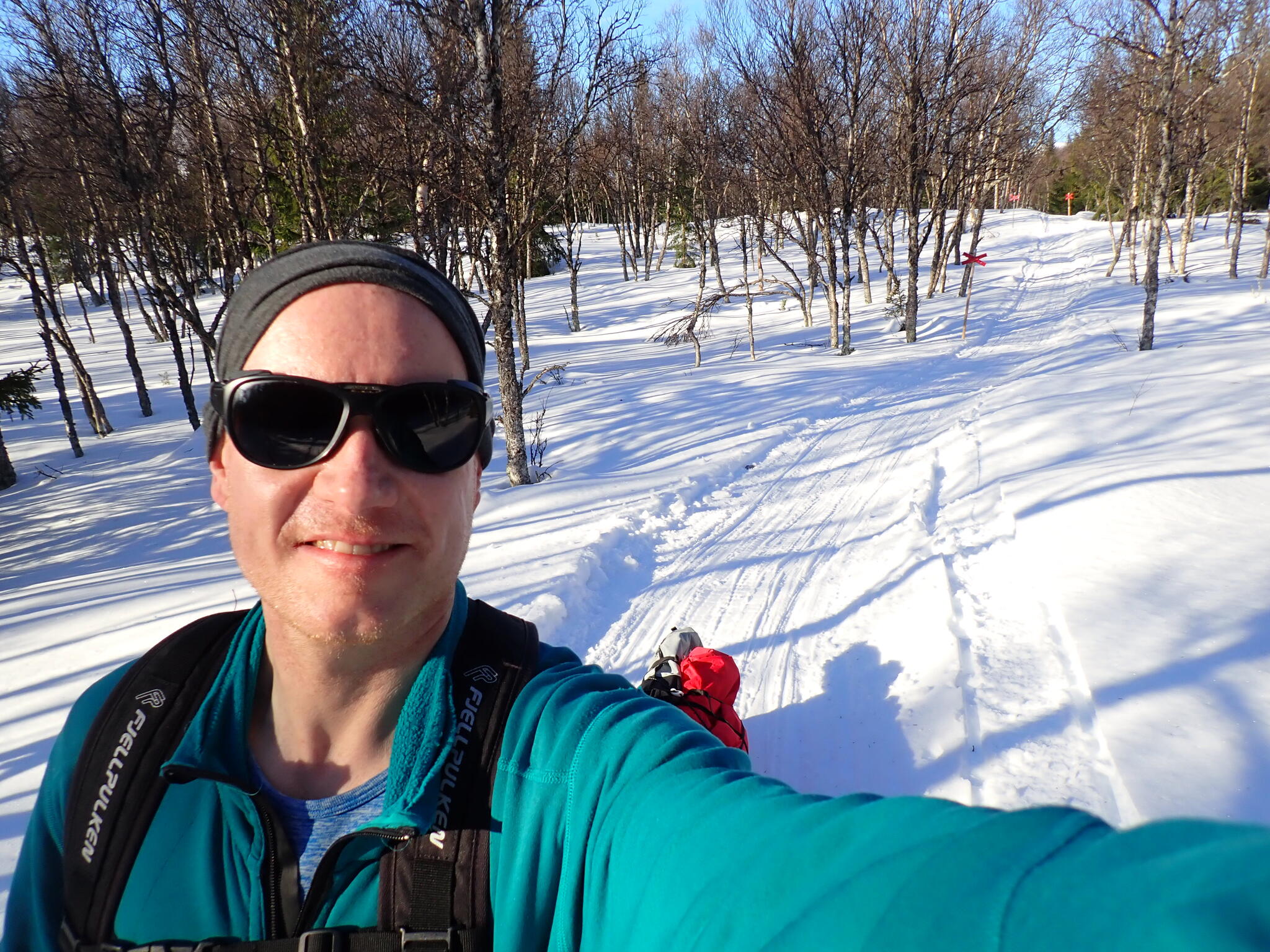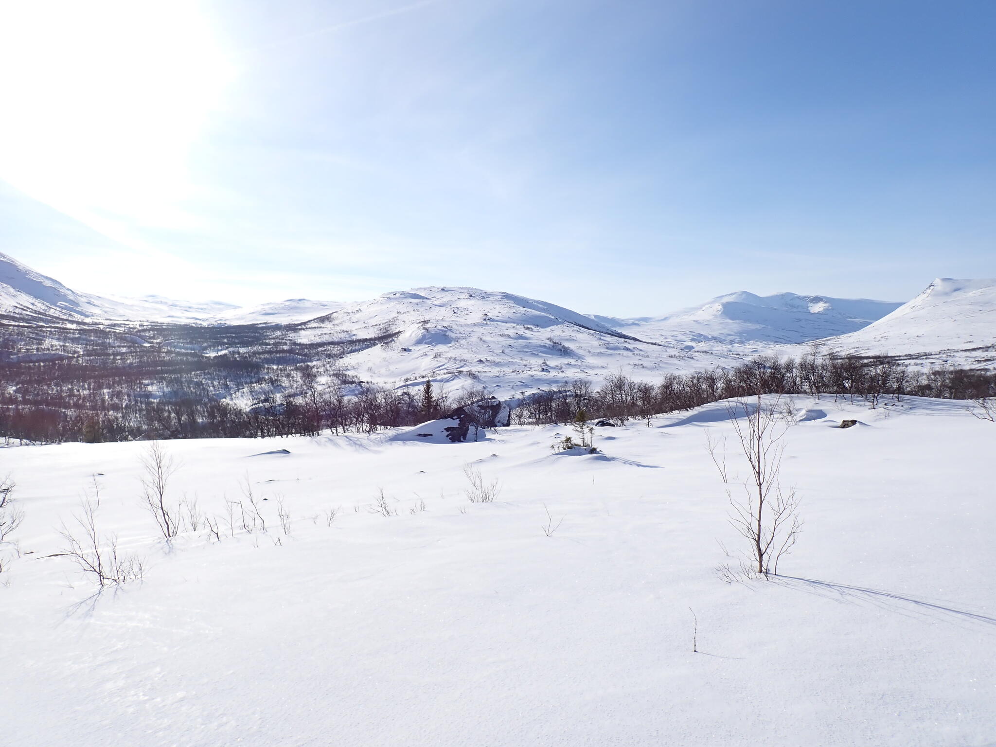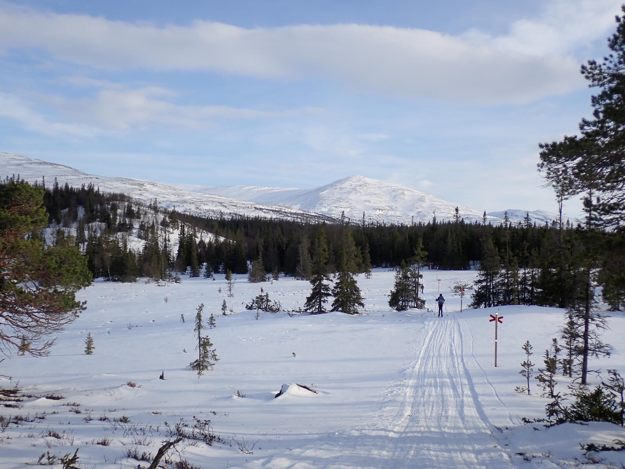 Då barnen var sugna på att hänga inne i den finfina stugan och jag ville åka lite mer skidor gjorde jag en egen liten tur över en bergsrygg och ner i Tväråns dalgång. Varmt, soligt och vindstilla.