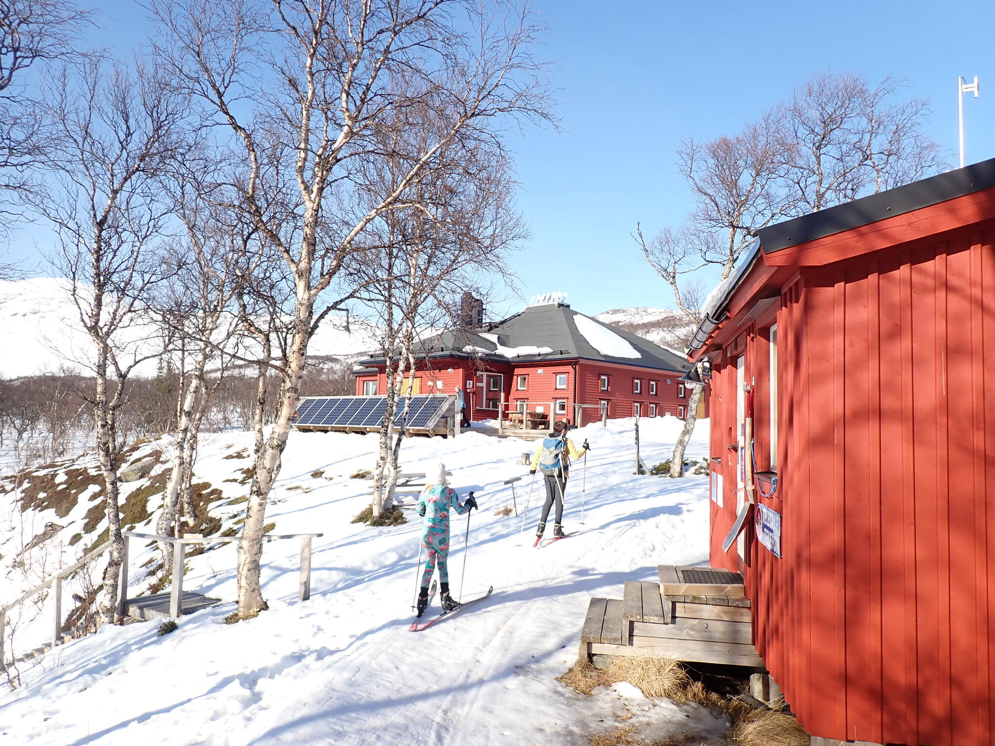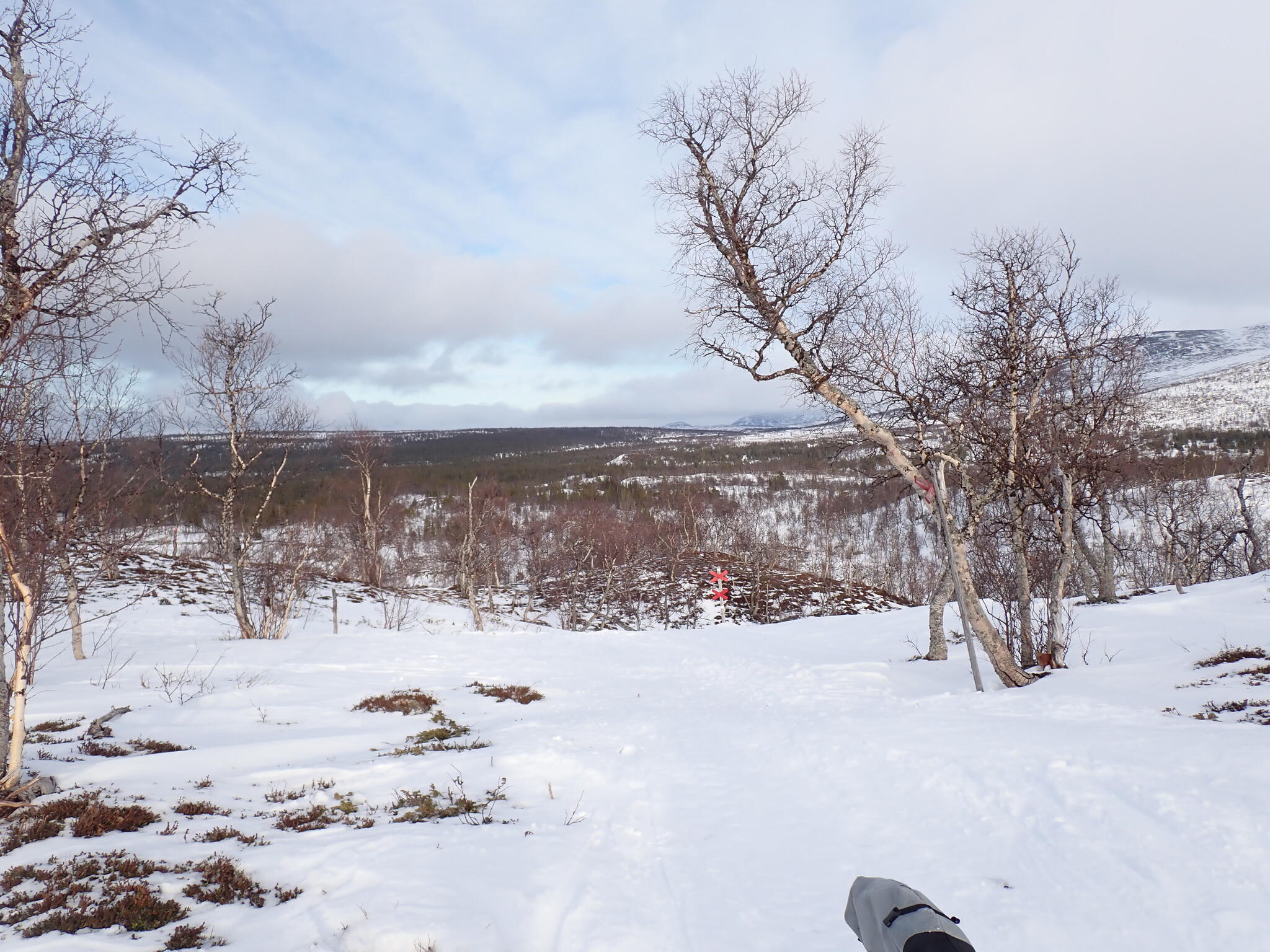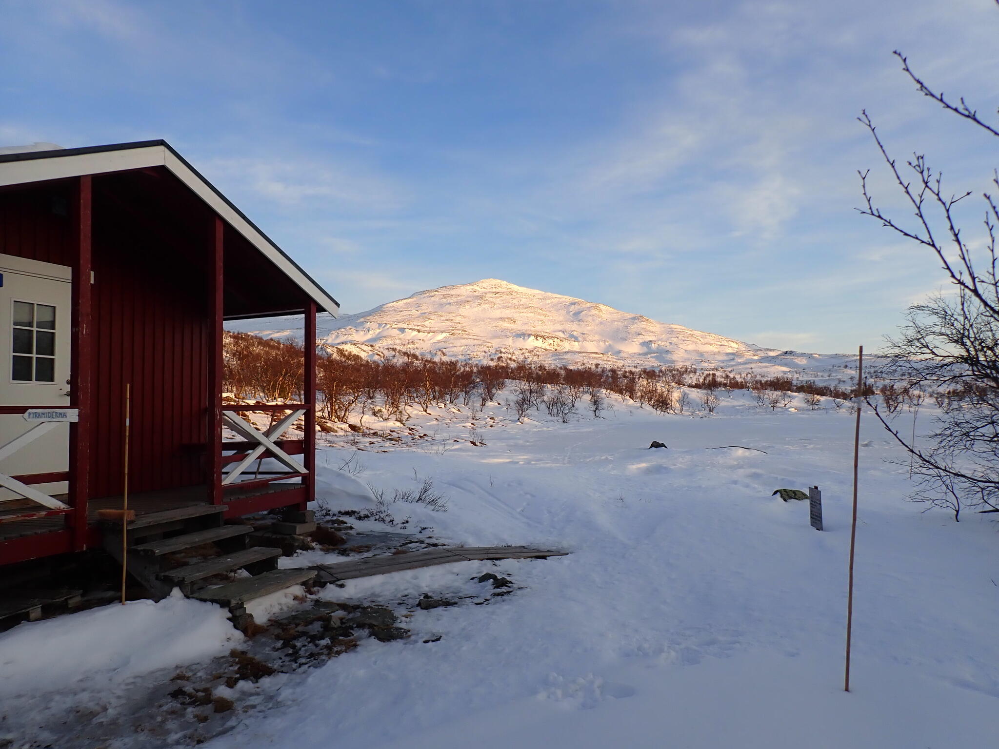 Då barnen var sugna på att hänga inne i den finfina stugan och jag ville åka lite mer skidor gjorde jag en egen liten tur över en bergsrygg och ner i Tväråns dalgång. Varmt, soligt och vindstilla.