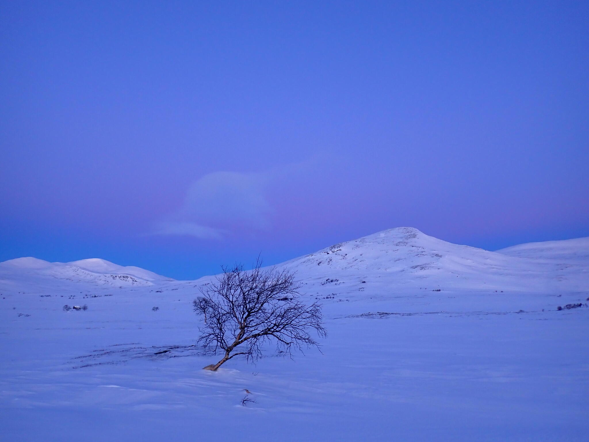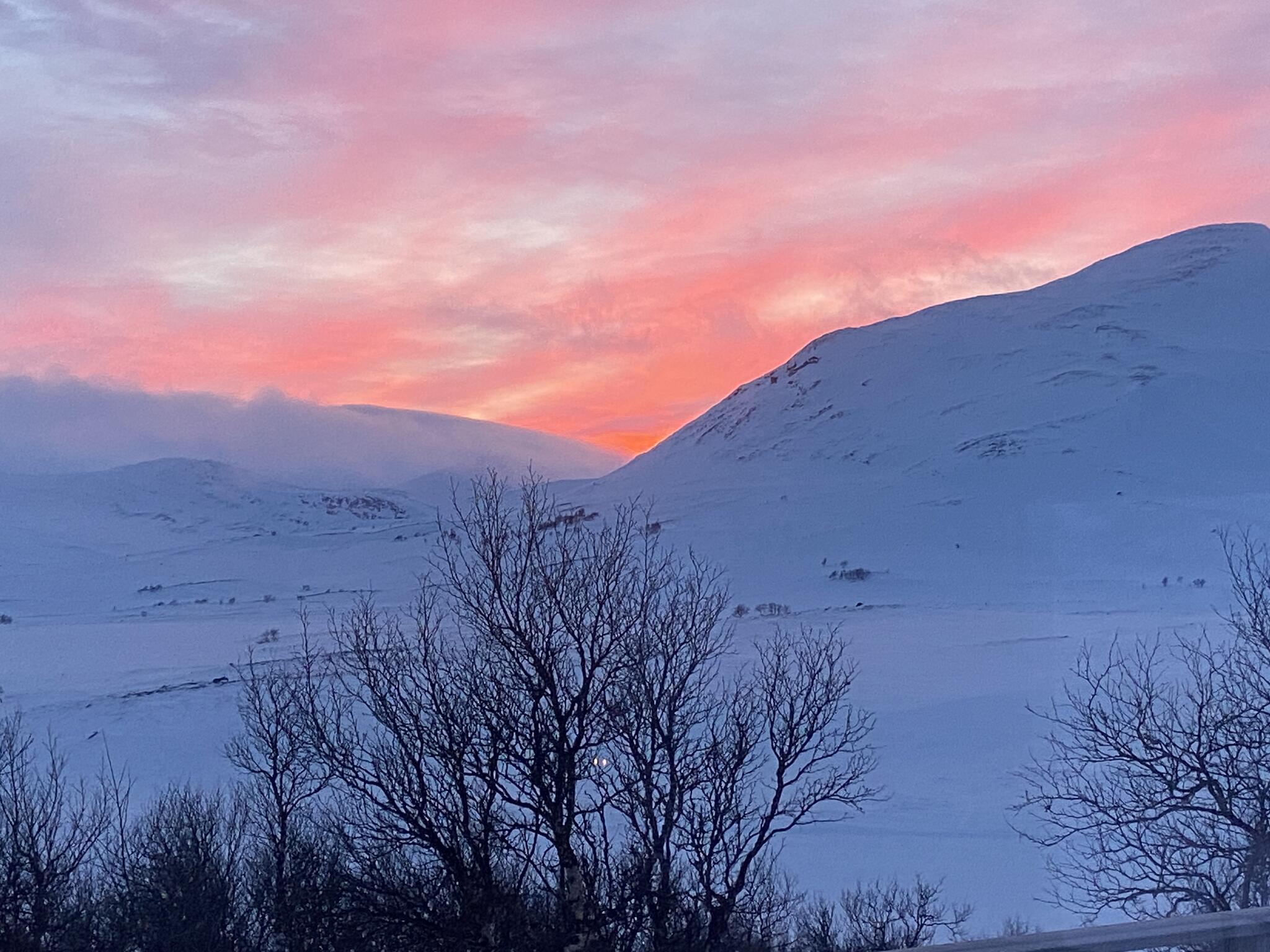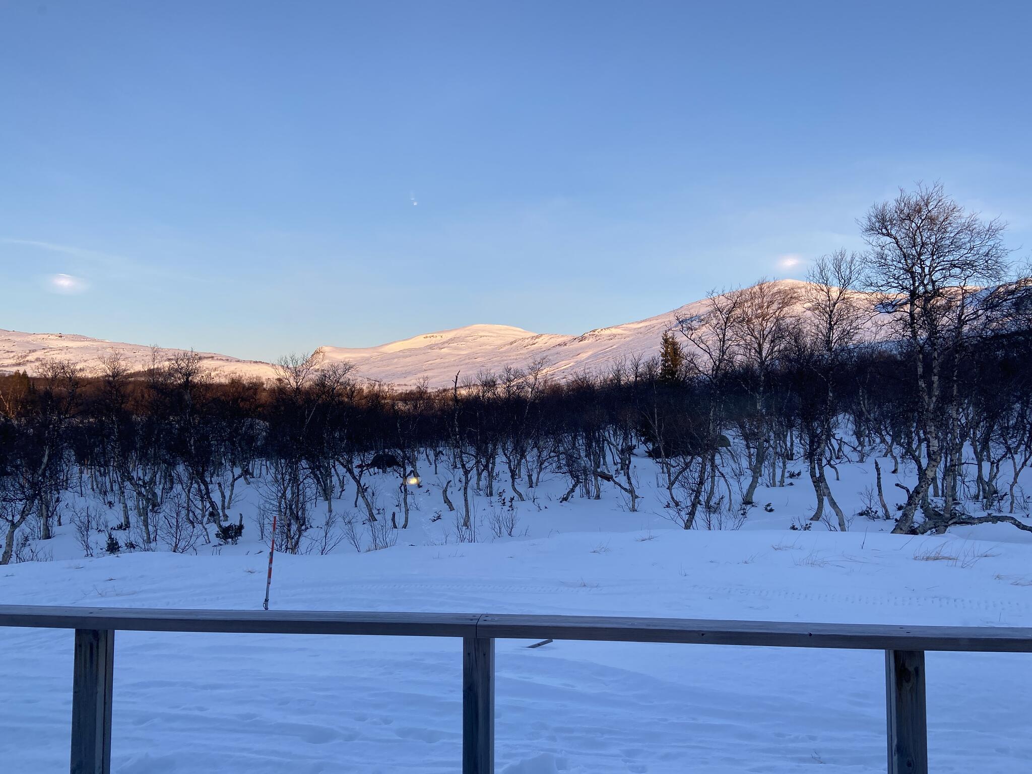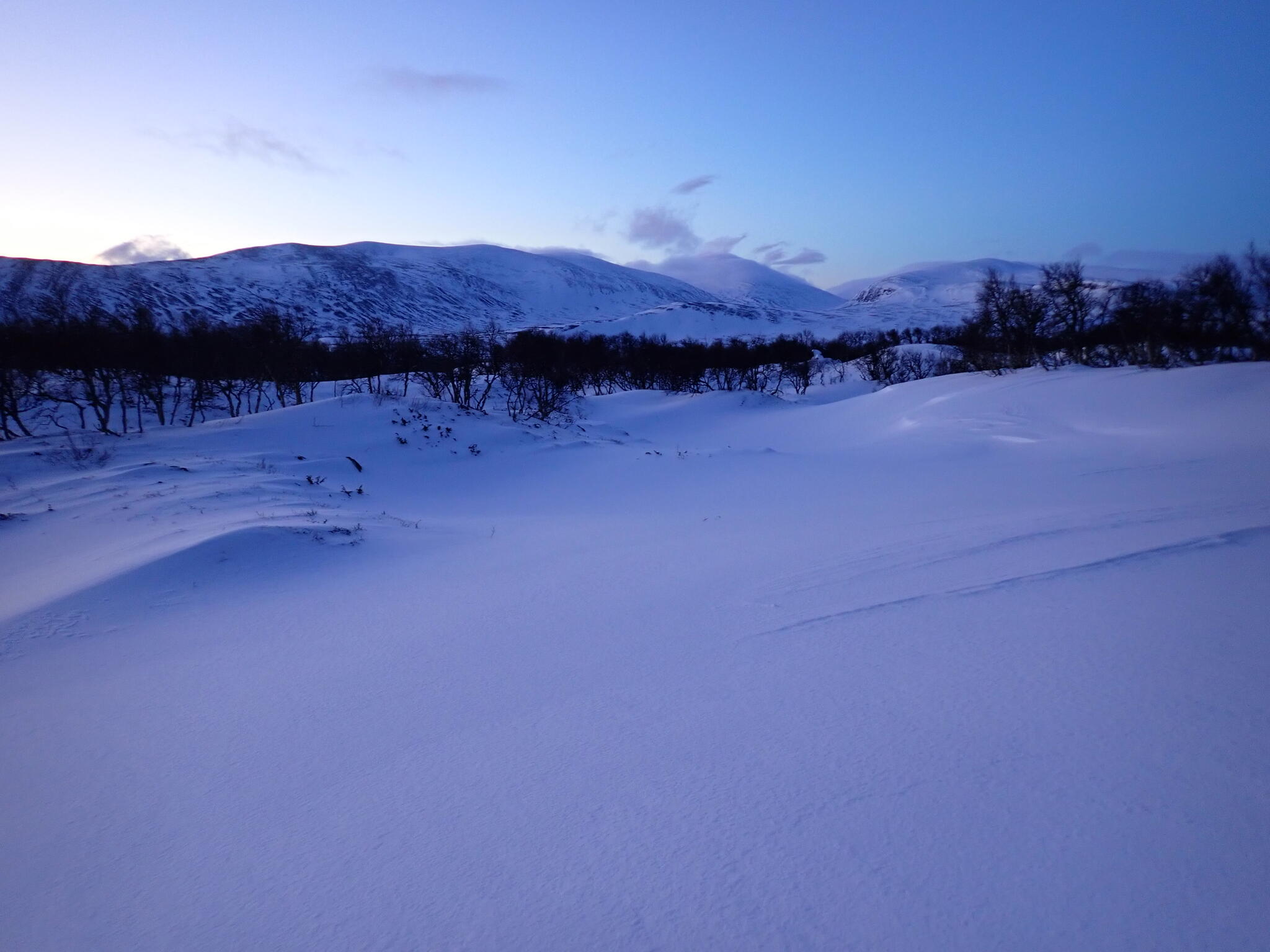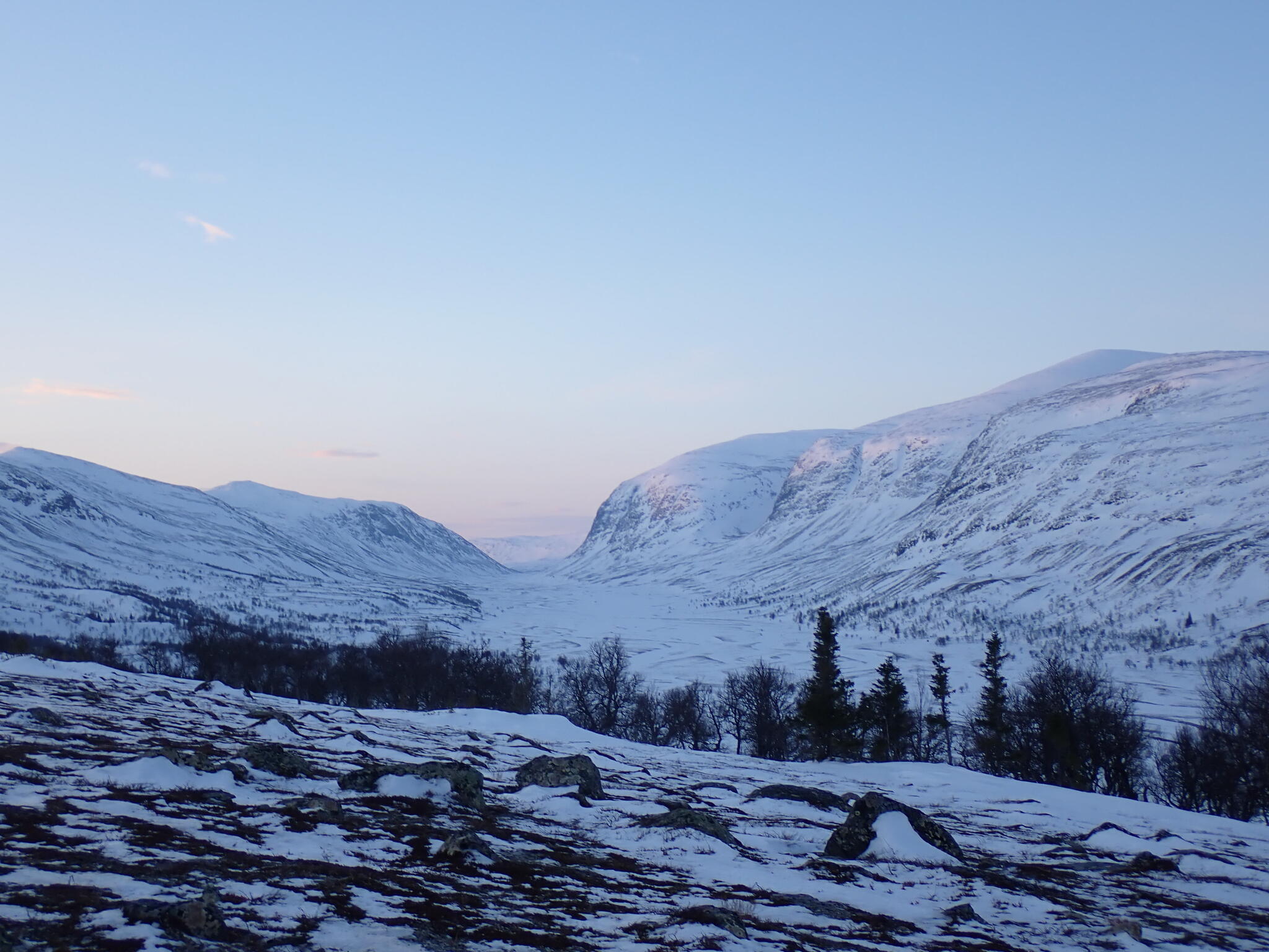 I gryningsljuset tog jag en lite egen skidtur mot Lunndörren så att jag fick fin sikt in mot den mäktiga dalen. Barnen sov under tiden.