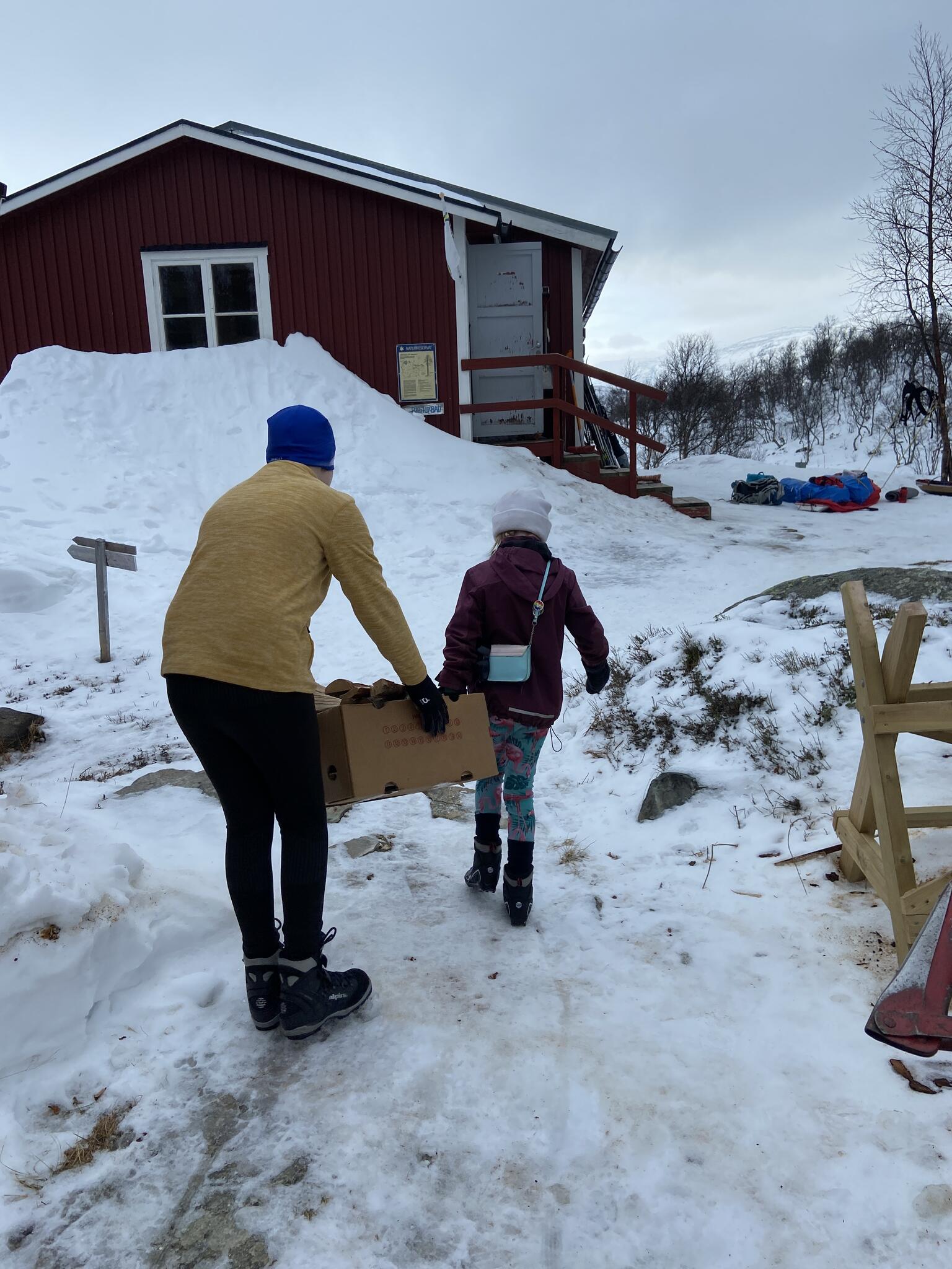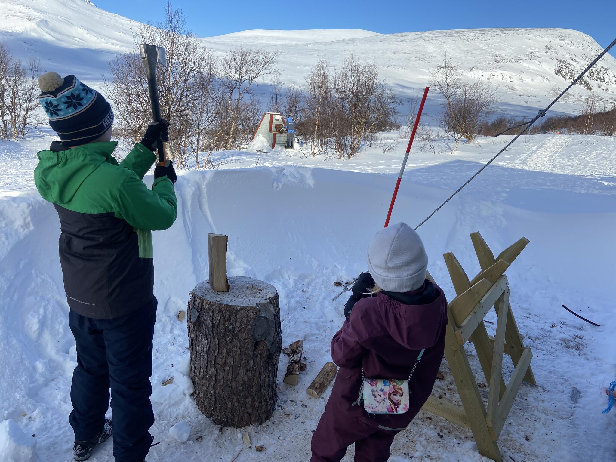Frukost, städa rummet och packa pulkan. Sedan dags att bidra med nyhuggen ved.