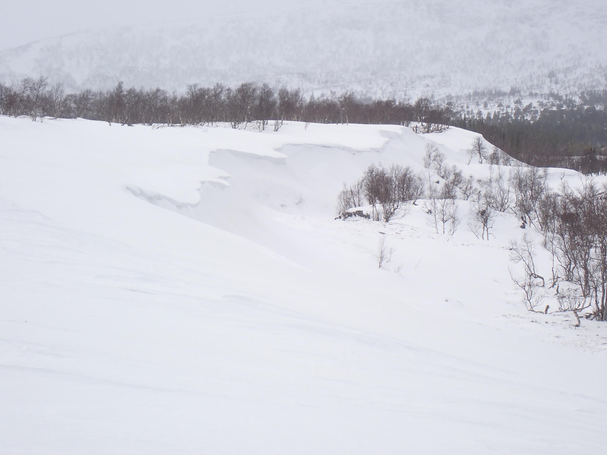 Ner från kullen i björkskogen var det riktigt kul åkning på hårda snödrivor mellan träden.