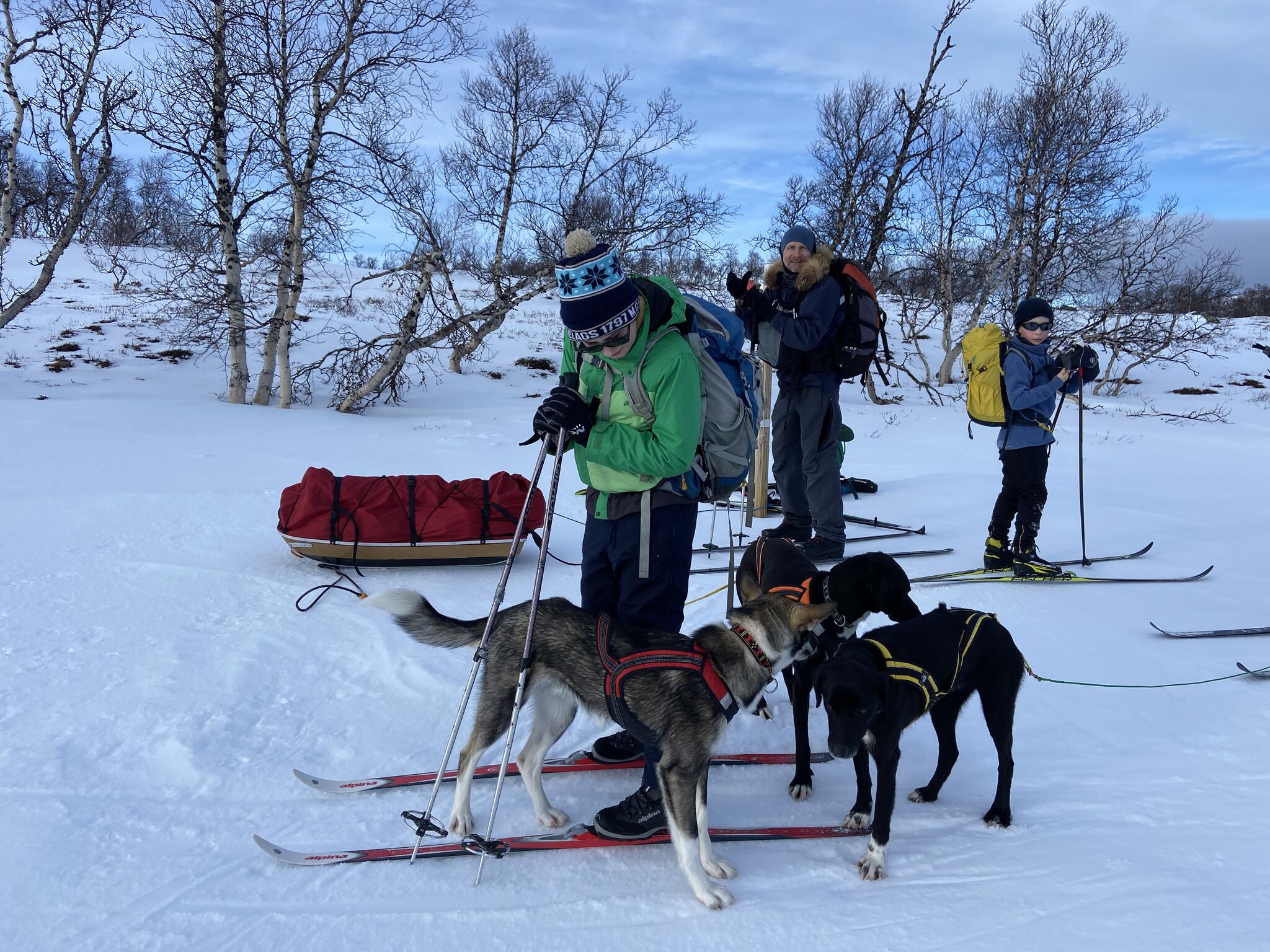 Leden förde oss till en smalare ravin där vi skulle skida uppför. Innan uppförsbacken fikade vi. Då kom familjen med hundar i fatt oss så vi fick en trevlig fikastund med dem. Sedan bar det uppför backen. Det var den brantaste uppförsbacken vi hade på hela turen.