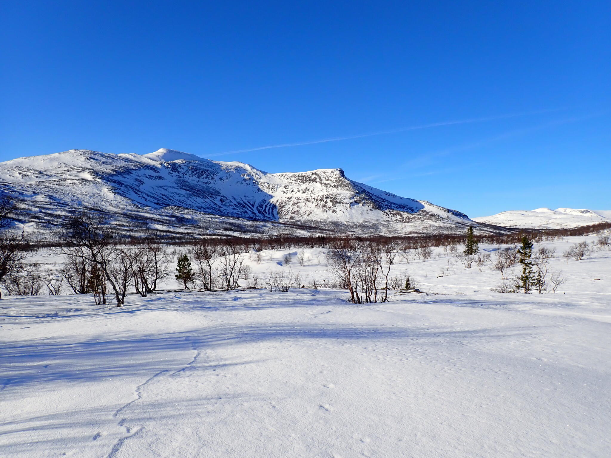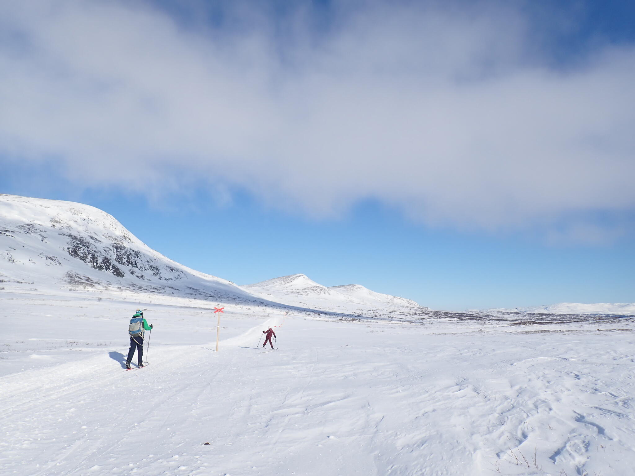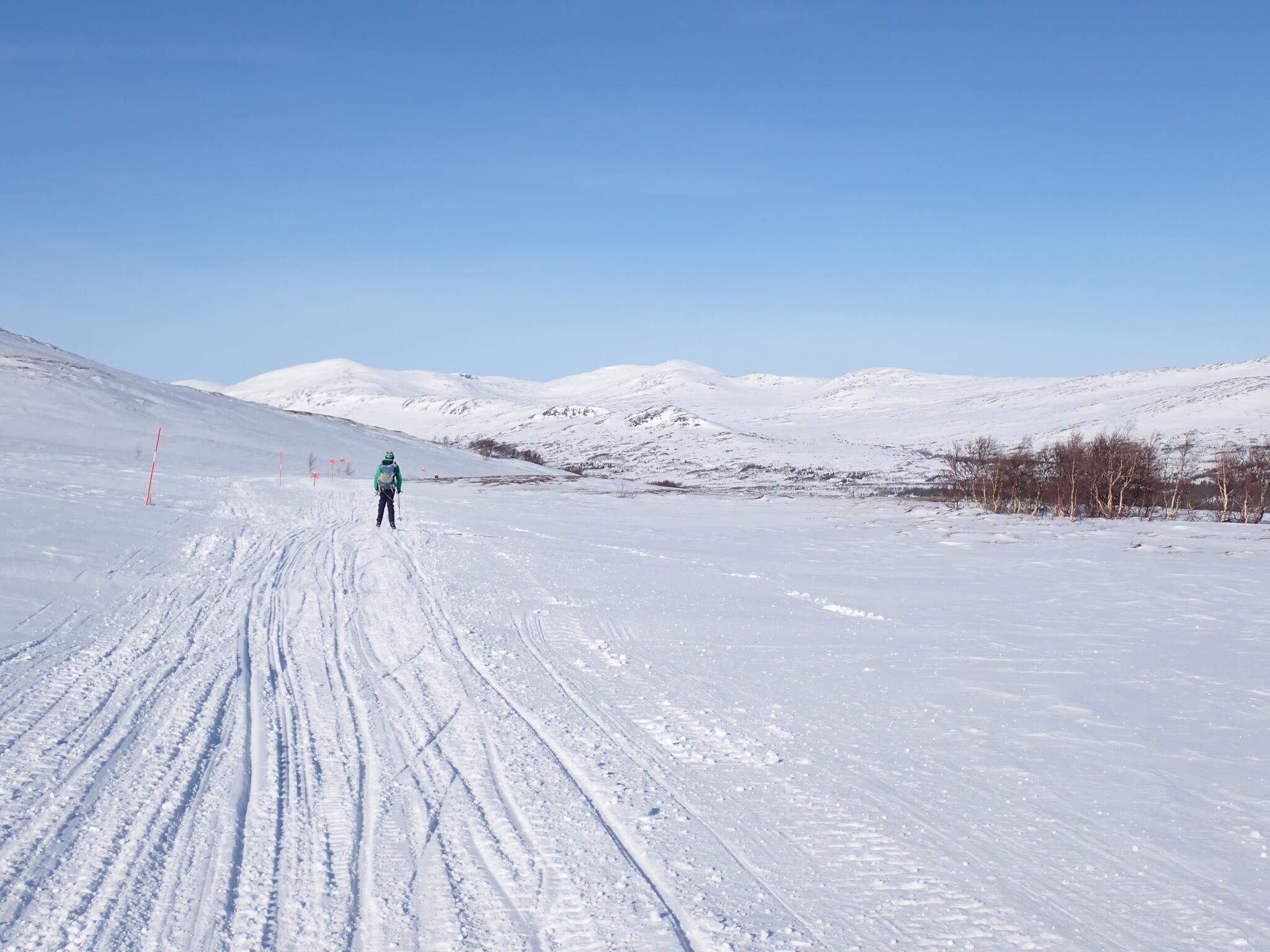 Hur som, vi skidade på leden i medvind på hårt underlag i lätt nerförsbacke så det kändes väldigt trevligt. Vi hade fjällen Smällhögarna på vår vänstra sida. Då och då brummade det förbi enstaka eller många skotrar (skotersafari?).