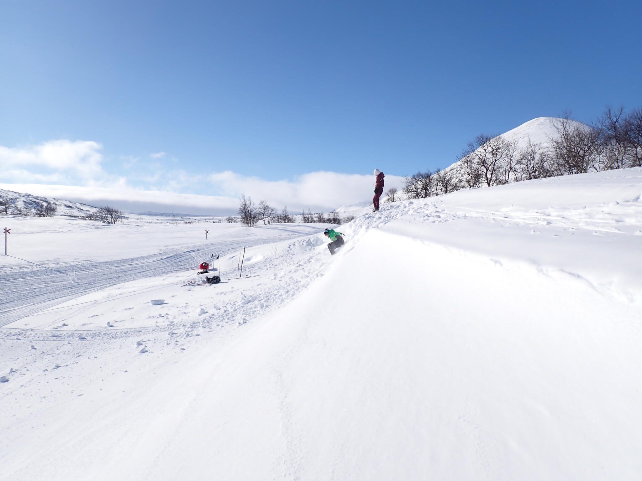 En nerförsbacke var rätt läskig: smalt isigt, slingrande och guppigt skoterspår som lutade på en hel del. Backen fortsatte rätt länge och jag var osäker på om jag skulle kunna stå upp. Men till både min och barnen förvåning klarade jag det.