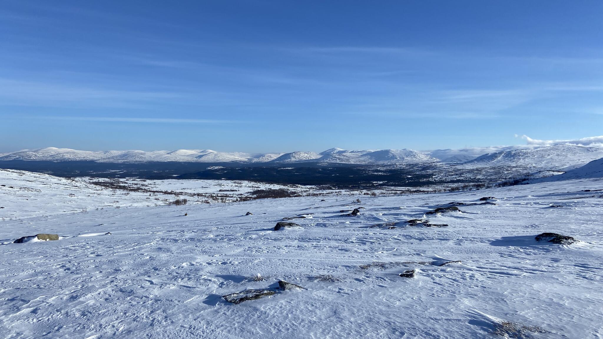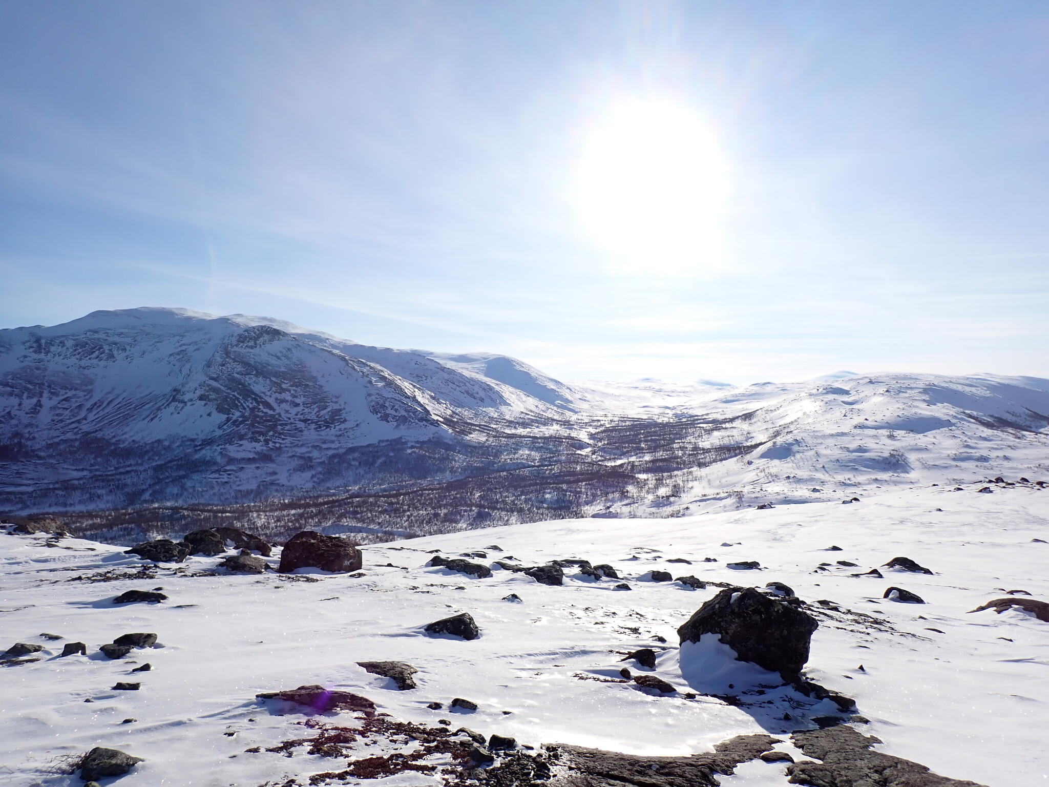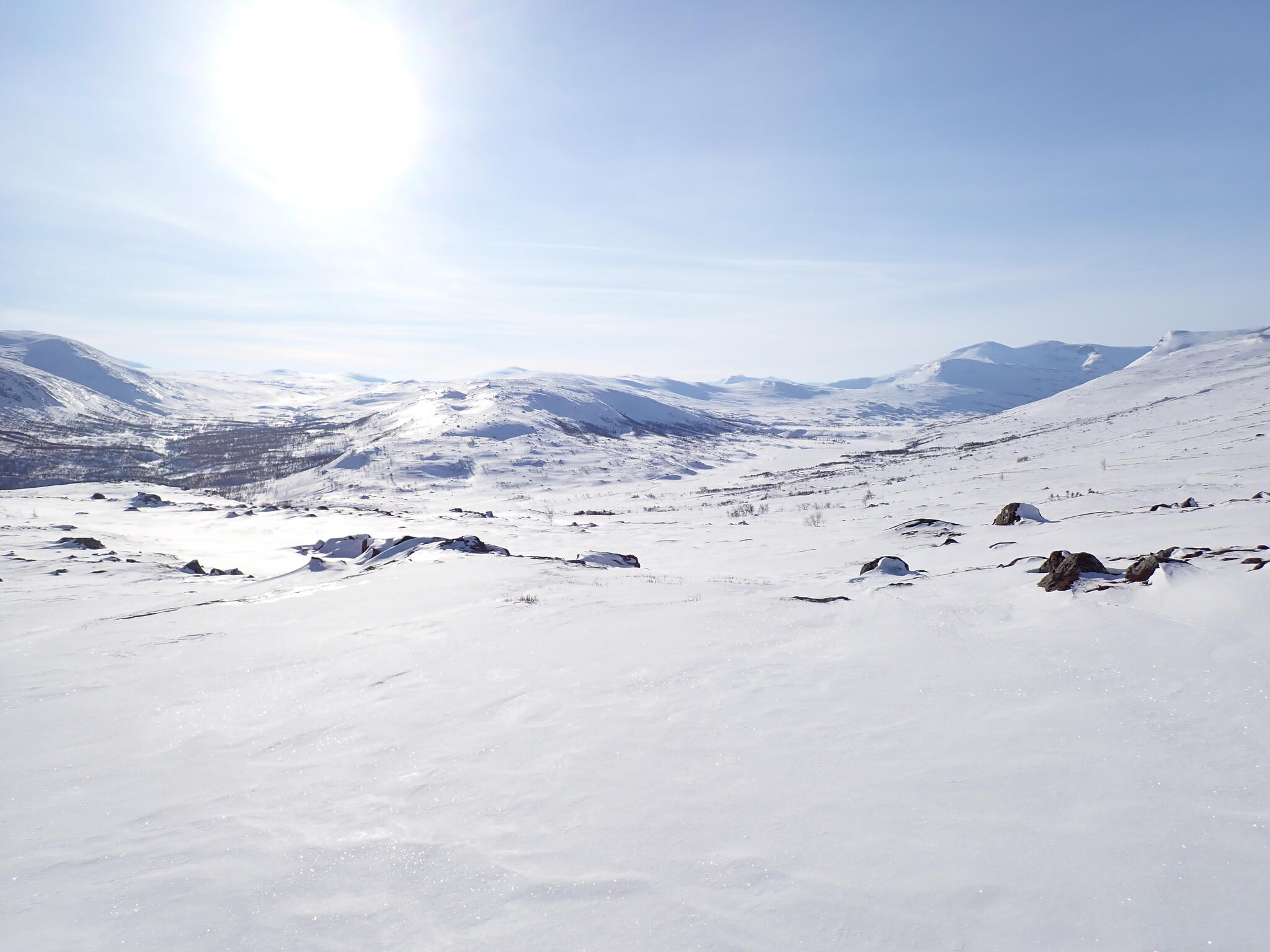 Jag skidade över bergsryggen mot Tvärån och sedan ner i den dalen. Fantastisk utsikt åt sydöst mot Anarisfjällen.