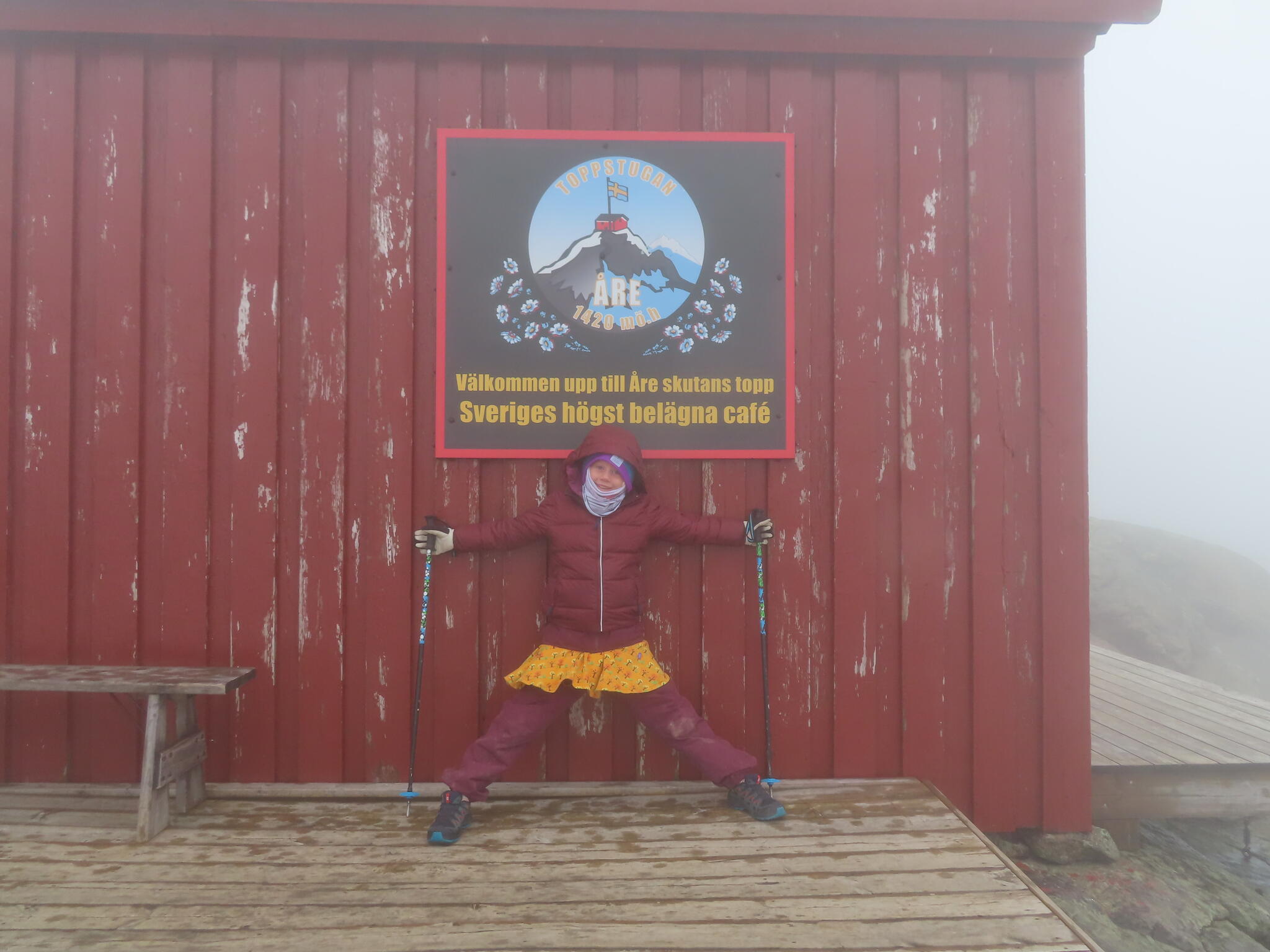 Vi tog kabinbana upp i dimman. Från kabinbanans toppstation gick vi den branta leden upp till toppstugan, som även är Sveriges högst belägna café.