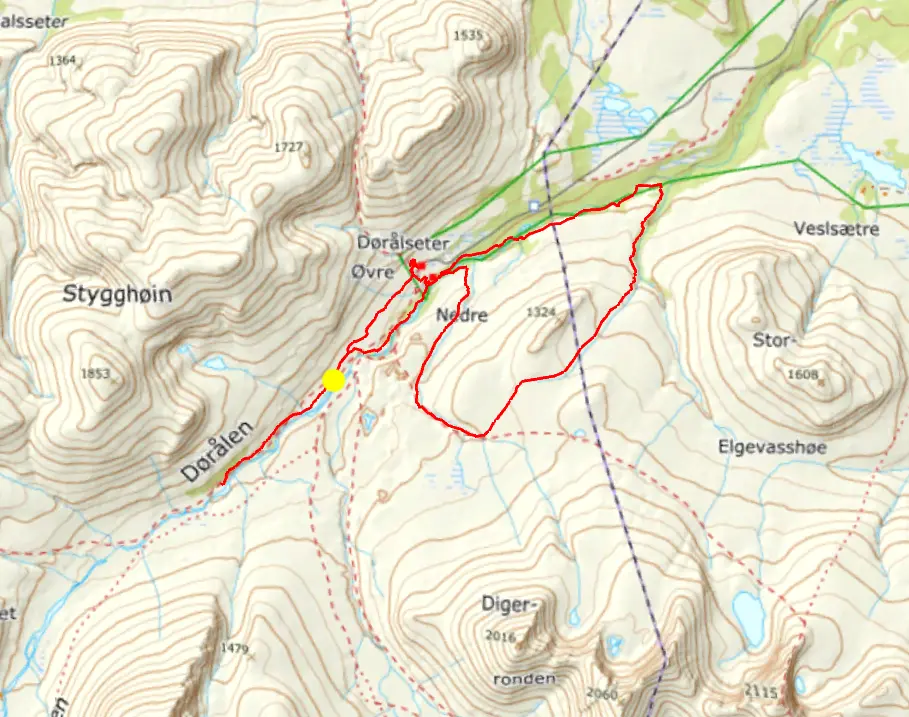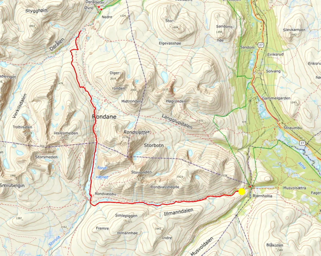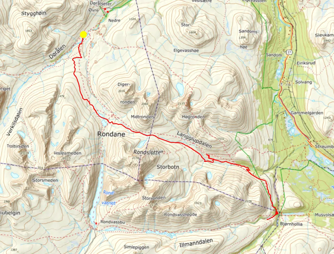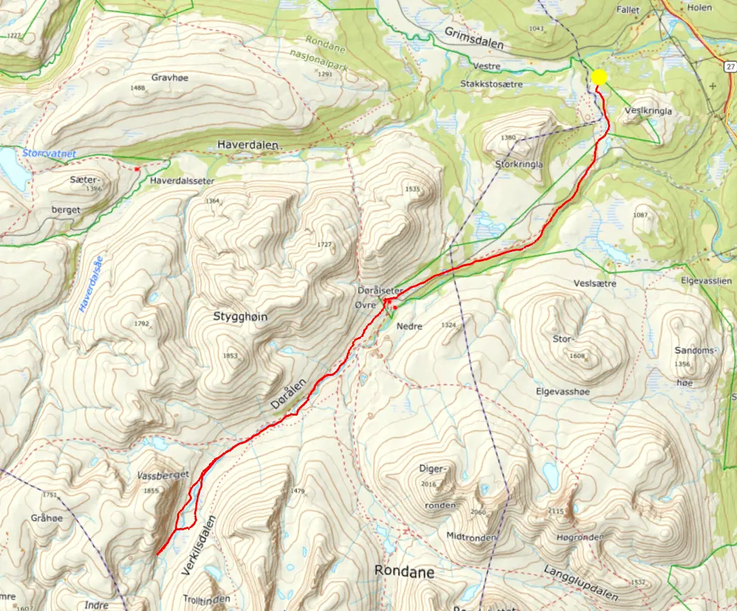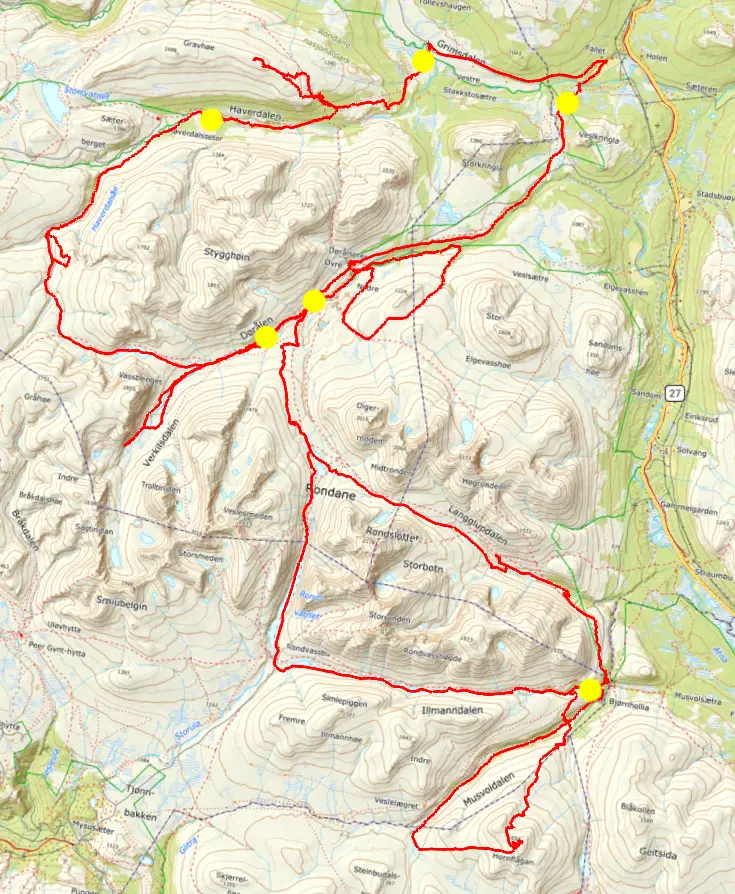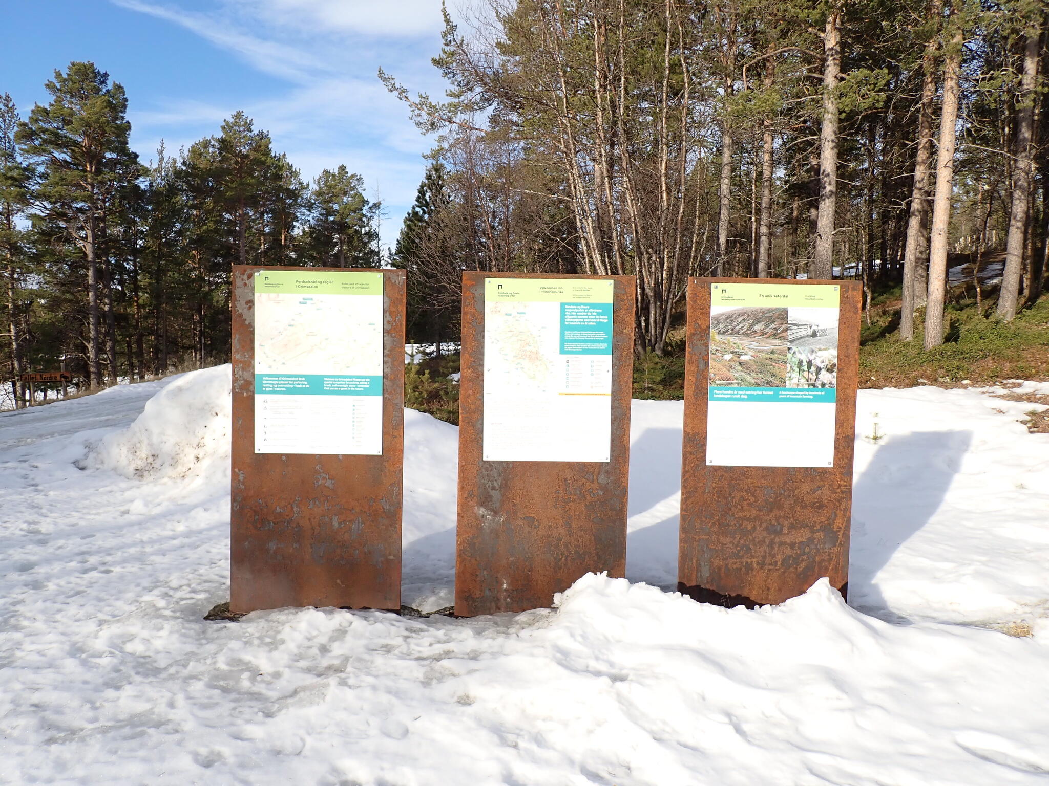 För denna påsktur hade vi fram till dagarna innan planer på en tur i Dovrefjäll nationalpark. Väderprognosen visade på hård vind de första turdagarna så vi planerade om till det närliggande Rondane nationalpark. Start och slut på turen blev en parkering i byn Fallet i östra änden på vägen in i Grimsdalen, nära Folldal.