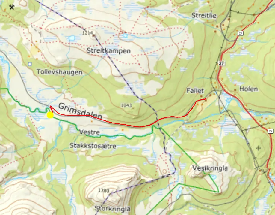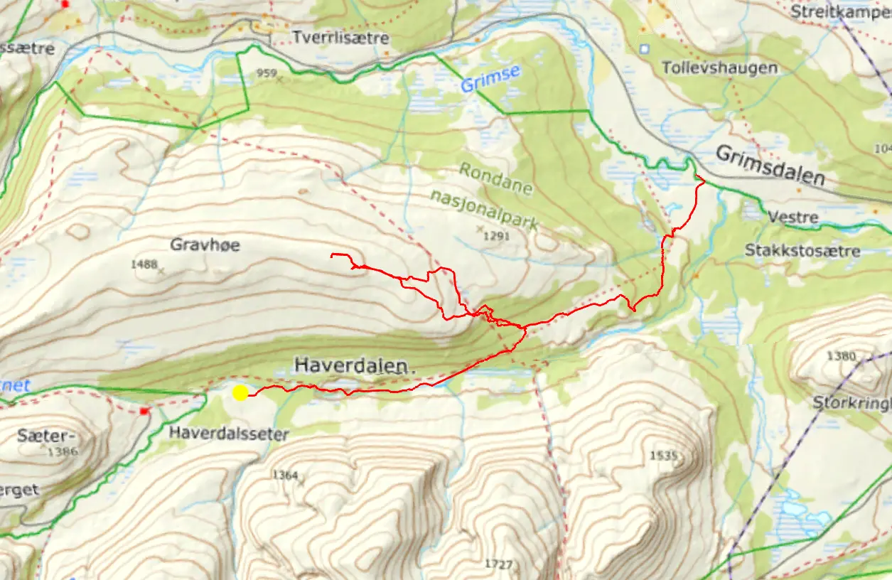 Det blev uppenbart att vi behövde byta dal till en som var mindre öppen, så att skugga skulle kunna ha sparat mer snö. Och söderut ville vi då vi sett på snödjupskartan atgt åt det hållet skulle det finnas mer snö. Vi siktade in oss på den lite mindre Haverdalen. Vi behövde korsa ån Grimse som går igenom hela Grimsdalen.