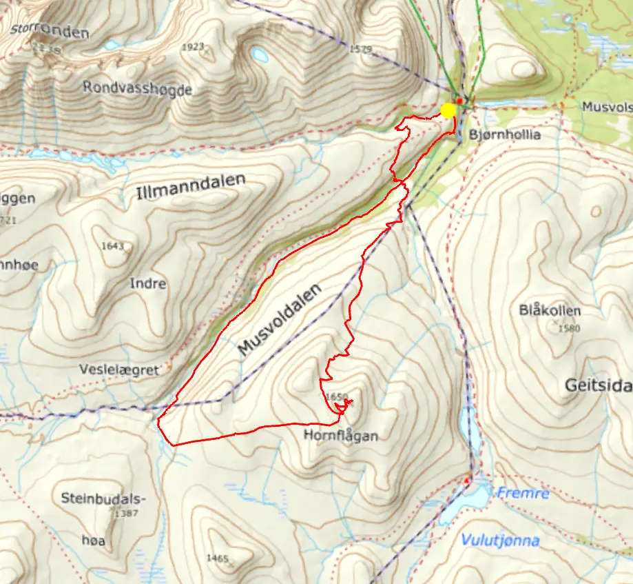 I detta område i Rondane var det relativt mycket snö. Vi kunde se att det var snö uppe på Hornflågan och vi blev sugna på att skida upp på fjället.