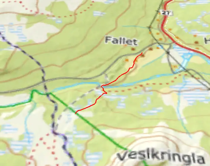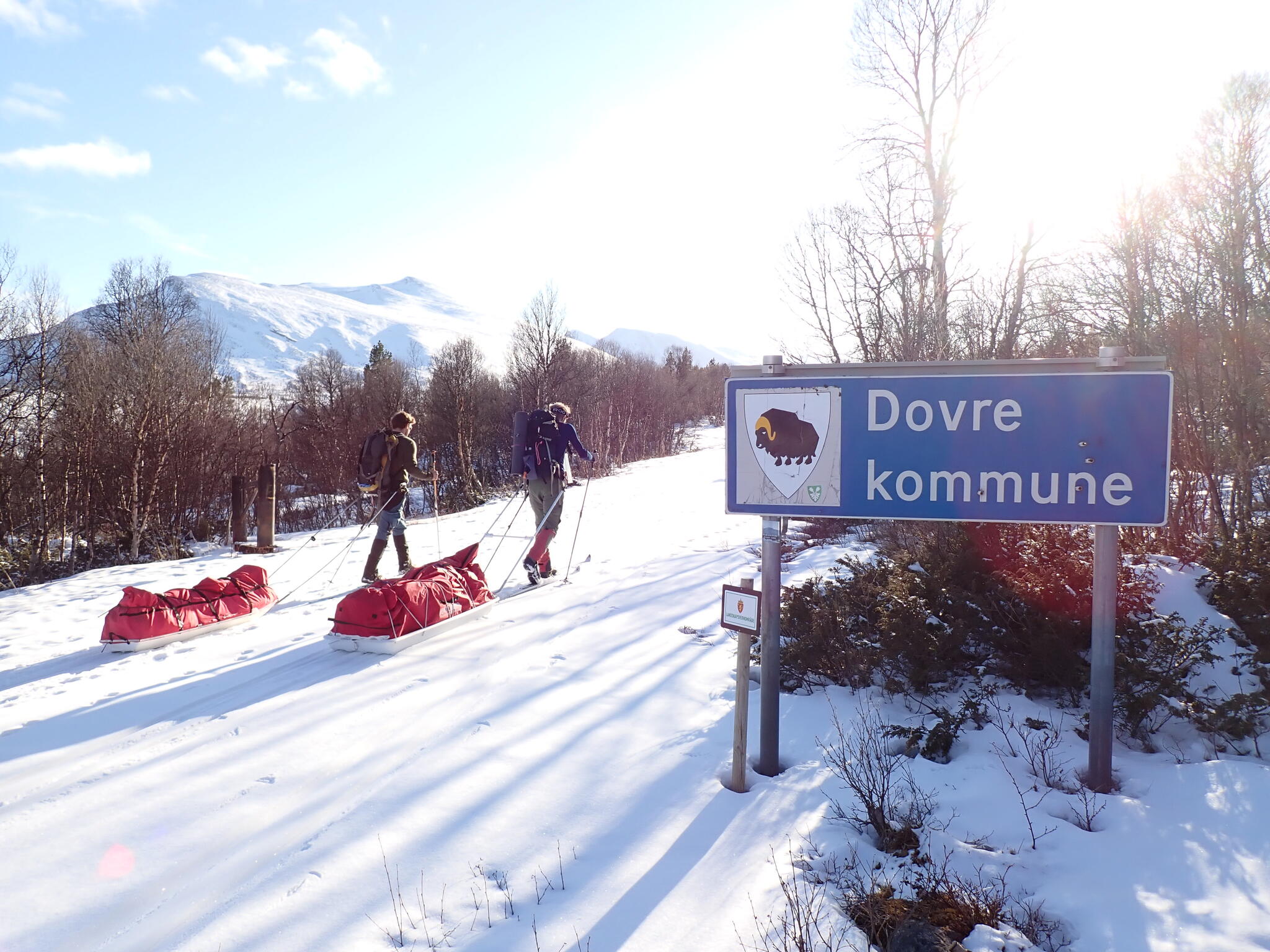 Vi hade inför turen ganska noggrannt granskat snödjupskartor över området och det såg ut som att det skulle finnas tillräckligt med snö. Men när vi närmade oss startplatsen för turen blev vi oroliga. Knappt någon snö i Folldal. Och i byn Fallet såg det endast lite bättre ut. Över lag känns det som att snödjupskartorna har överdrivit snödjupet. Men vi tog oss fram, tog med en hel del nya repor på både pulkor och skidor.