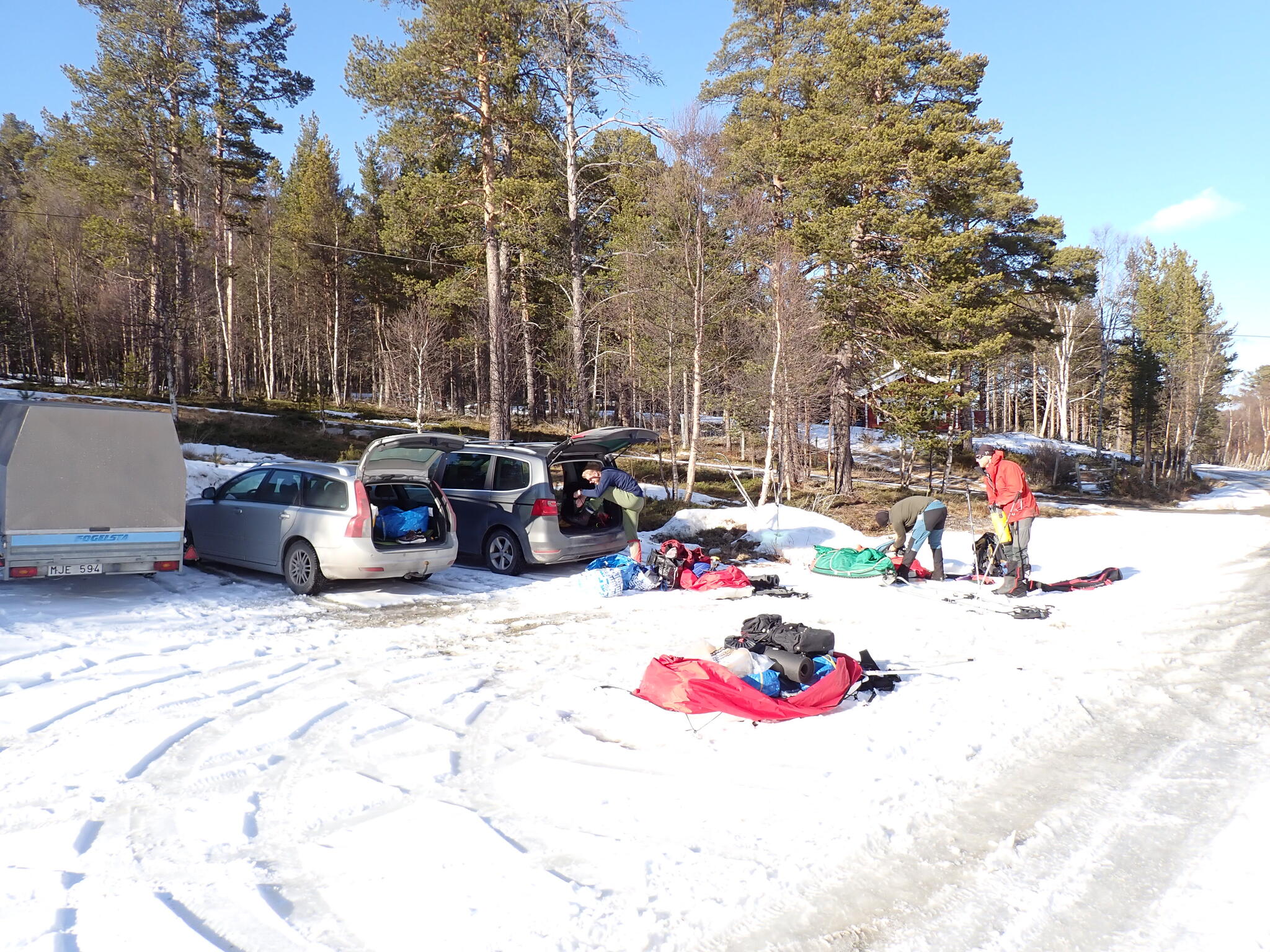 Vår turkompis Björn mötte vi vid avtagsvägen mot Grimsdalen. Vi diskuterade om vi skulle börja skida i detta område eller om vi skulle byta. Men vi kom fram till att detta nog var bästa alternativet. Så vi körde någon km in på vägen och parkerade och packade pulkorna.