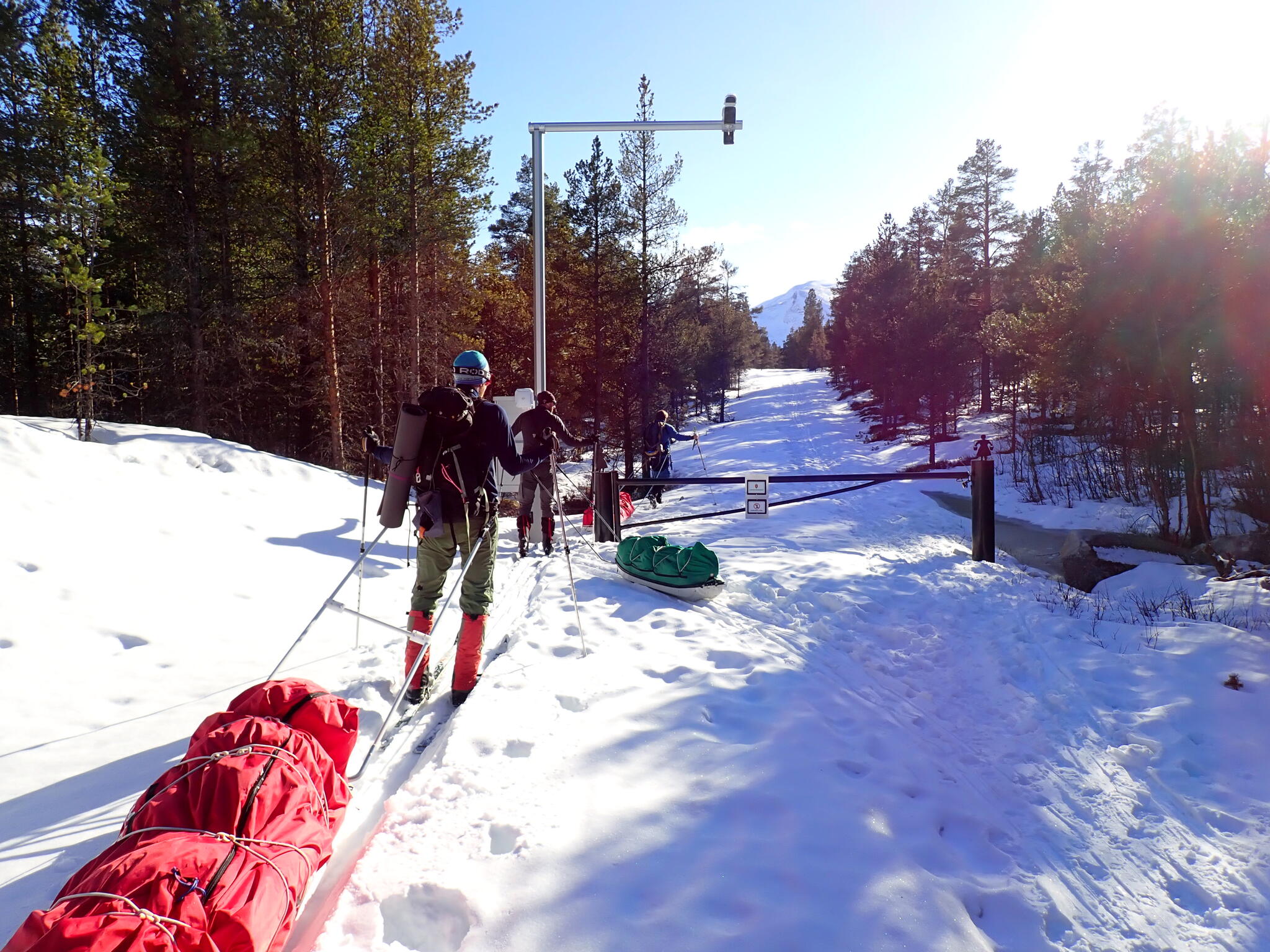 När Andreas återvände från stationen berättade han om en utmanade passage vi skulle behöva passera till fjällstationen: igenom en trång skog och över en ås utan snö. Värden på fjällstationen hade också nämnt för honom att i Rondane borde man inte skida med pulka. Ja ja nu var vi här med pulkor och denna passage behövde vi passera.