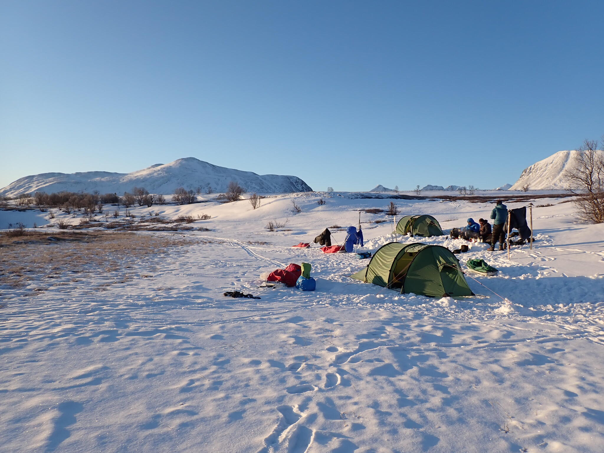 När vi kom fram till tälten noterade vi att ingen hade passerat tälten under dagen. Vi hade fortfarande inte sett någon annan skidåkare under turen. Det kändes lite konstigt.