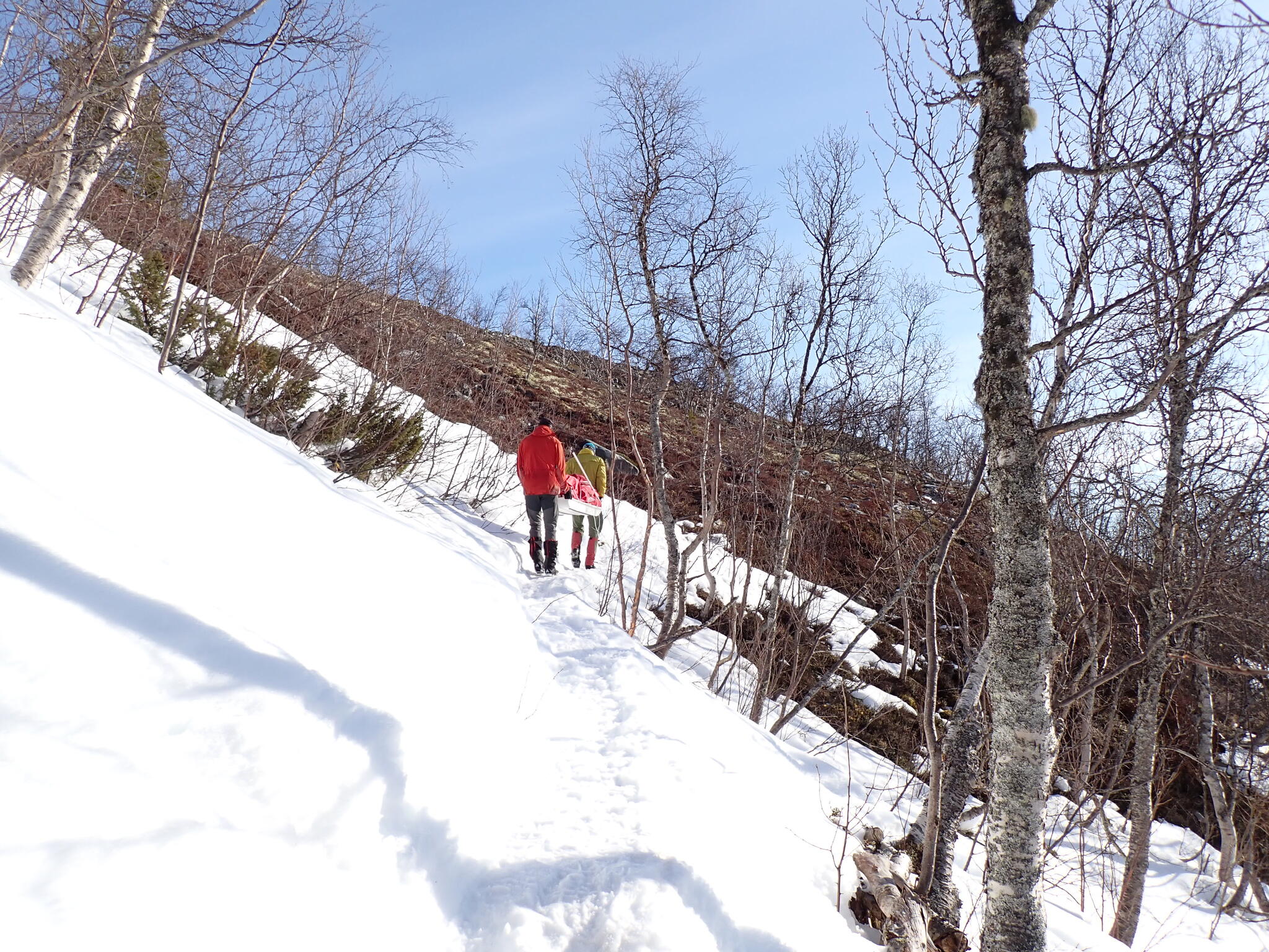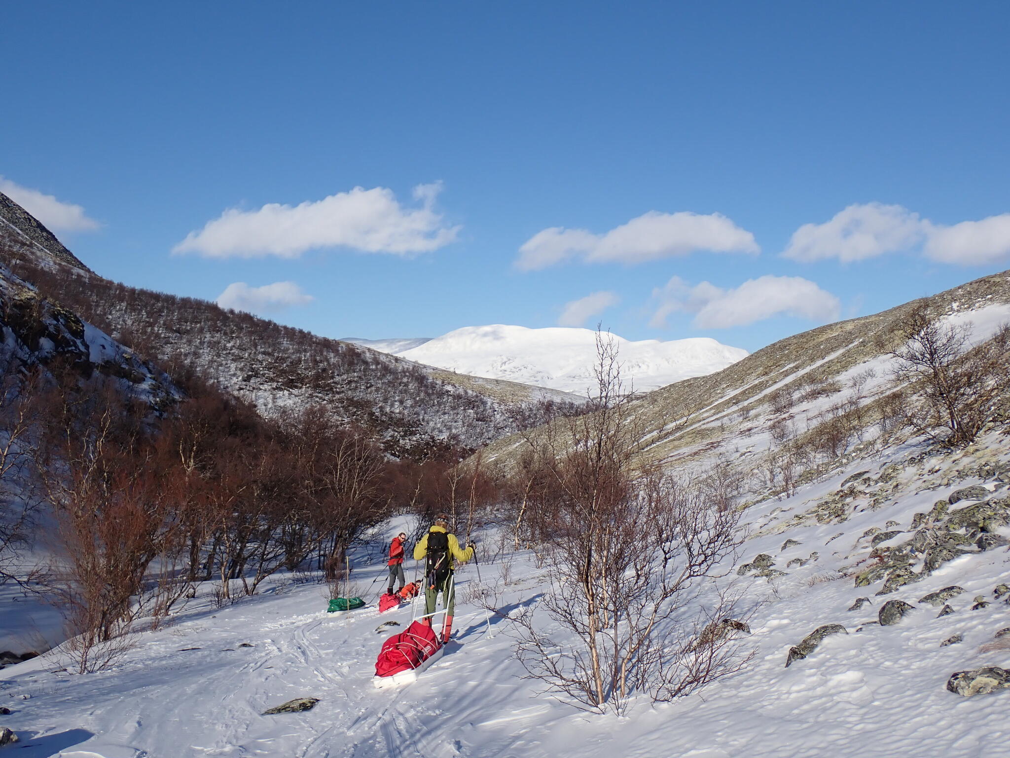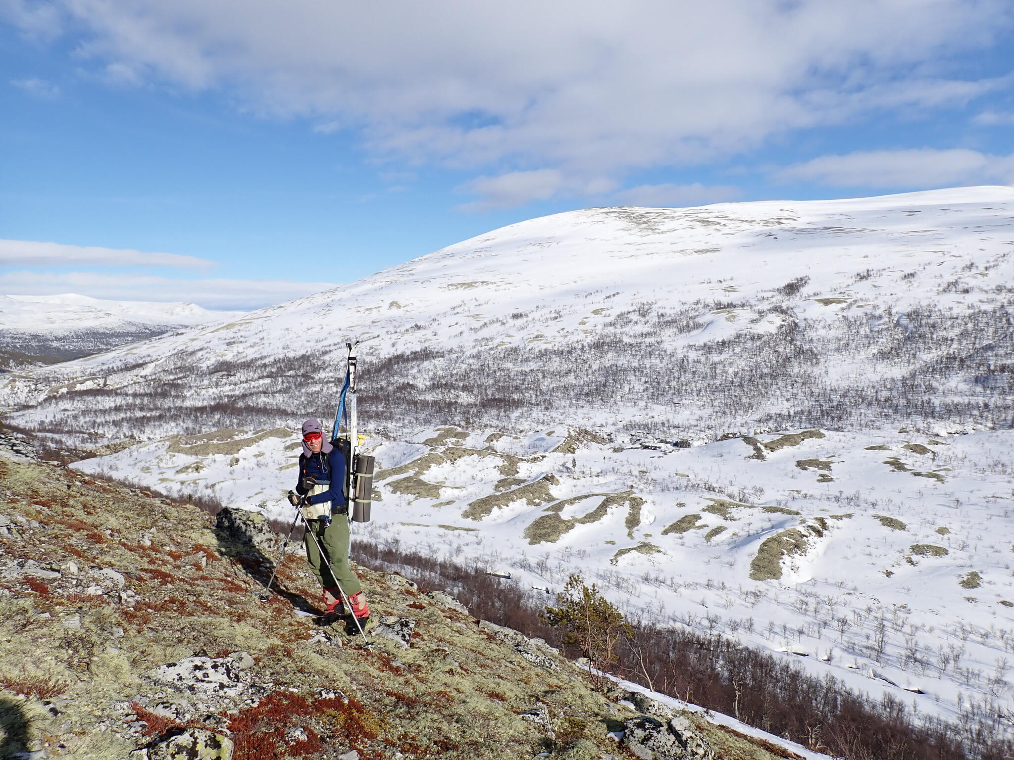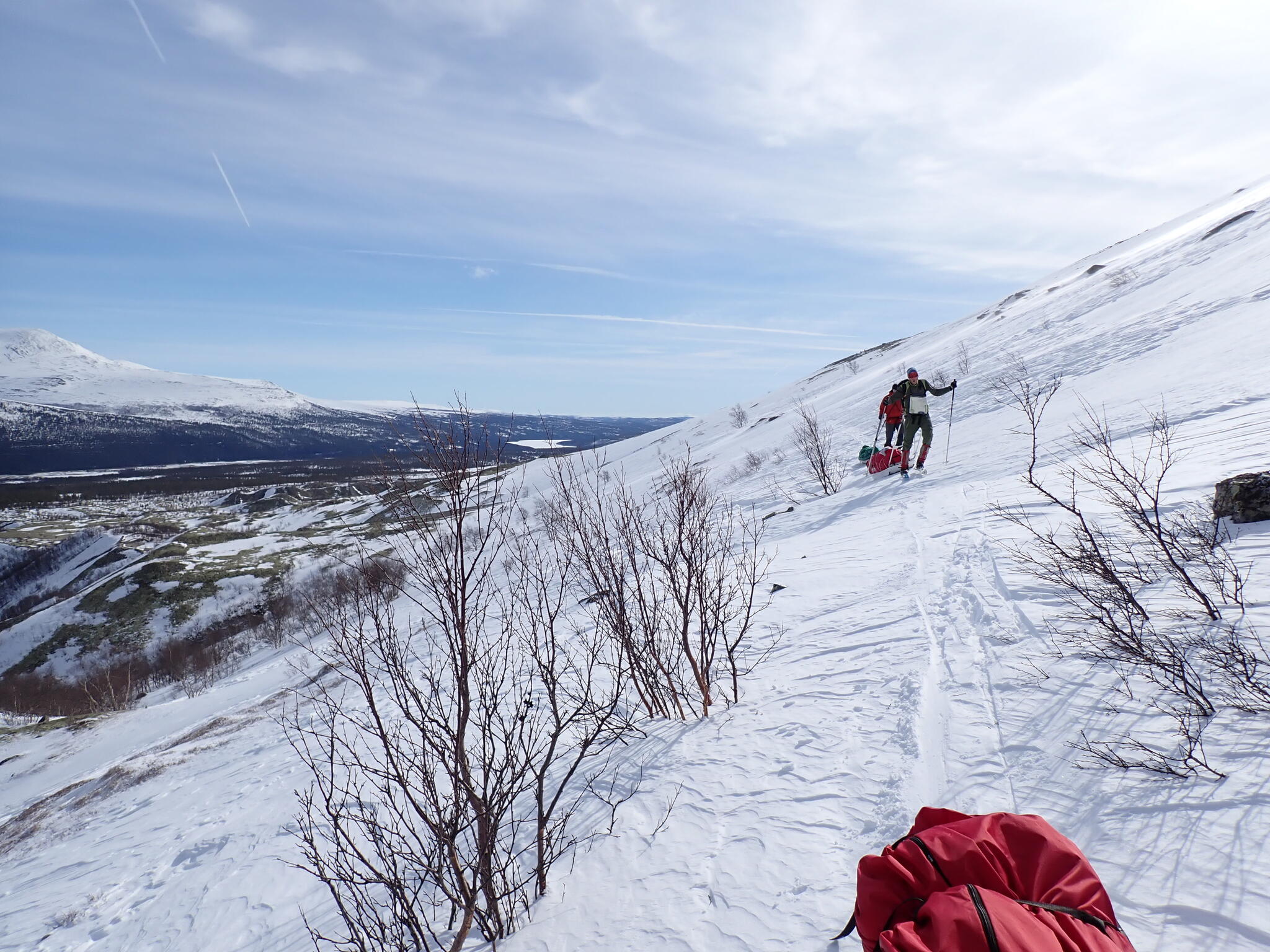 Vi behövde skida upp en lite rygg för att komma in i dalen. Det blev zickzackande upp genom björkskog och när vi kom högre på snösträngar Jättedåligt med snö. Skidor och pulka fick många skrapmärken från stenar denna dag.