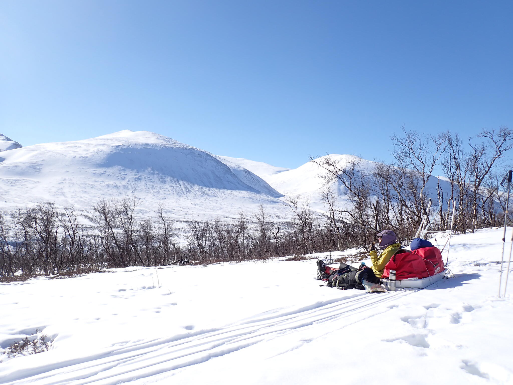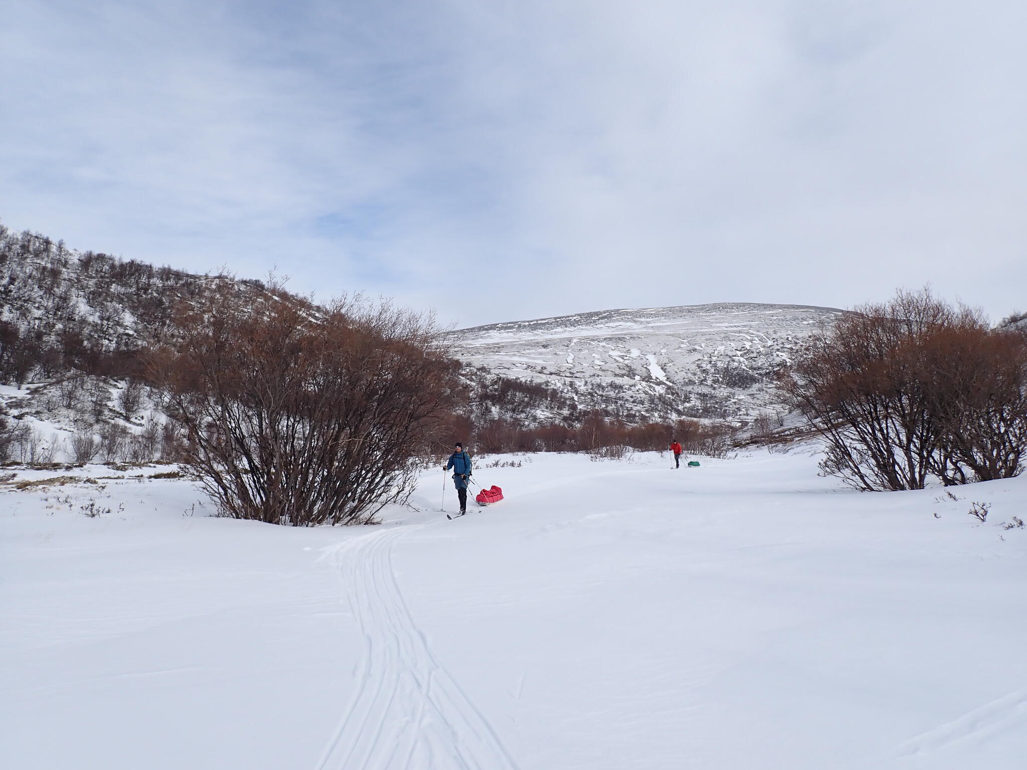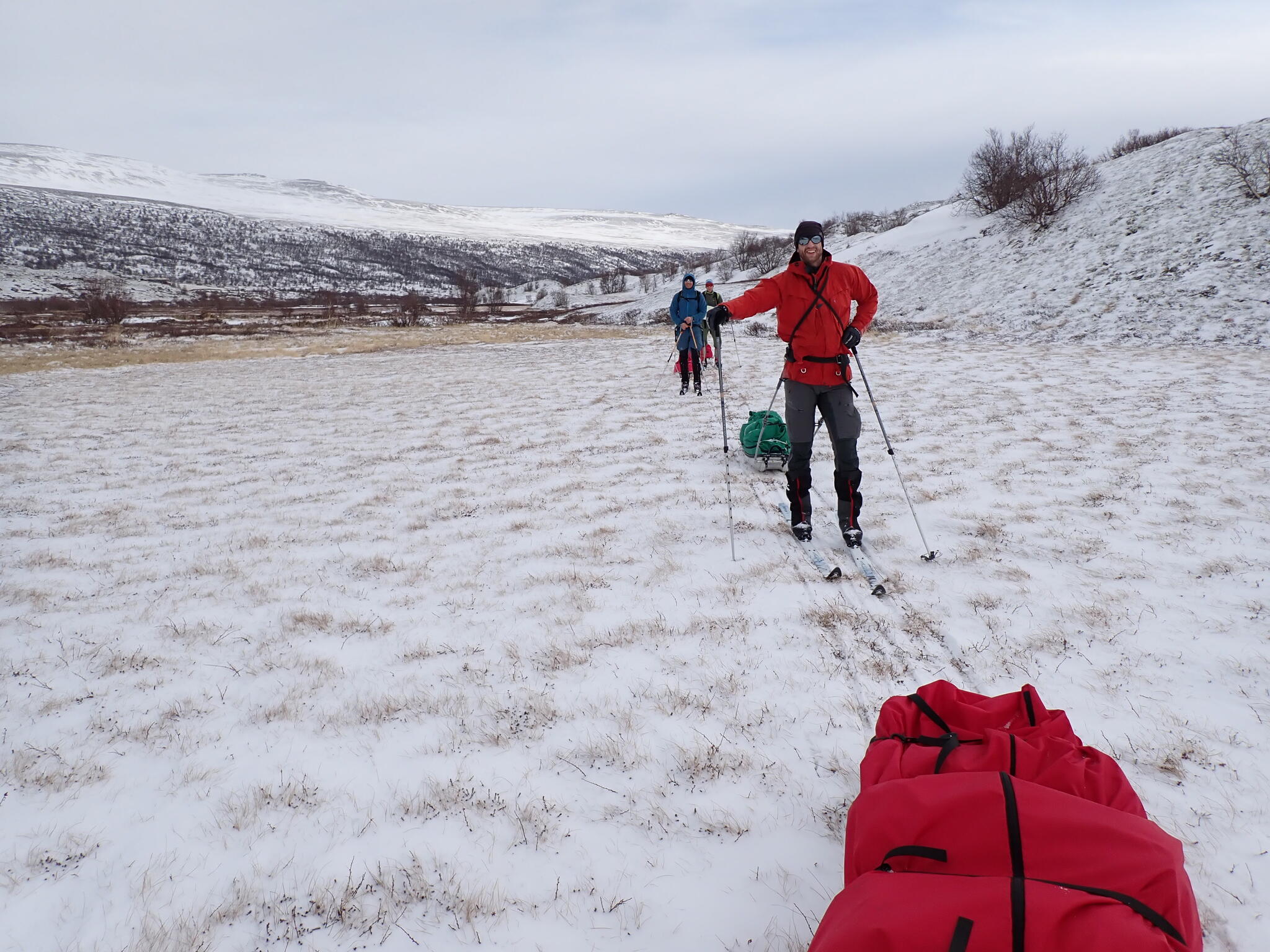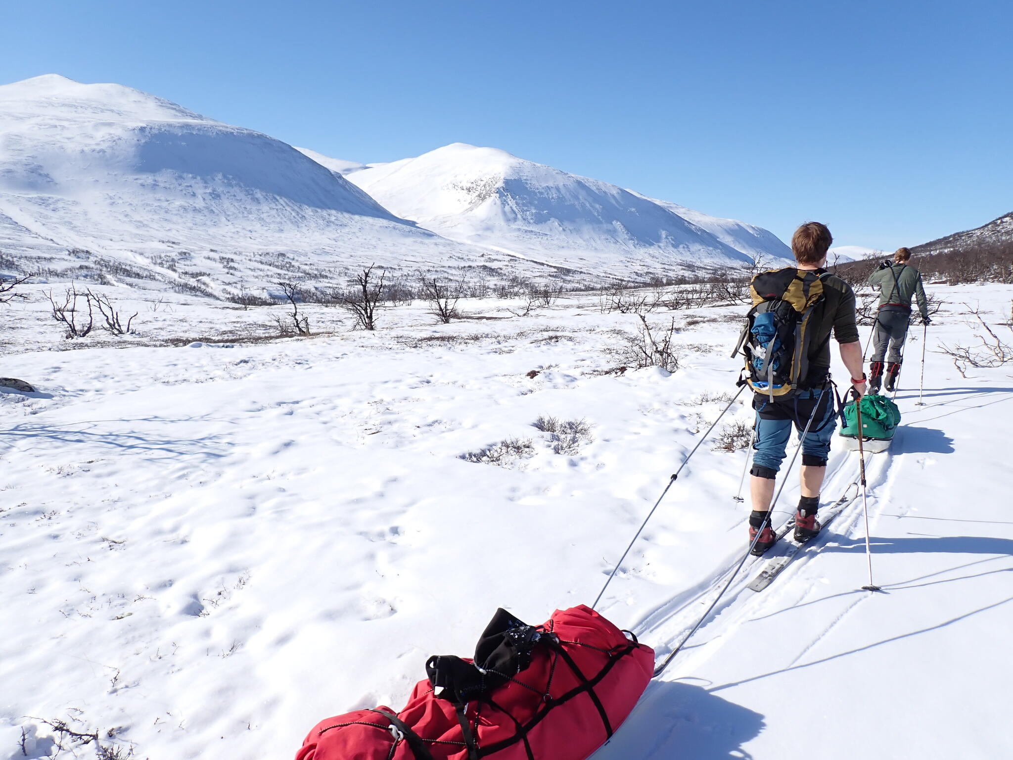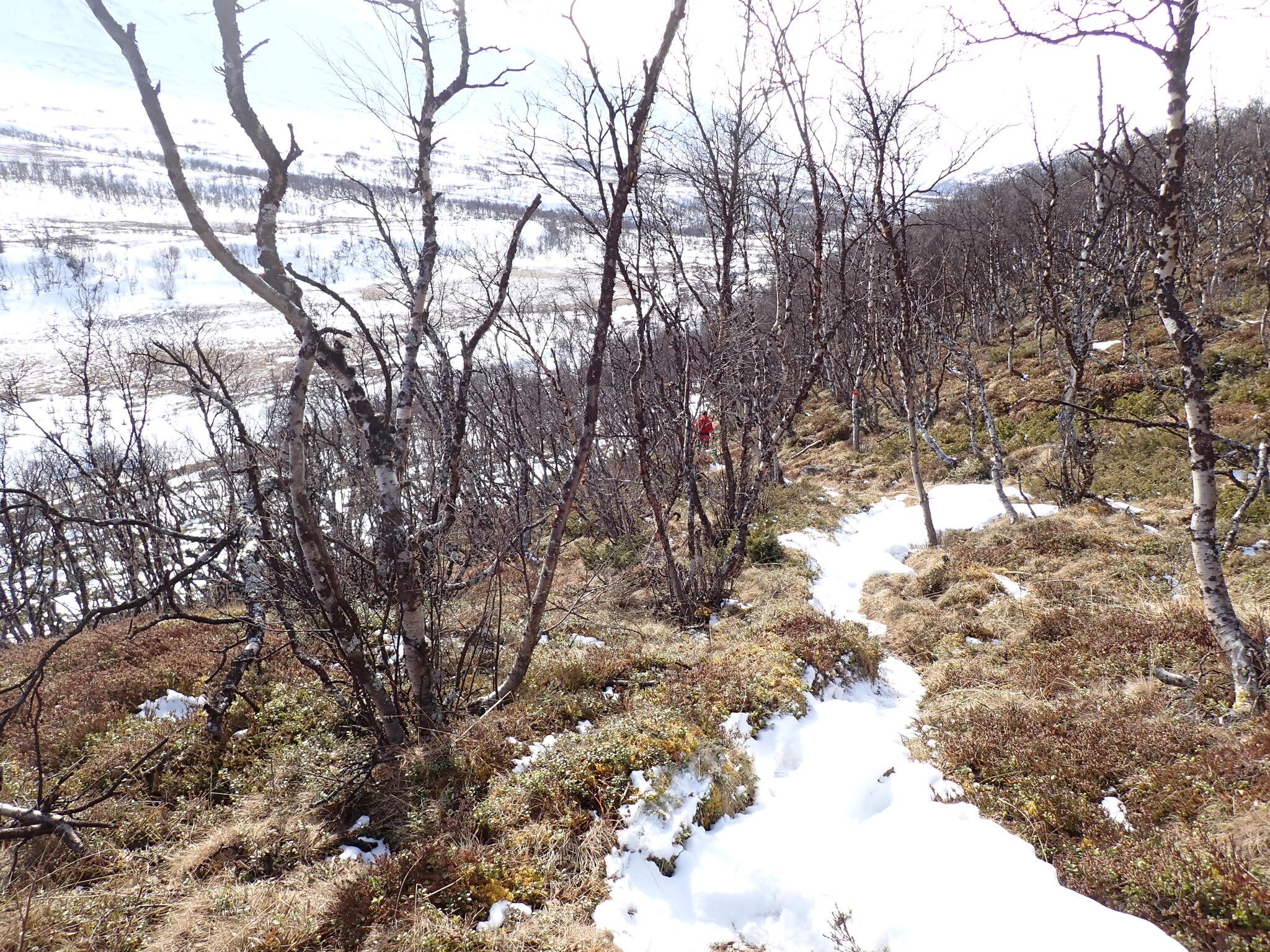 Vi behövde skida upp en lite rygg för att komma in i dalen. Det blev zickzackande upp genom björkskog och när vi kom högre på snösträngar Jättedåligt med snö. Skidor och pulka fick många skrapmärken från stenar denna dag.