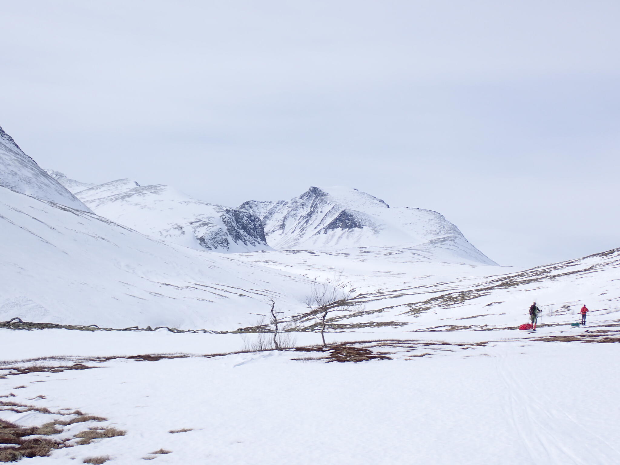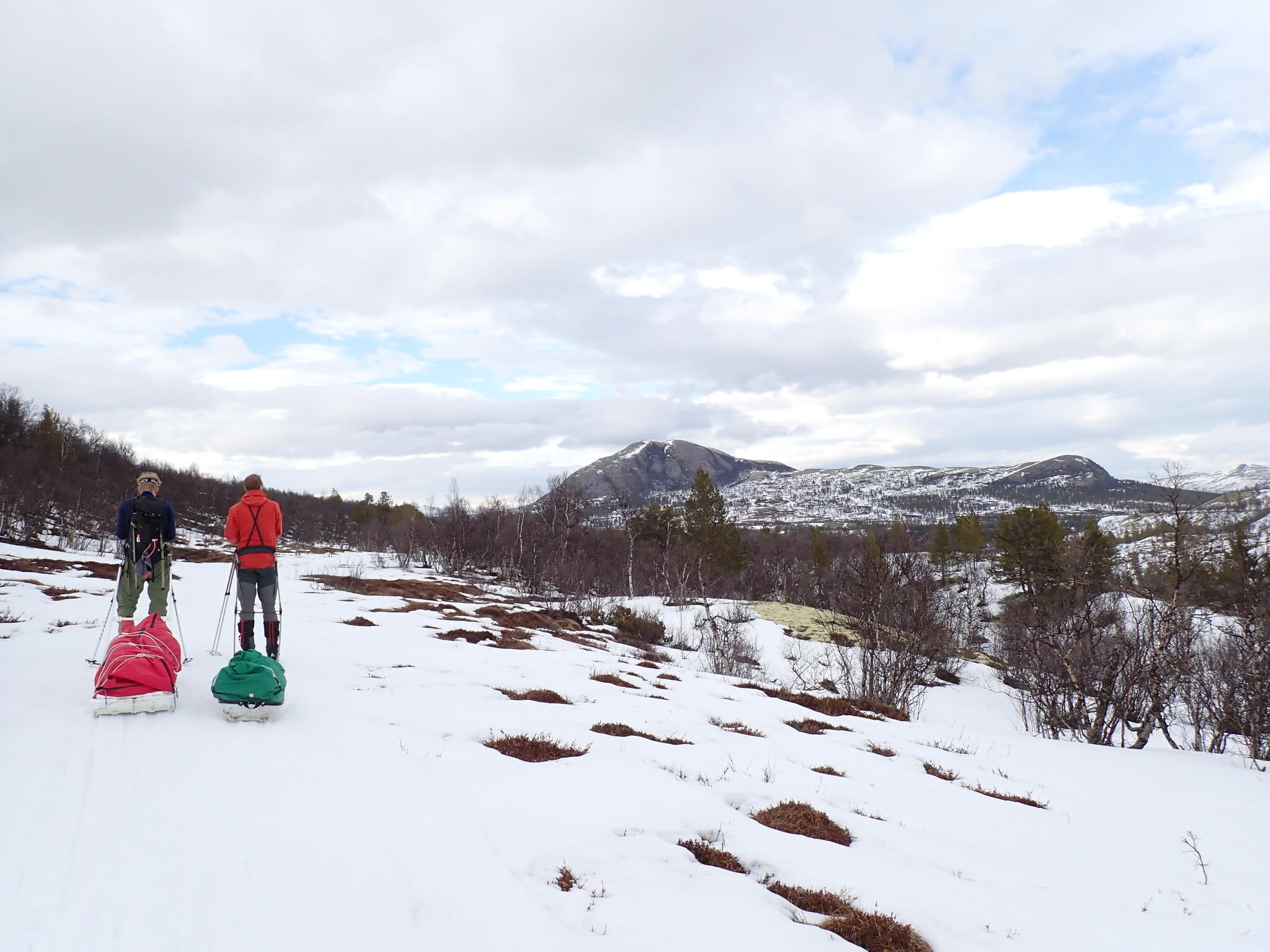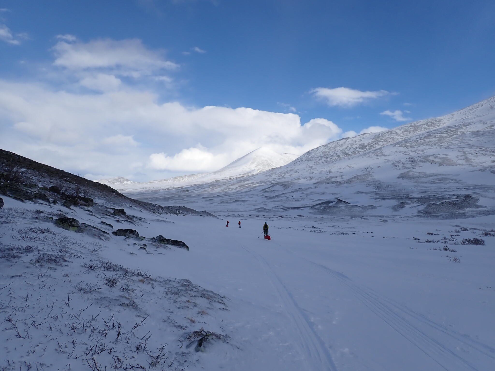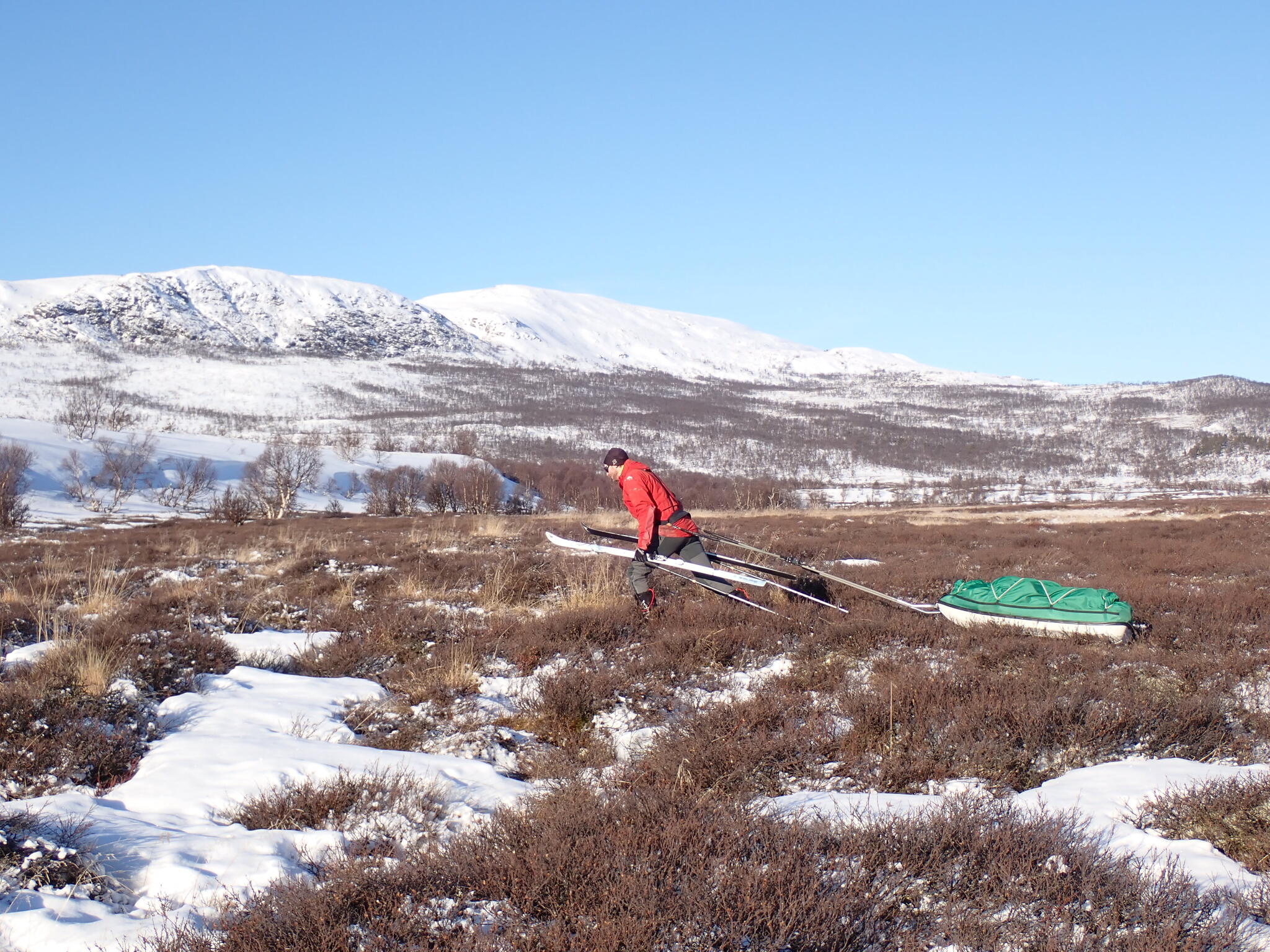 Vi behövde skida upp en lite rygg för att komma in i dalen. Det blev zickzackande upp genom björkskog och när vi kom högre på snösträngar Jättedåligt med snö. Skidor och pulka fick många skrapmärken från stenar denna dag.