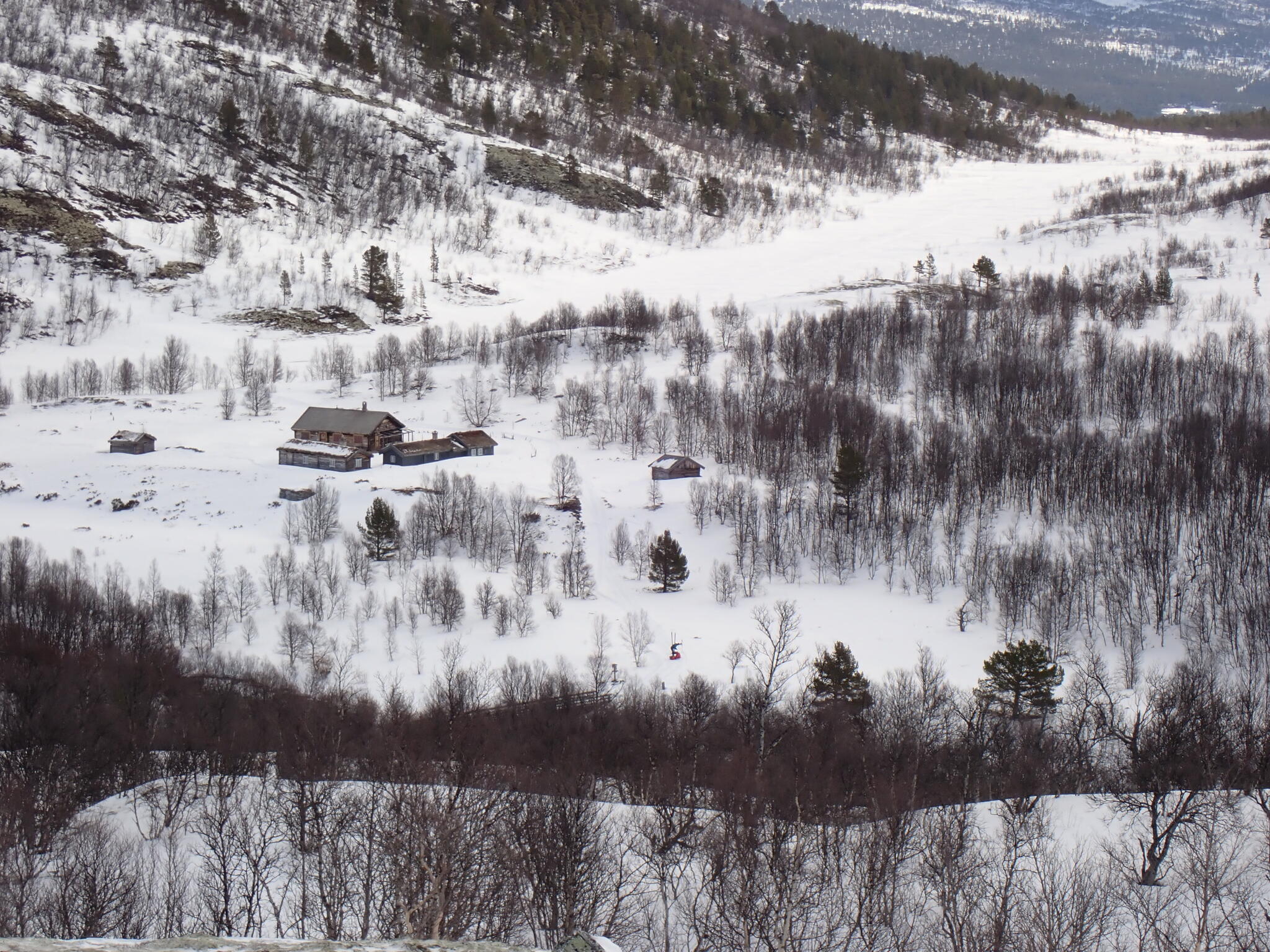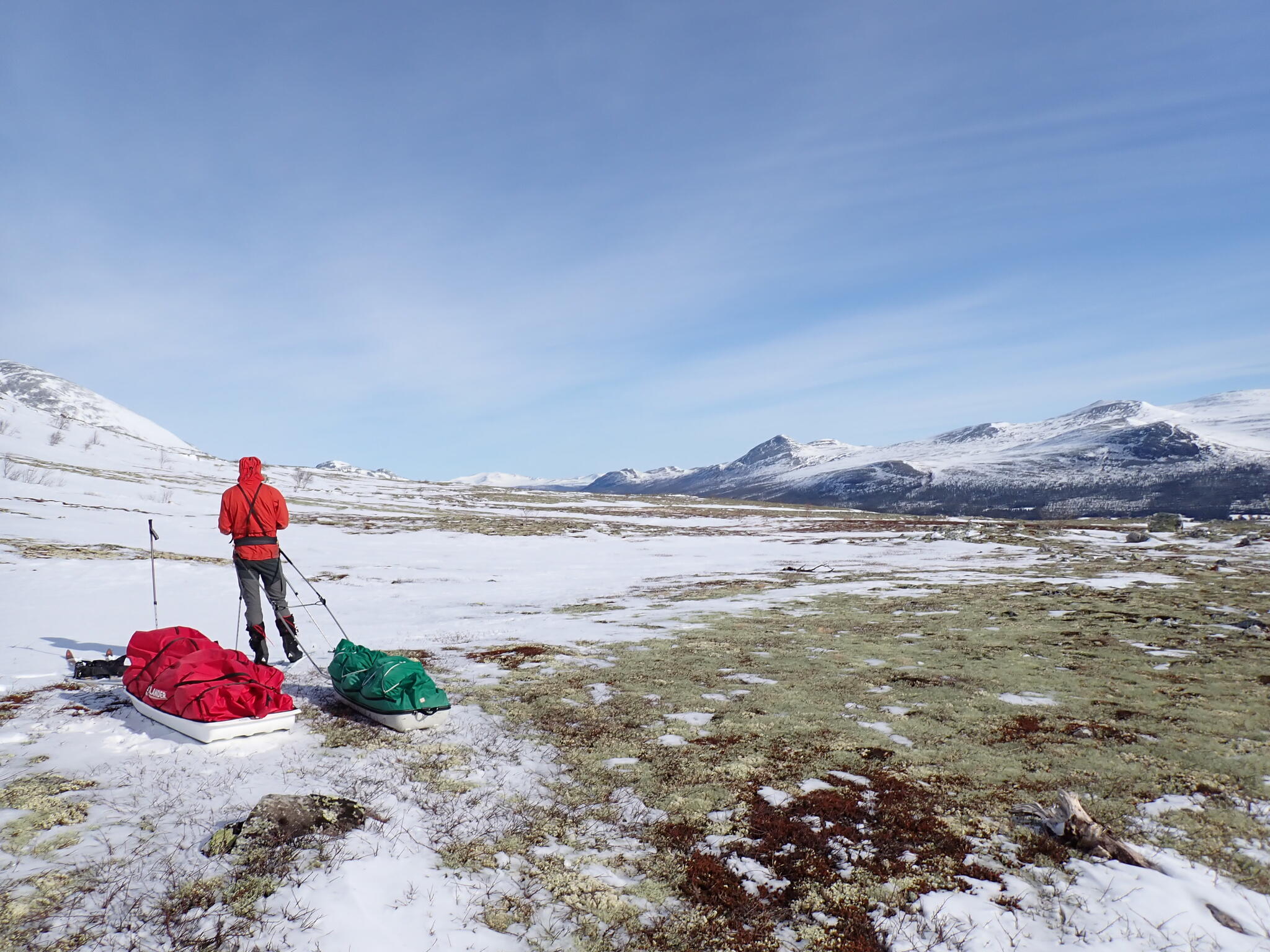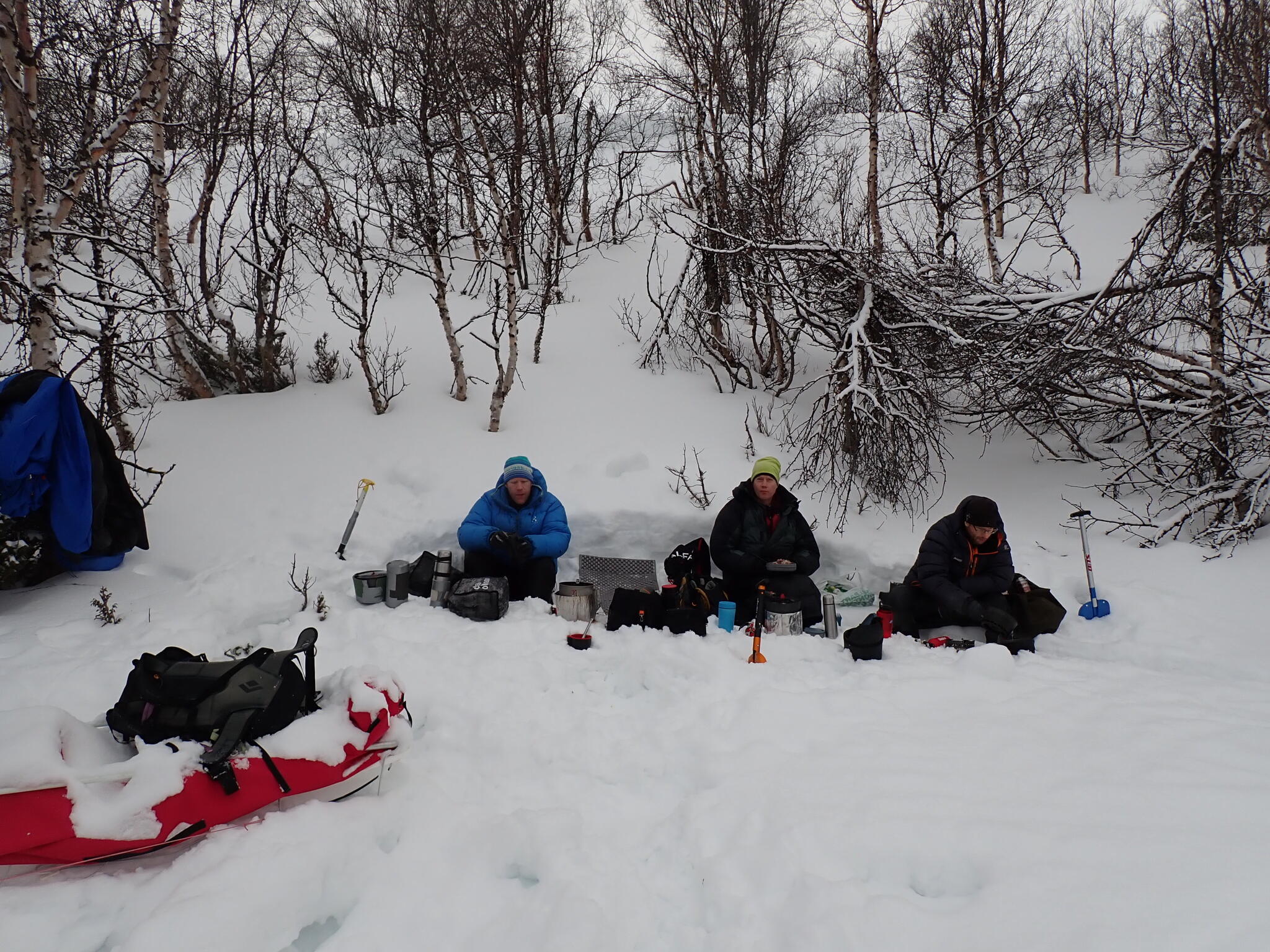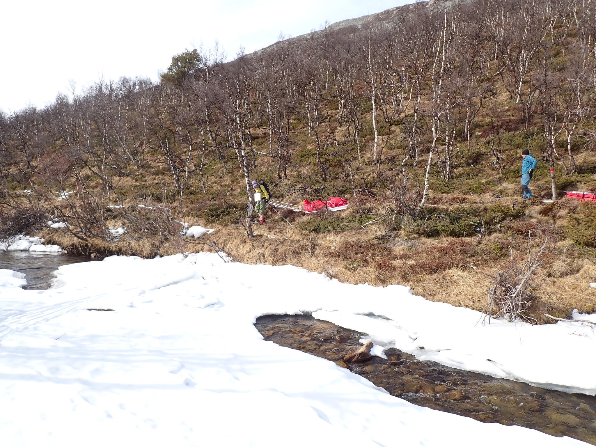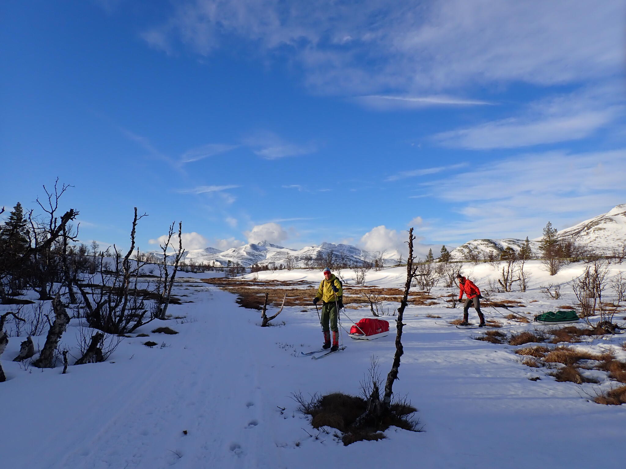 Vi behövde skida upp en lite rygg för att komma in i dalen. Det blev zickzackande upp genom björkskog och när vi kom högre på snösträngar Jättedåligt med snö. Skidor och pulka fick många skrapmärken från stenar denna dag.