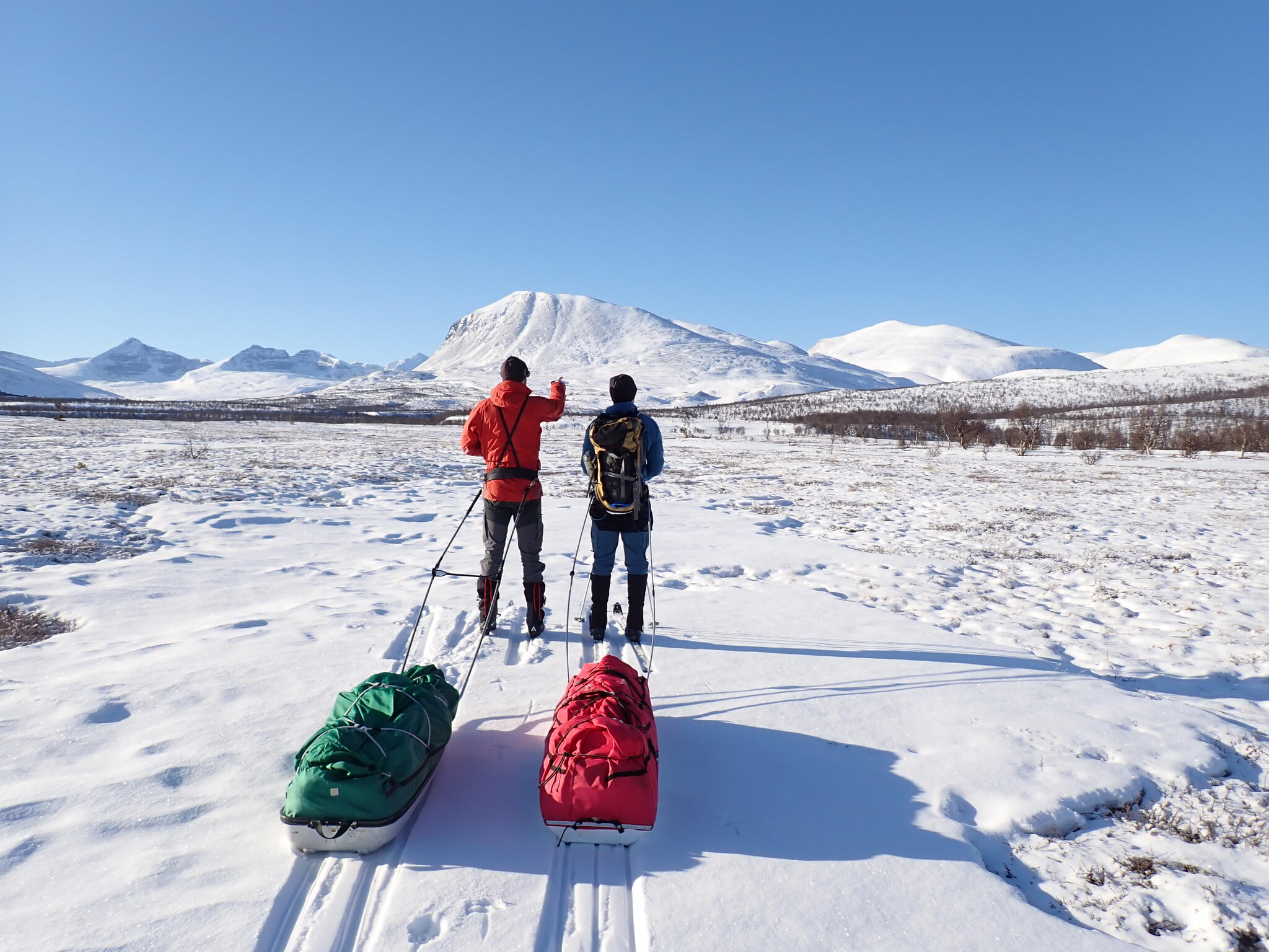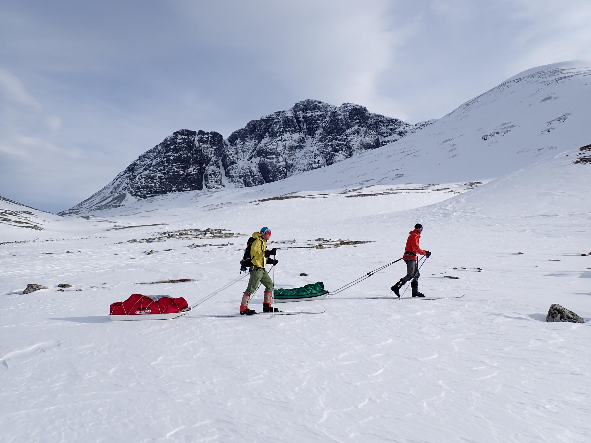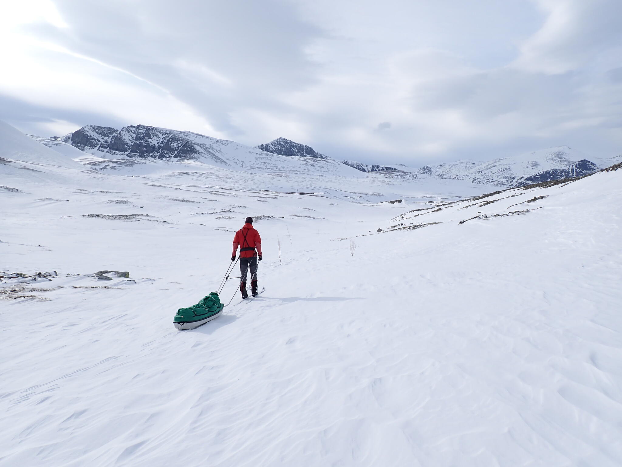 Ibland drog vi pulkorna över kortare stenområden. Leden går upp på en förlängning av fjället Austre Smedhamran.