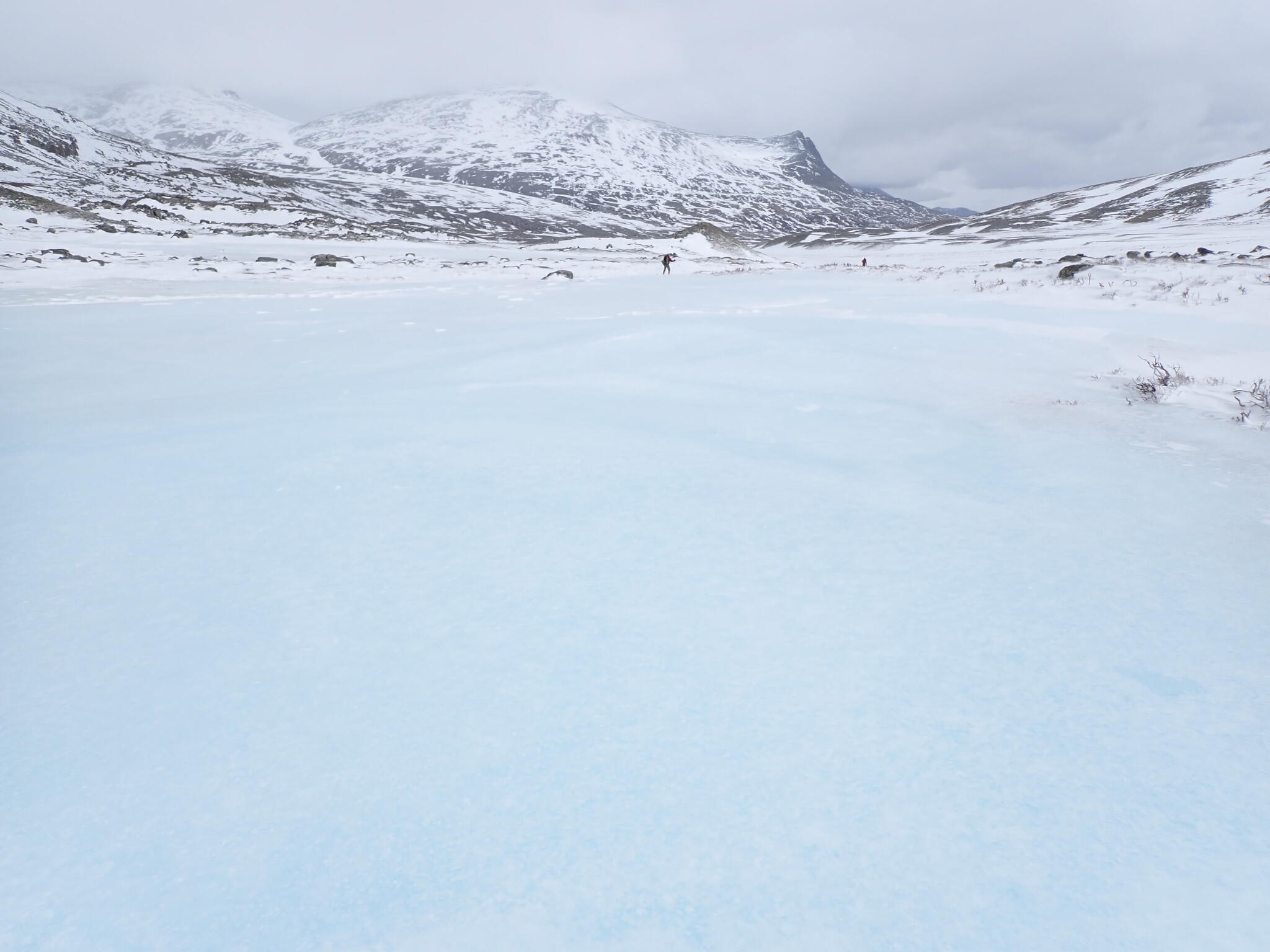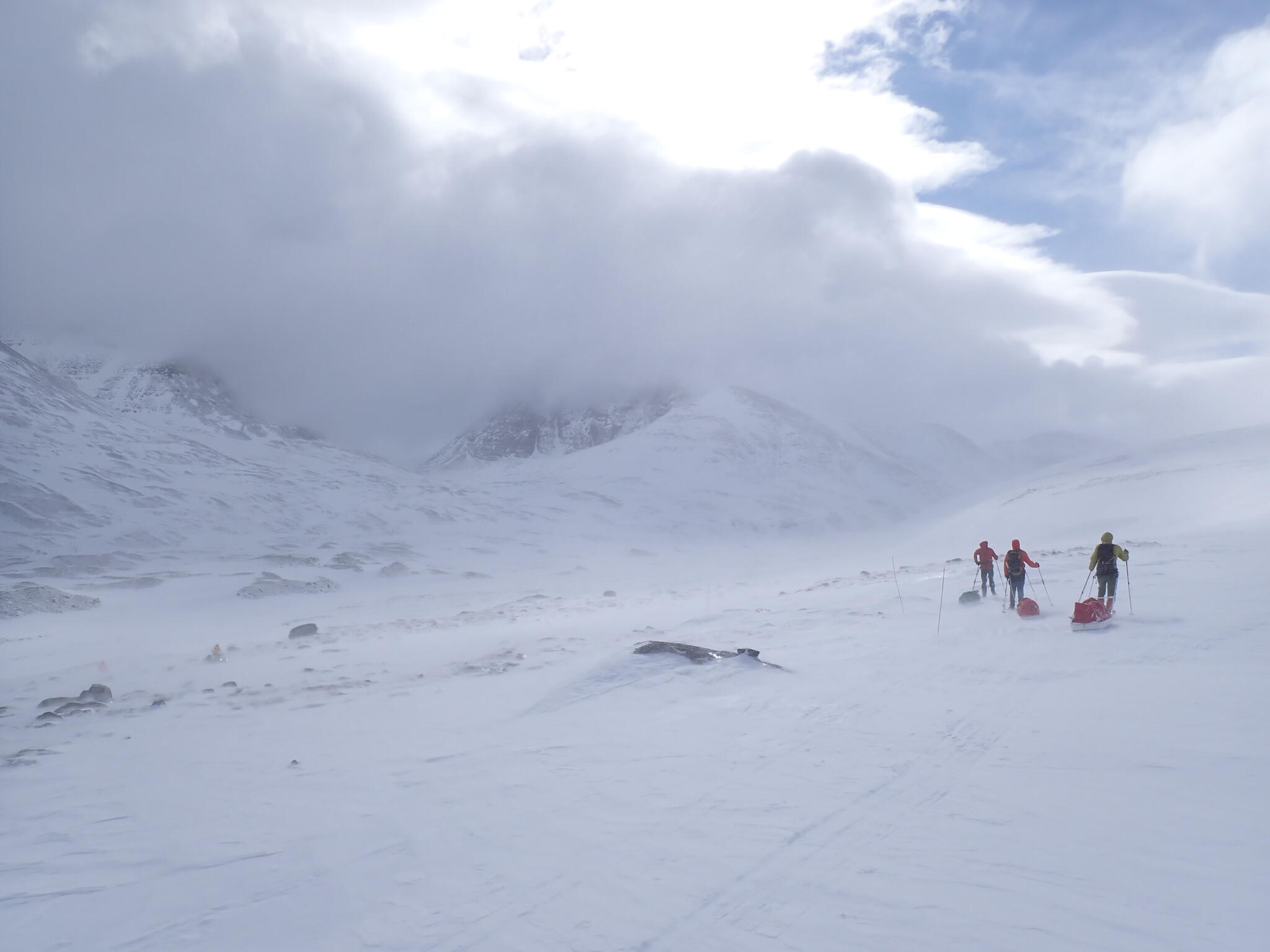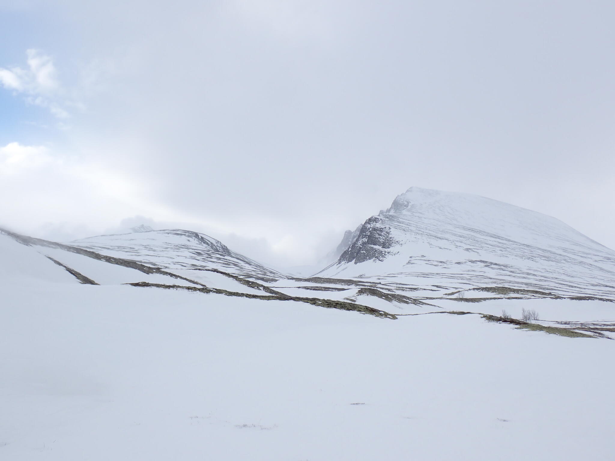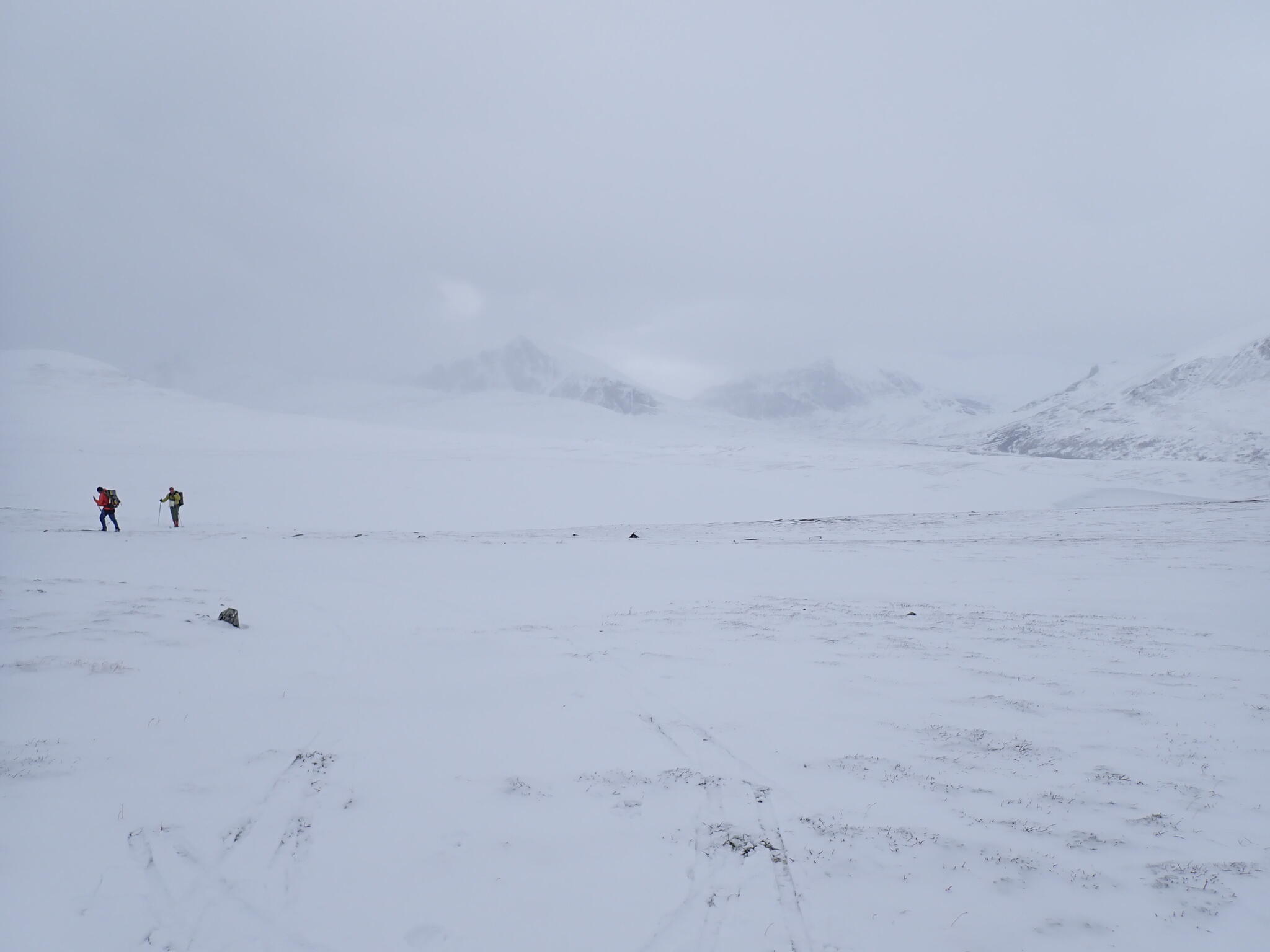 När dalen tog slut och vi var uppe på kalfjället tog också snön slut. Vi behövde vi ta sikte mot en sänka som skulle föra oss mot en dal på andra sidan fjällen. Förhoppningsvis skulle det även finnas snö i sänkan. Fantastisk utsikt från högplatån vi befann oss på mot höga fjäll. Men det blev sämre sikt.