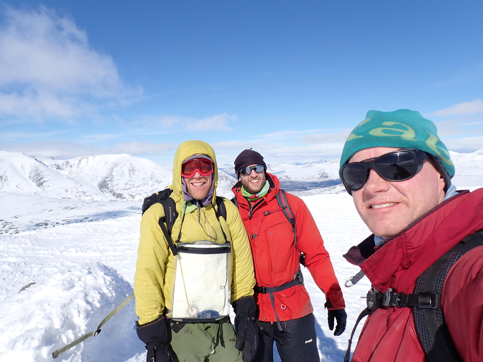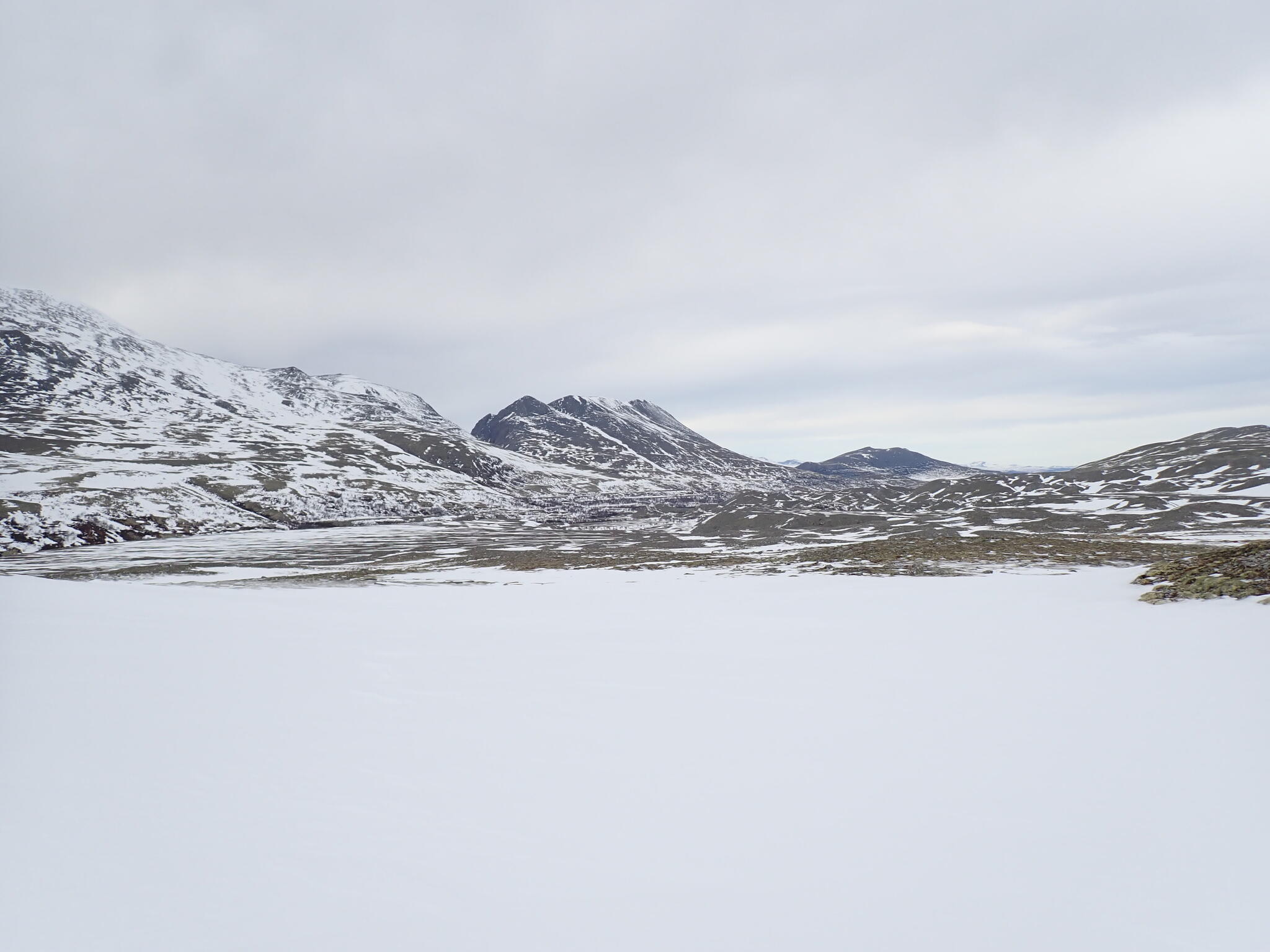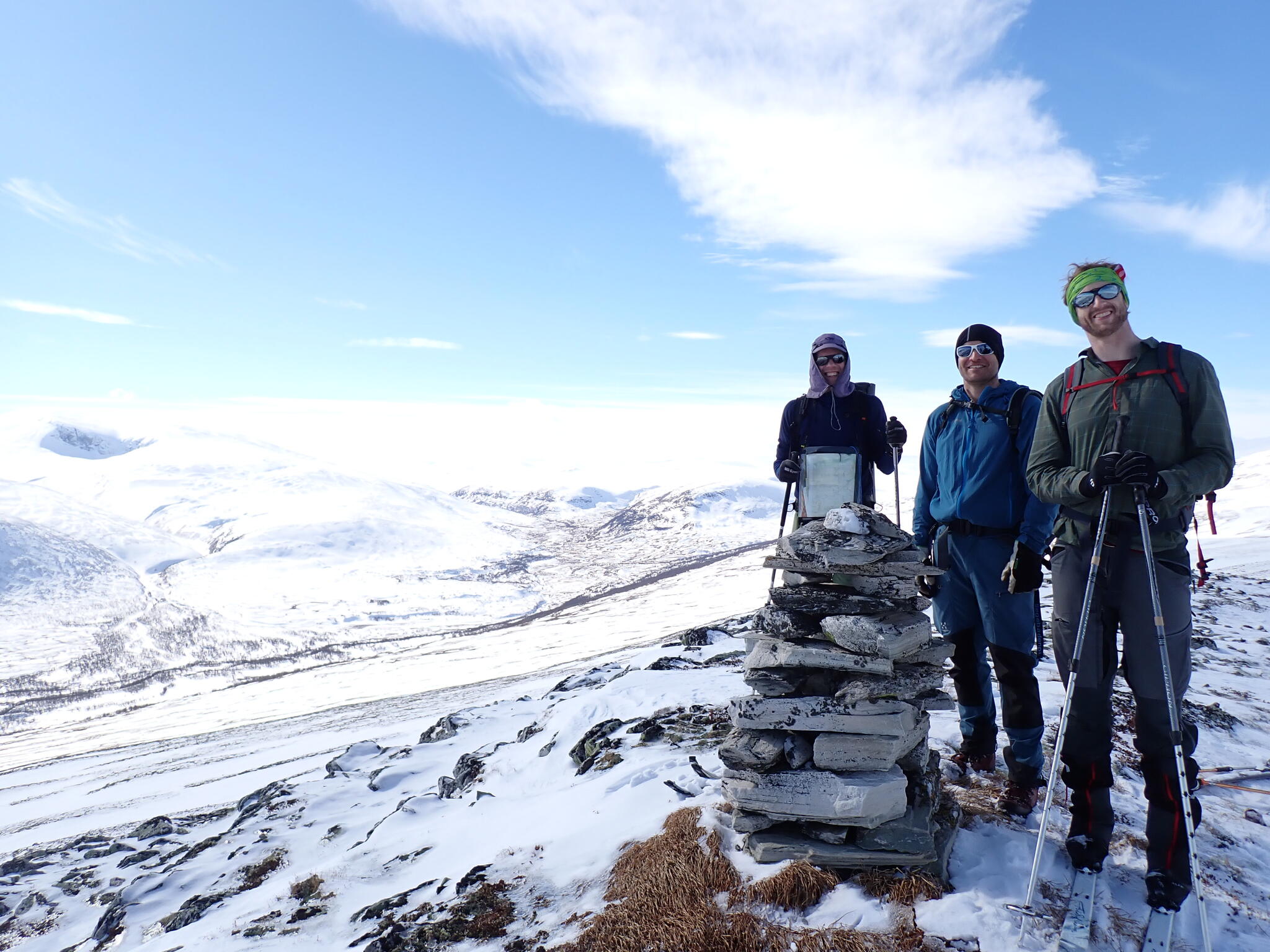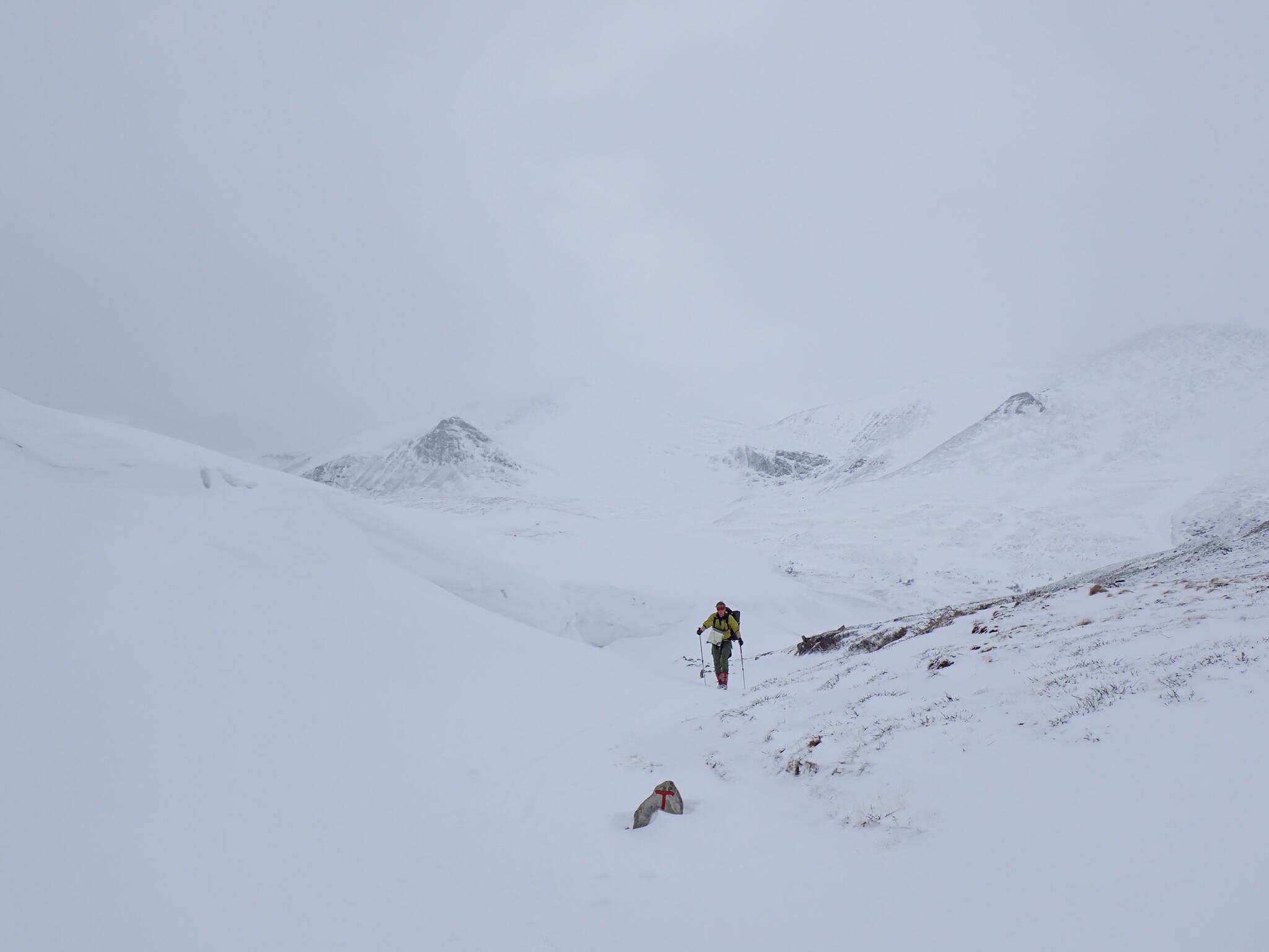 När dalen tog slut och vi var uppe på kalfjället tog också snön slut. Vi behövde vi ta sikte mot en sänka som skulle föra oss mot en dal på andra sidan fjällen. Förhoppningsvis skulle det även finnas snö i sänkan. Fantastisk utsikt från högplatån vi befann oss på mot höga fjäll. Men det blev sämre sikt.