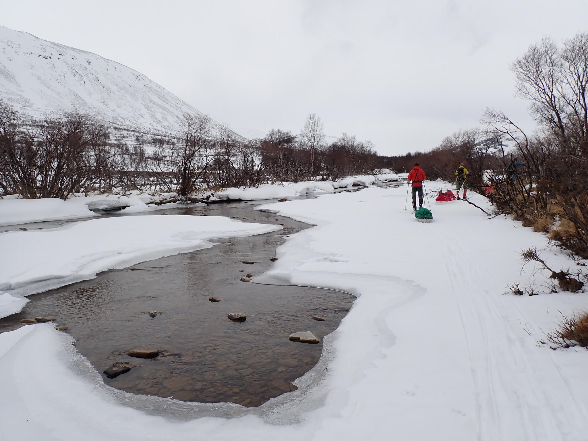Sista biten ner till ån i dalbotten följde vi en vandringstig. Det fanns knappt någon snö. Tog av oss skidor bitvis och drog pulkorna.