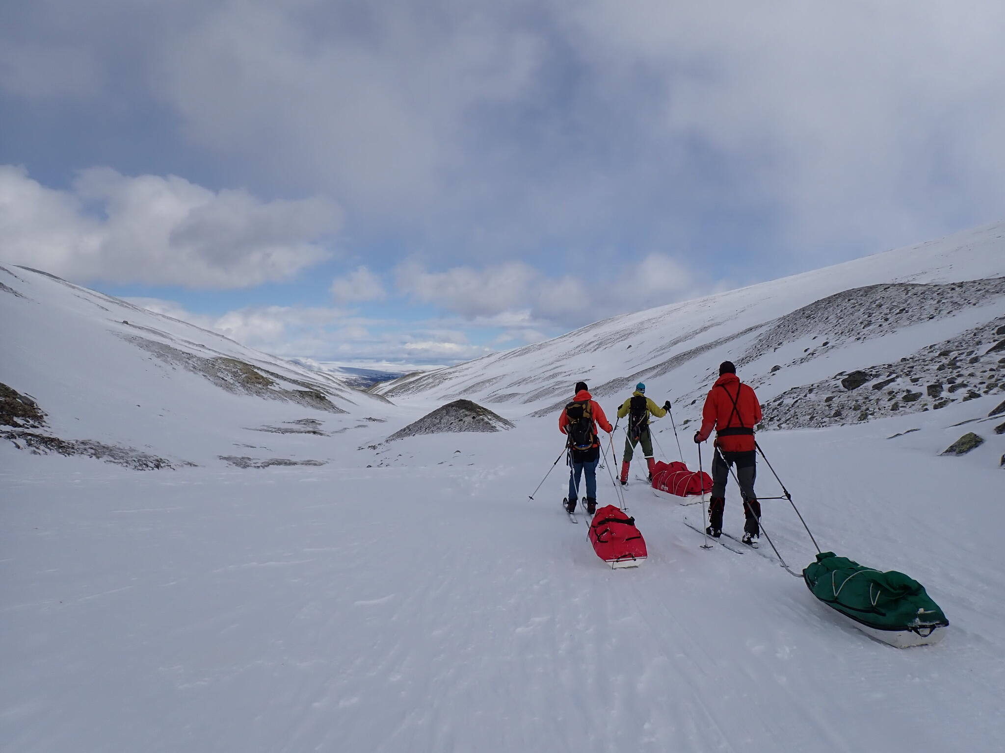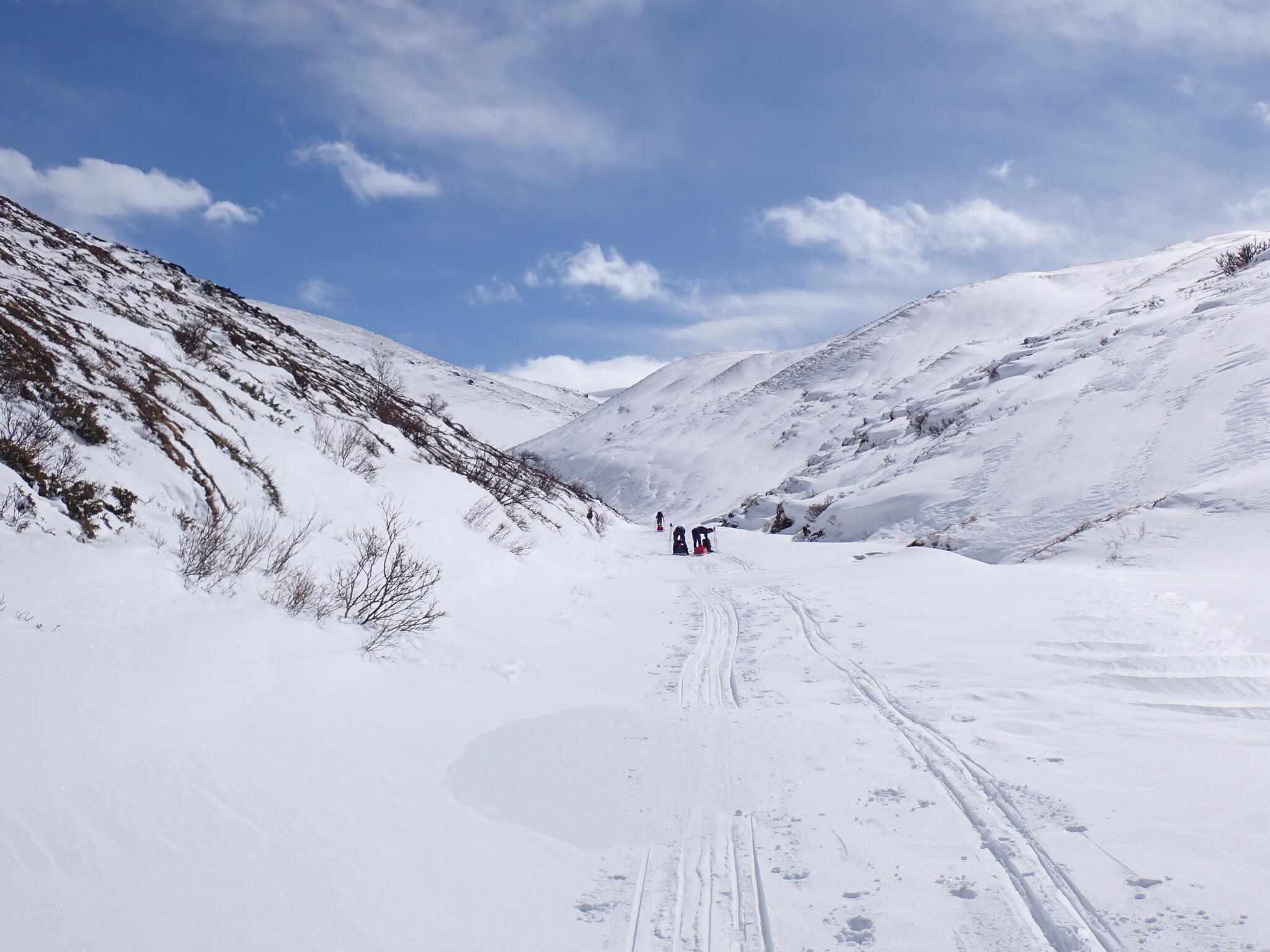 När vi fyra återsamlades var det tydligt att den trånga dalen verkade funkar. Så kul och bra!. Vi skidade vi i dalgången in med pulkorna.