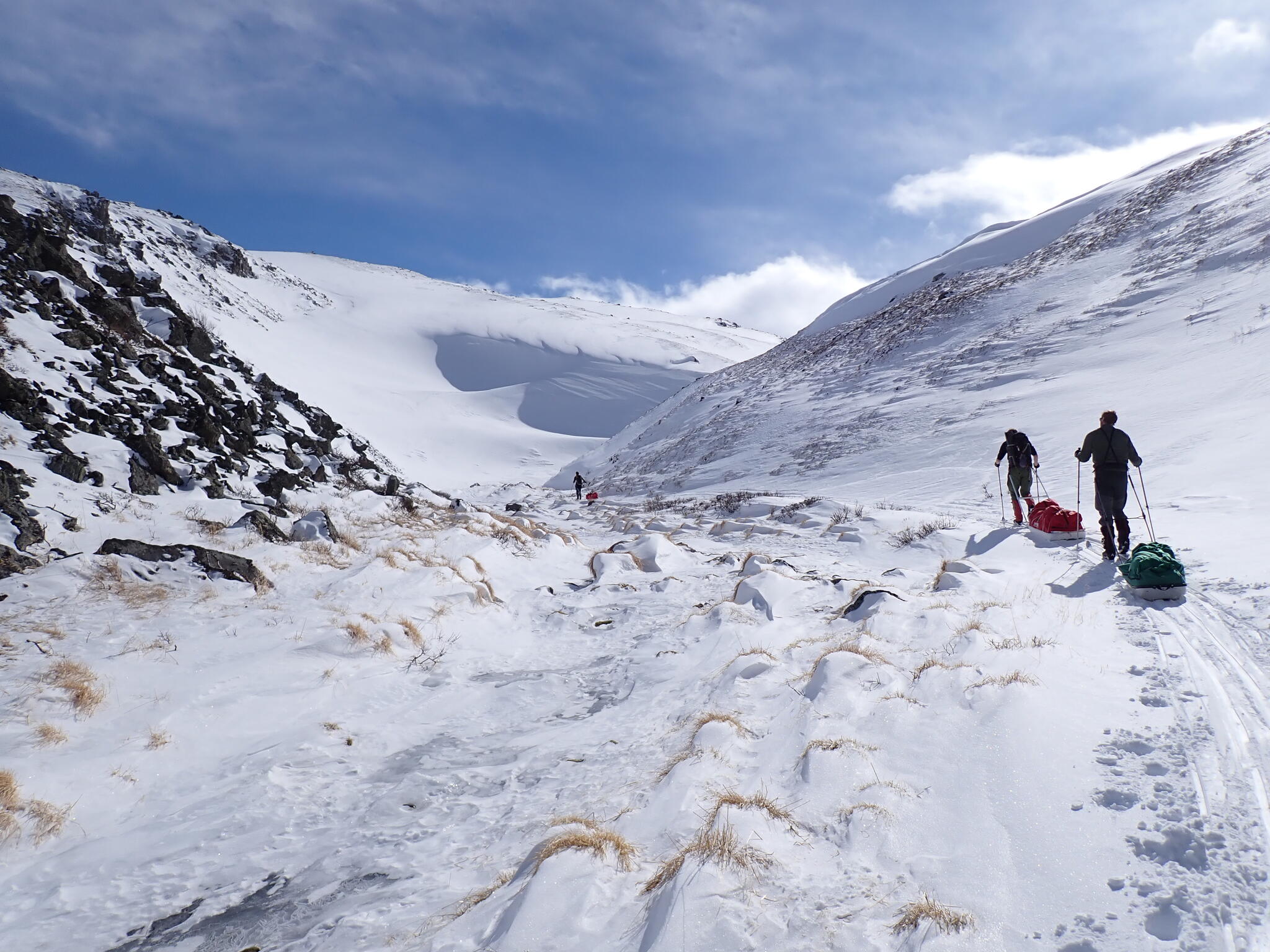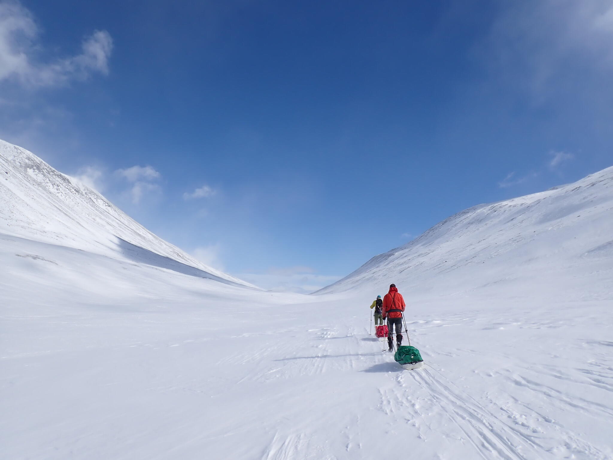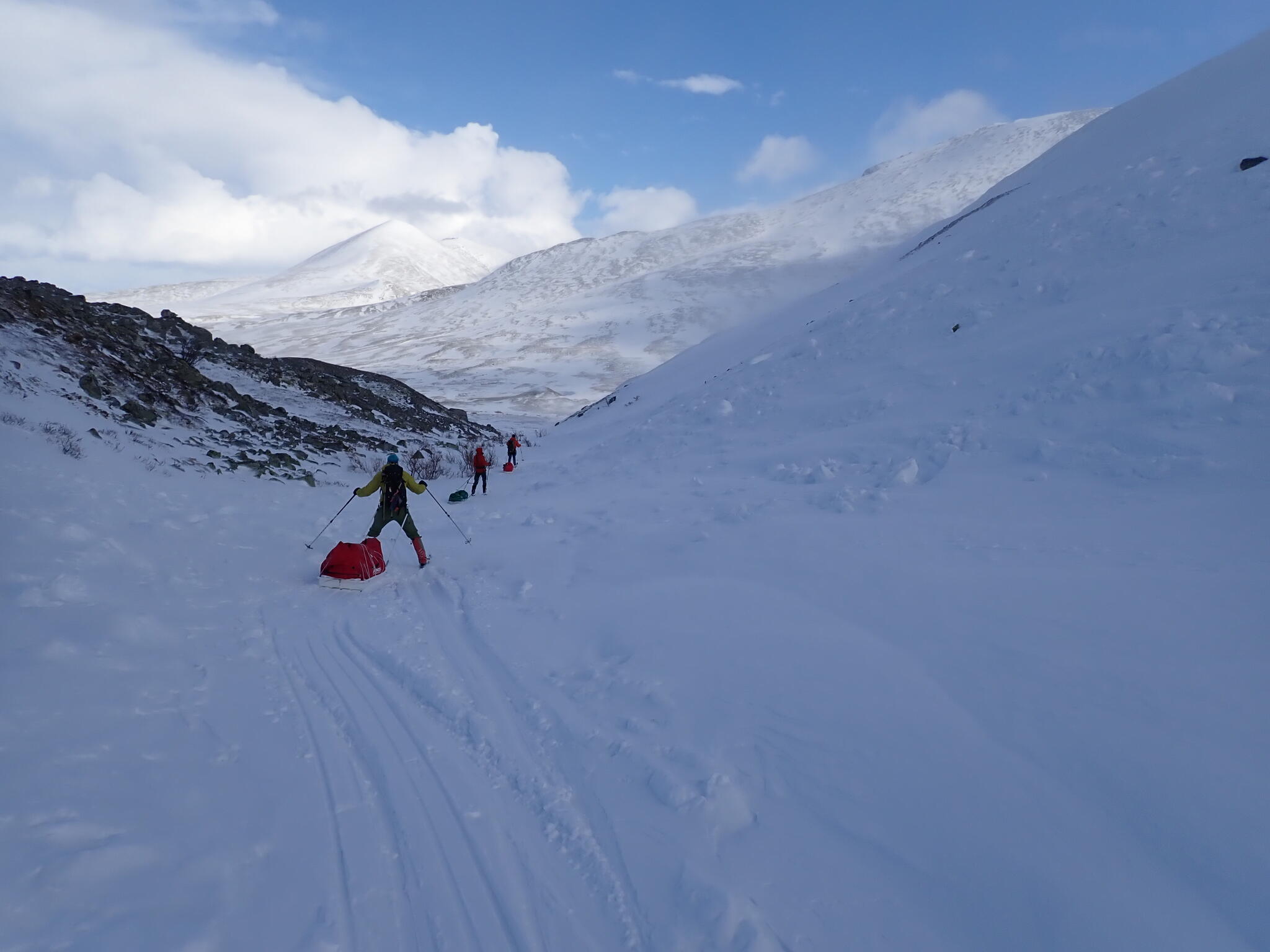 Från dalbotten gick leden upp på en brant snödriva. Lite kämpigt att ta sig uppför med pulkorna, men det gick.
