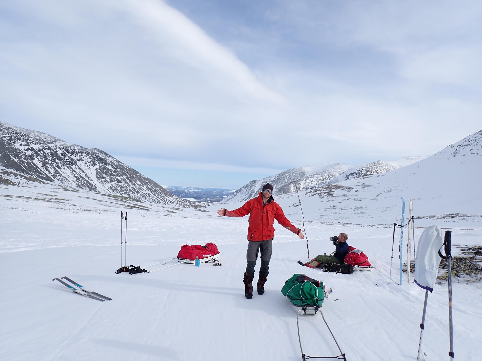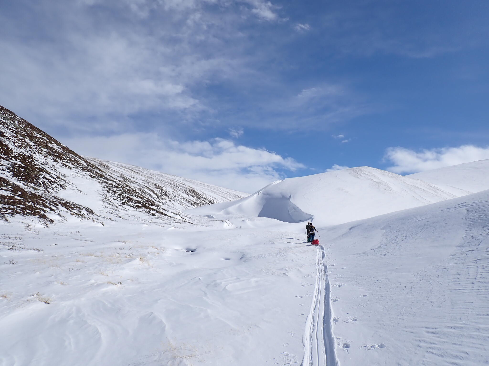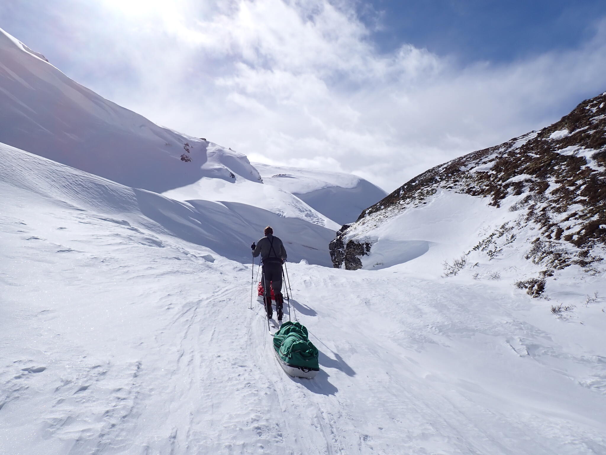 Vi skulle nu över en flack bergsrygg för att komma ner till vår tältdal. Vi hittade snösträngar att skida på.