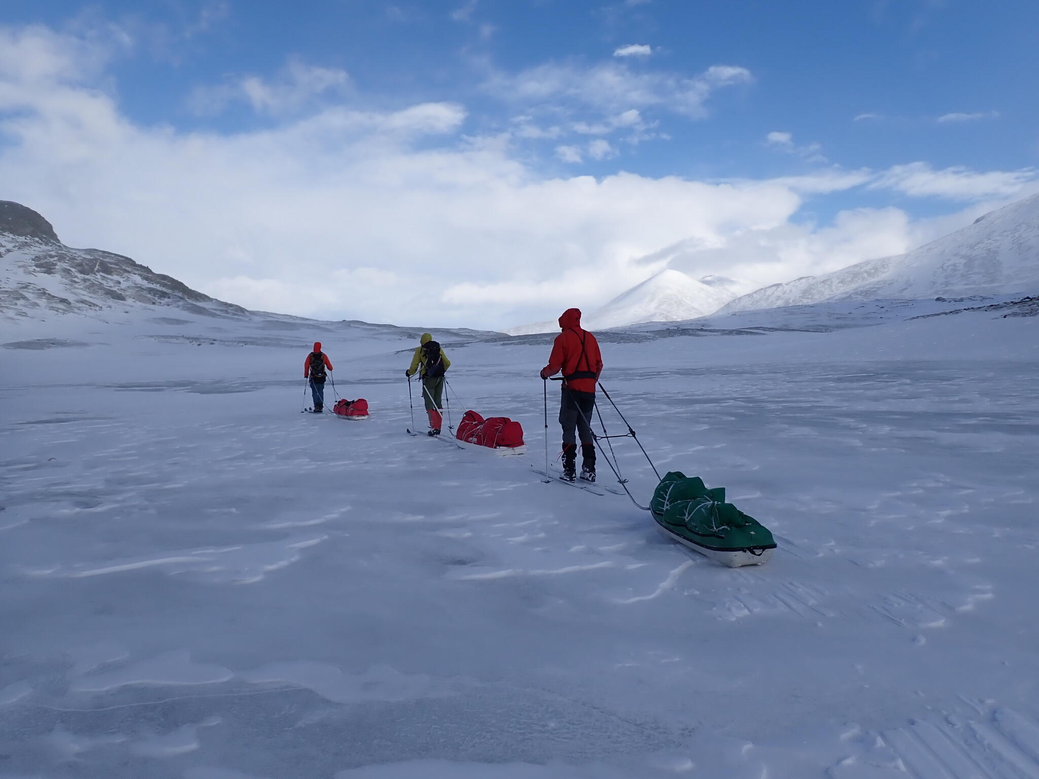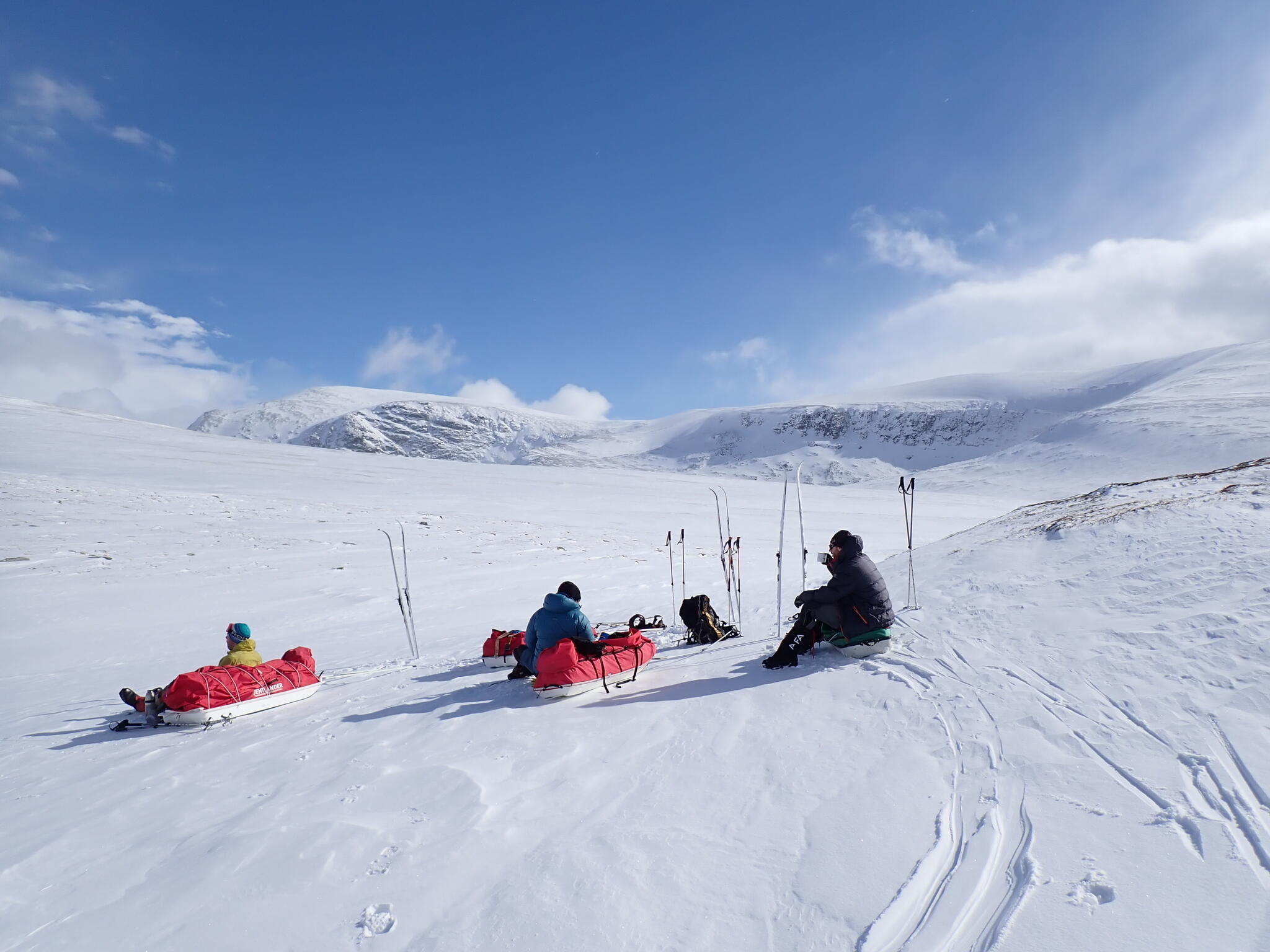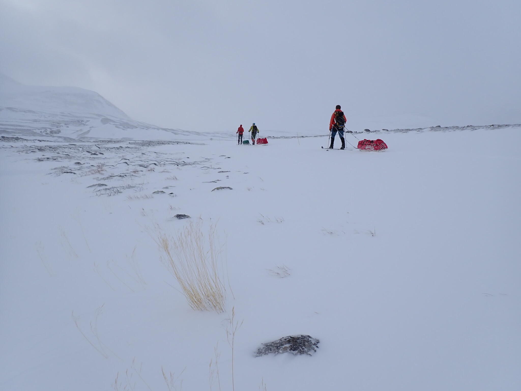 Vi pratade lite kort om vad vi skulle göra resten av dagen. Alla tre kände att vi lika väl skulle kunna skida med pulkorna mot bilen. Så skulle vi kunna komma hem en dag tidigare. Det fanns inte så mycket mer givande skidåkning i området för oss, med snöbrist och mycket blåst.