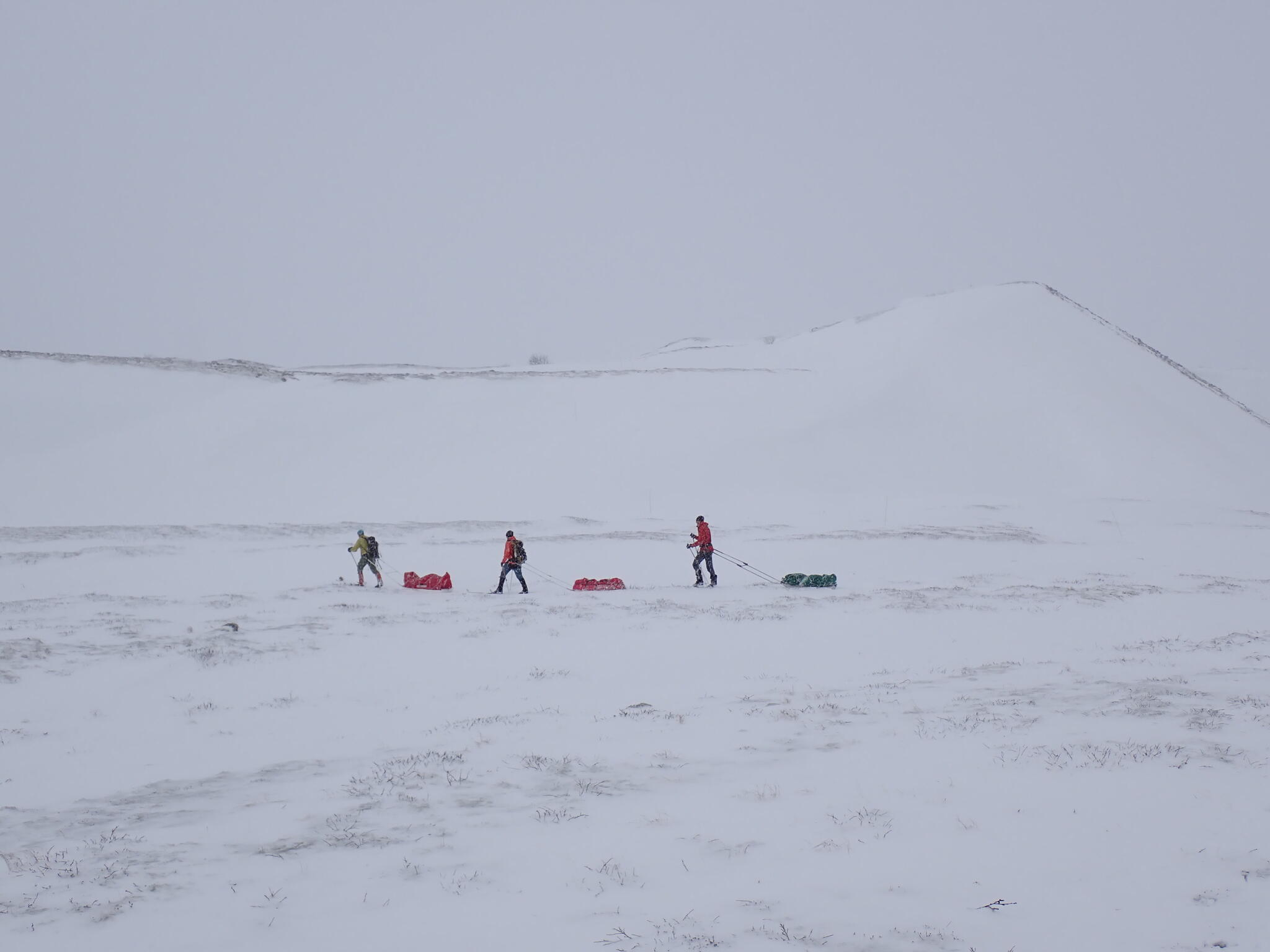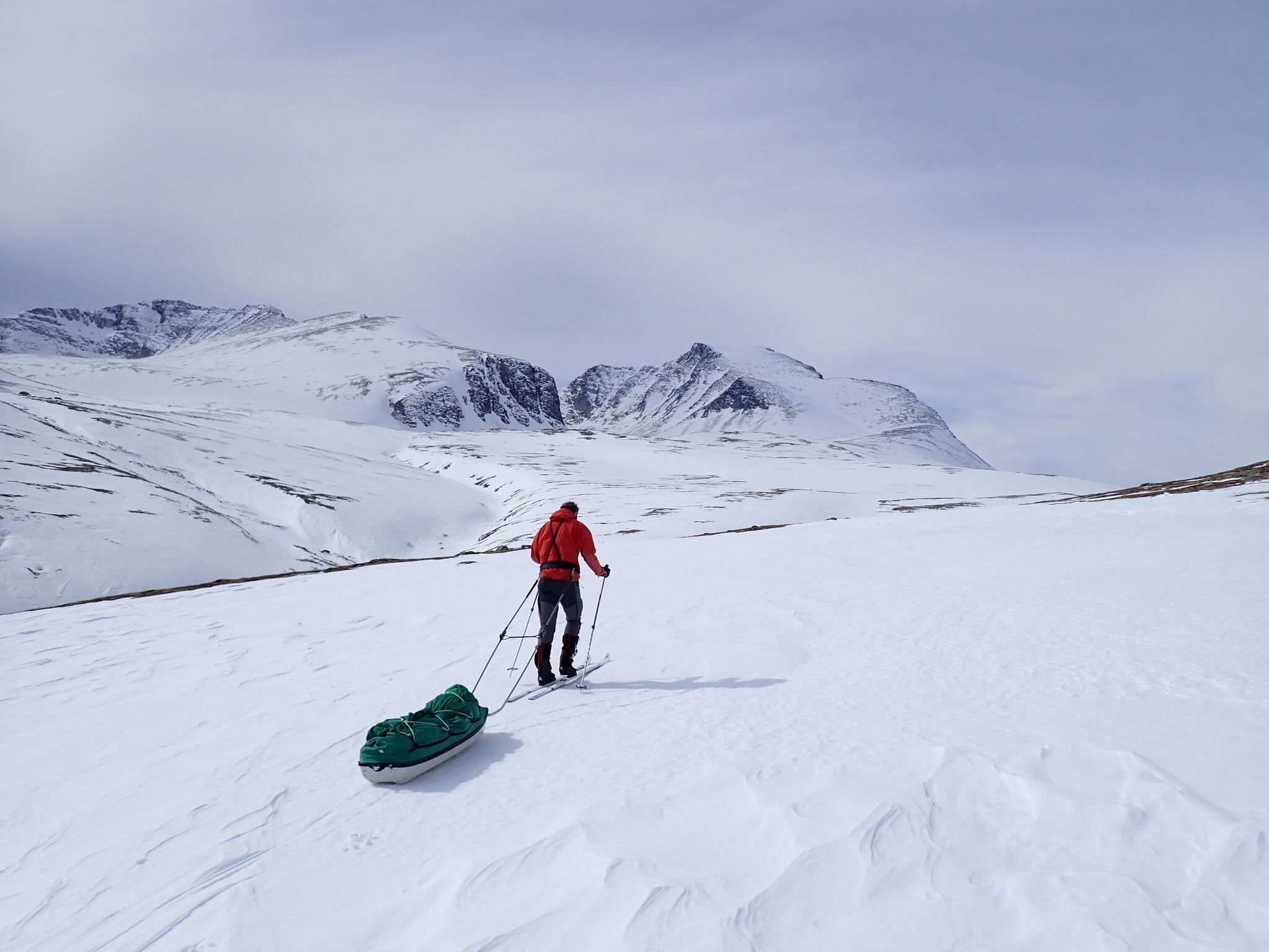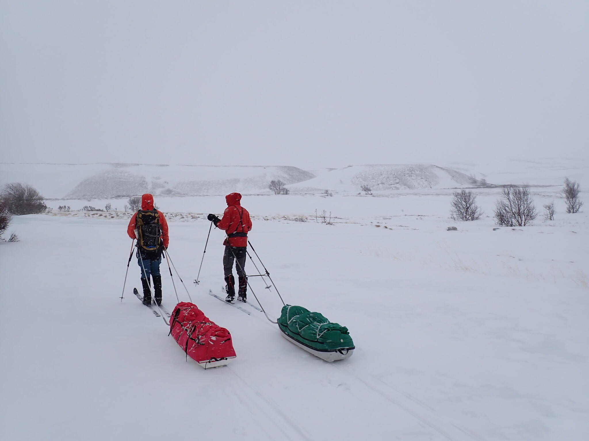 Vi pratade lite kort om vad vi skulle göra resten av dagen. Alla tre kände att vi lika väl skulle kunna skida med pulkorna mot bilen. Så skulle vi kunna komma hem en dag tidigare. Det fanns inte så mycket mer givande skidåkning i området för oss, med snöbrist och mycket blåst.