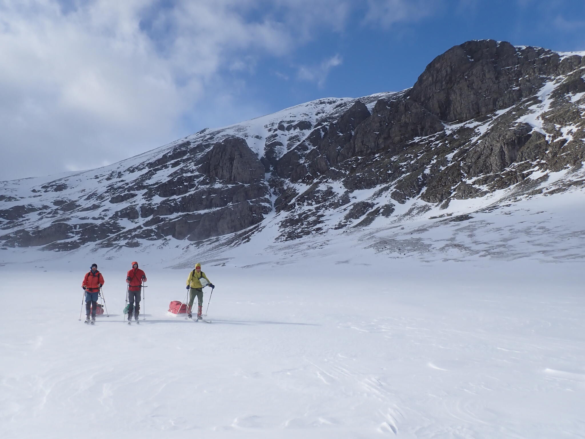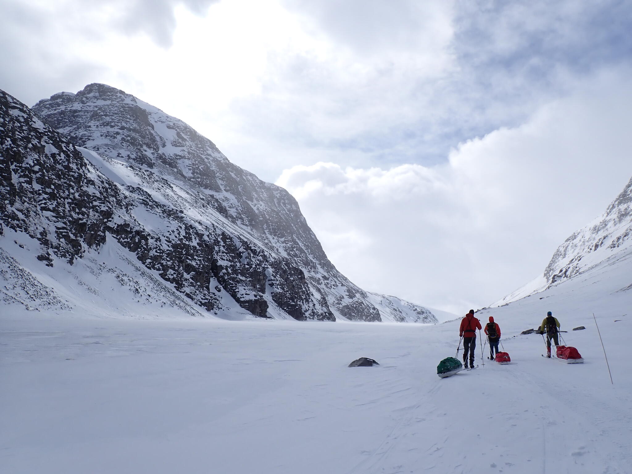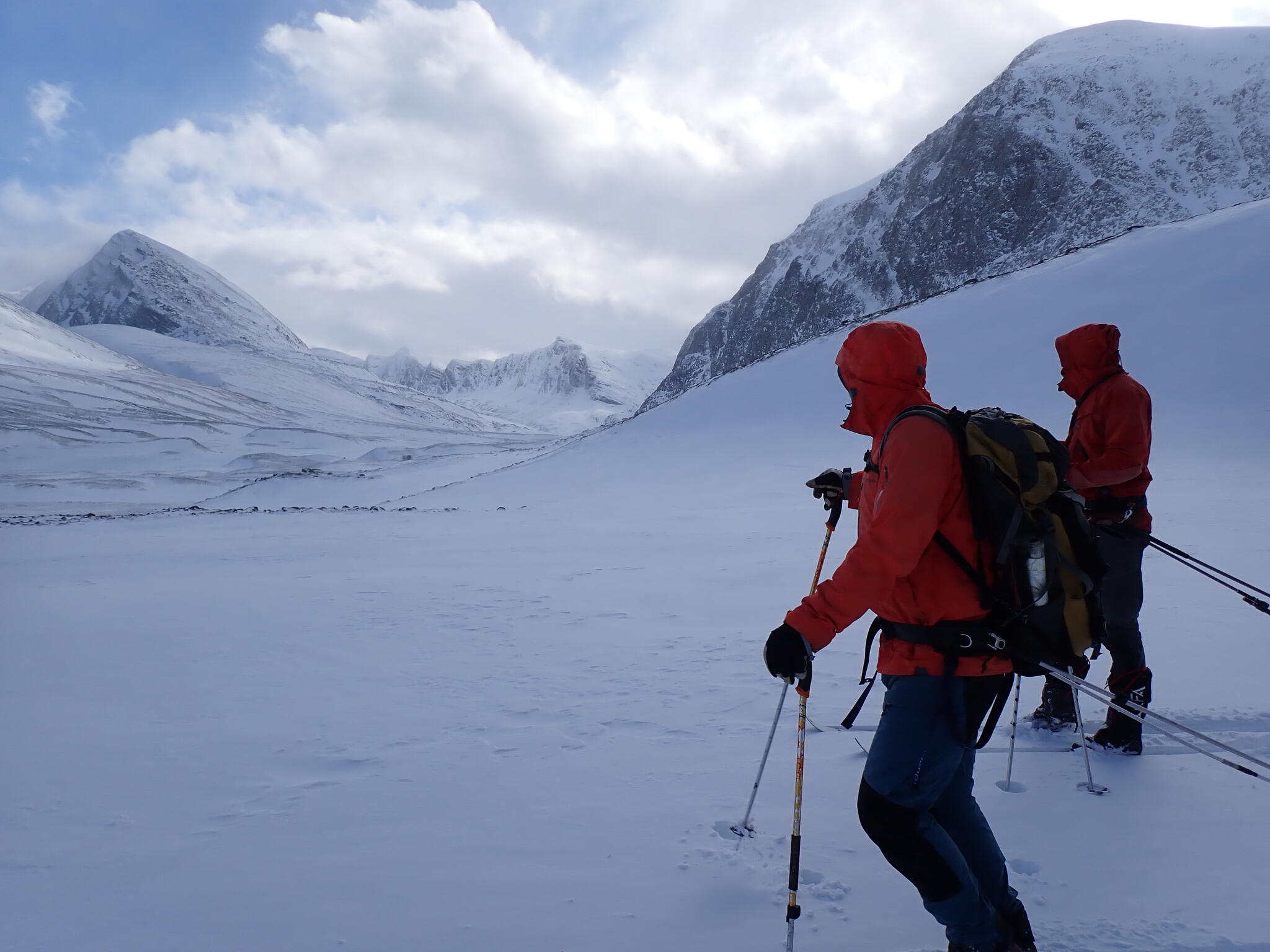 Vi fortsatte istället skida åt sydväst in mot Verkilsdalen. Bitvis hård vind. Mäktiga bergssidor.