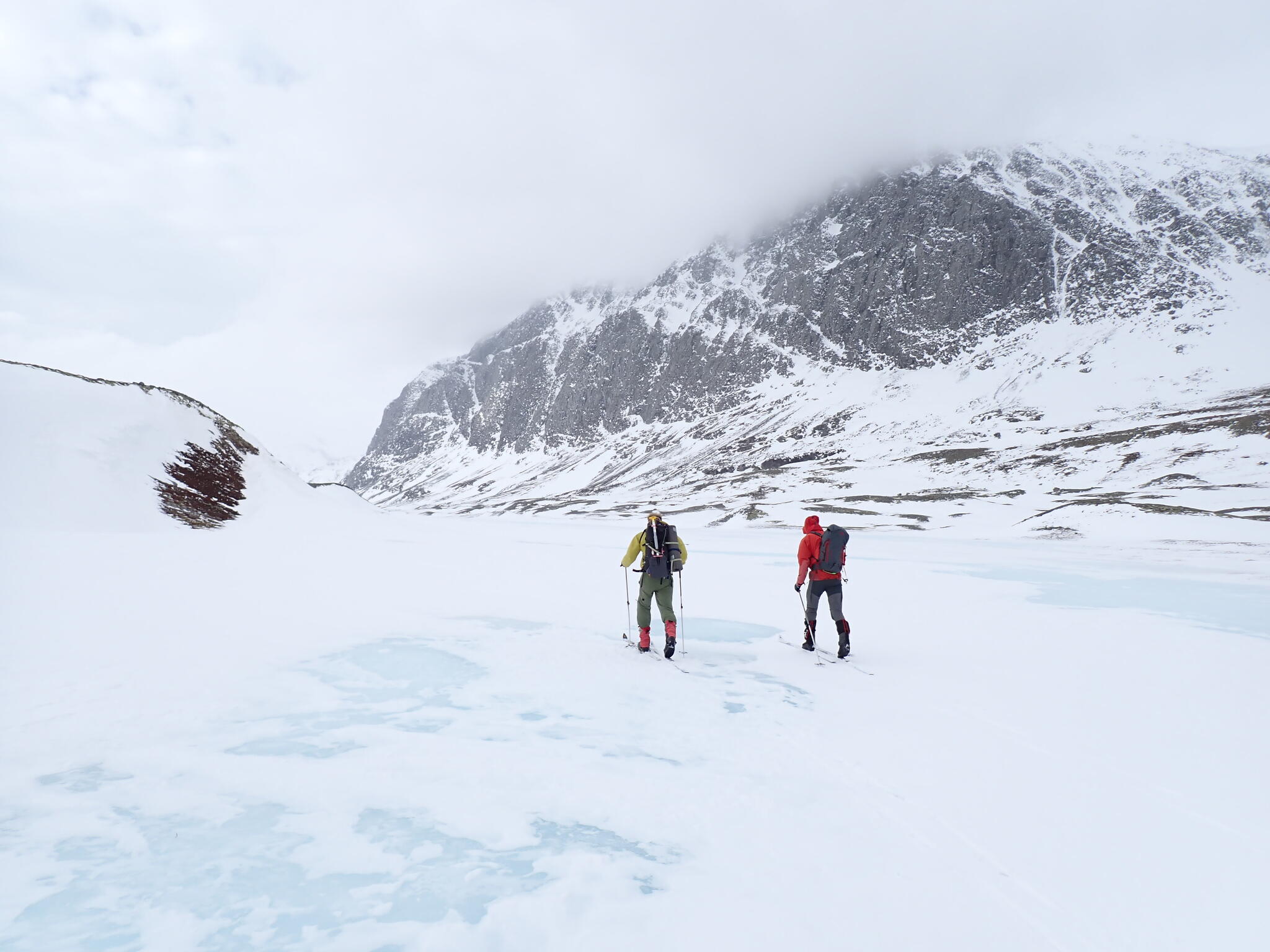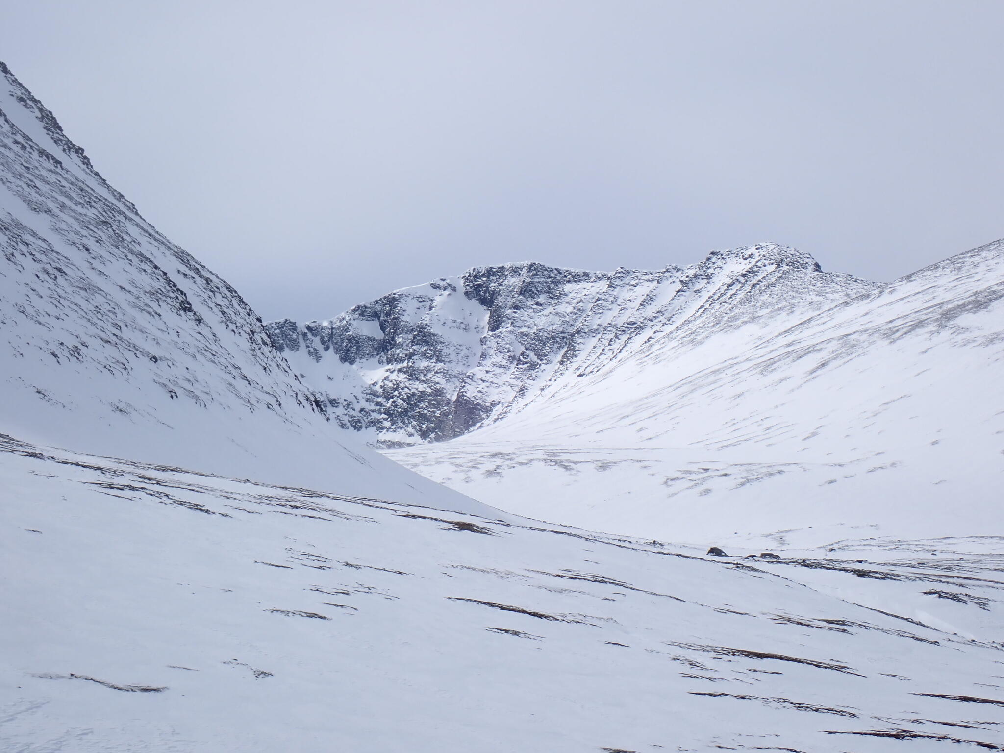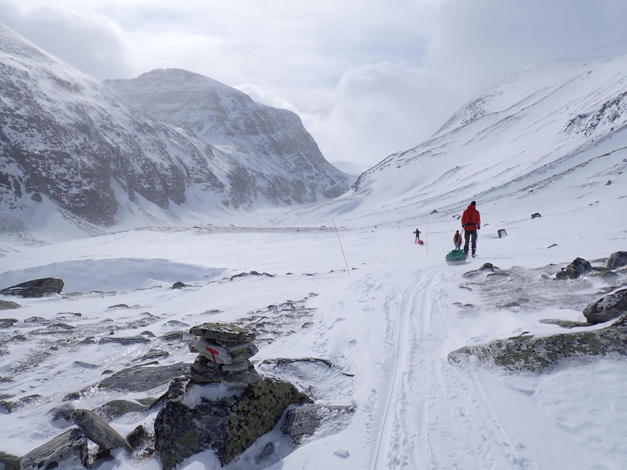 Vi fortsatte istället skida åt sydväst in mot Verkilsdalen. Bitvis hård vind. Mäktiga bergssidor.