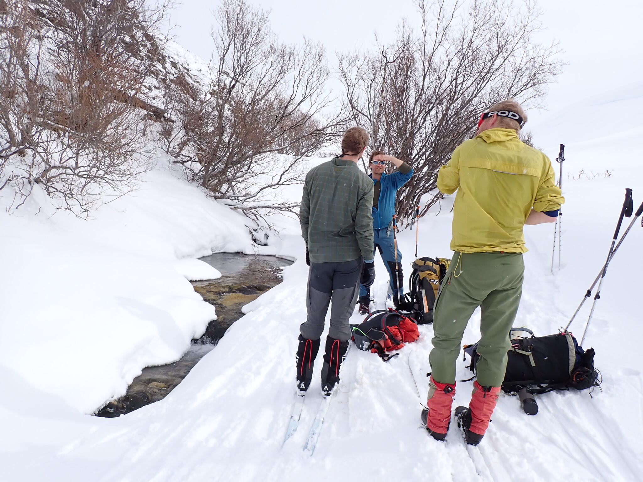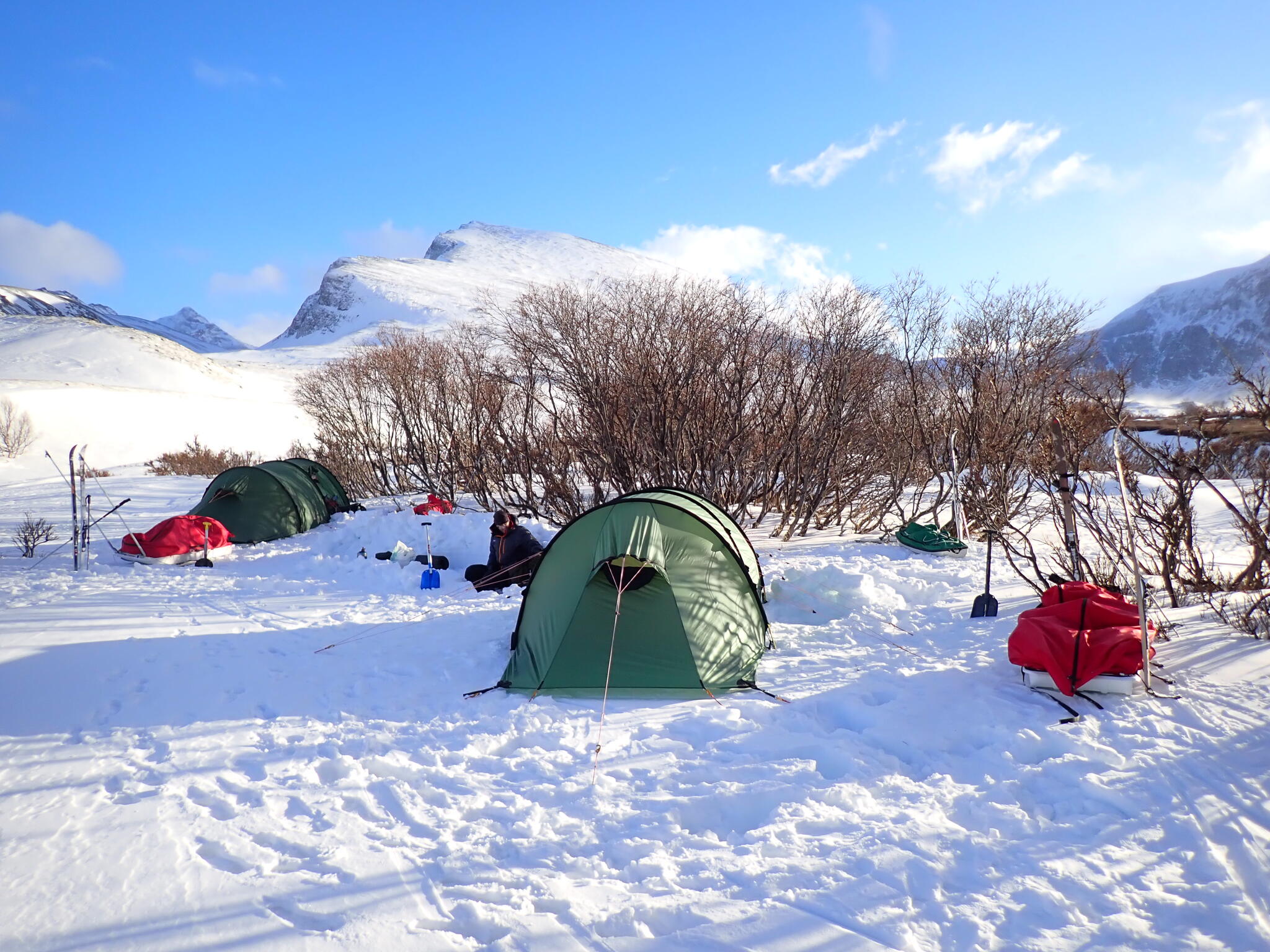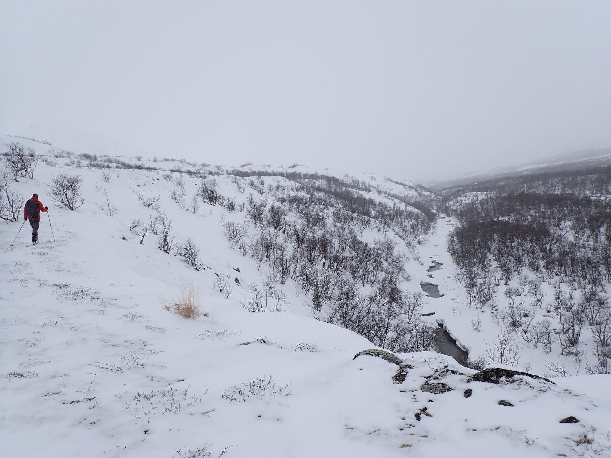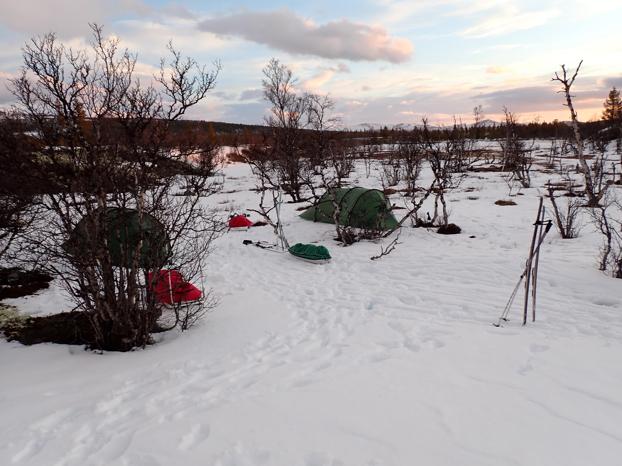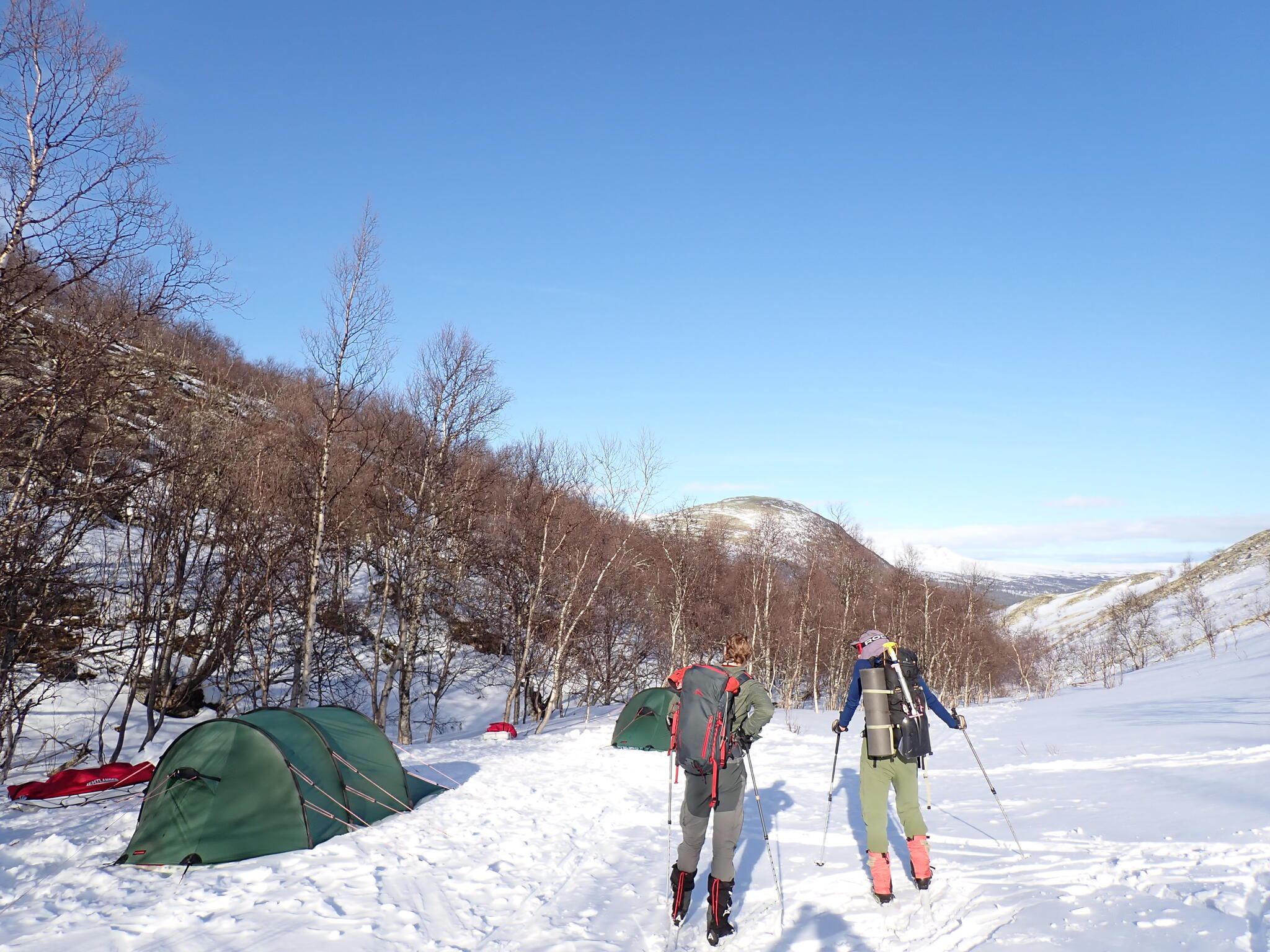 Vi ville hitta bra tältplats. Buskarna var låga där vi kom in i dalen och det var ett tunt snötäcke. Så vi behövde söka oss nerströms i dalen, dit det verkade finnas fjällbjörkar.