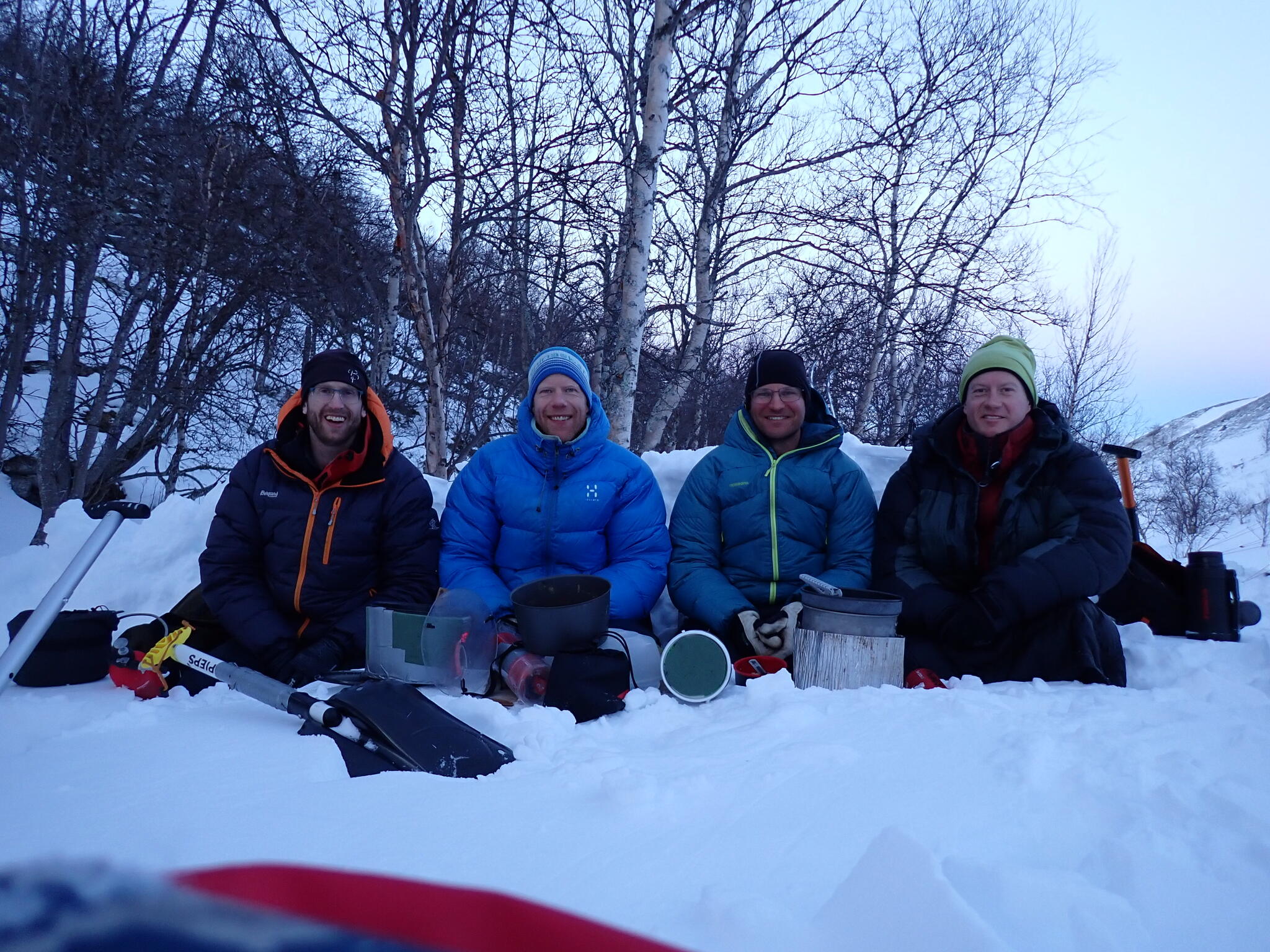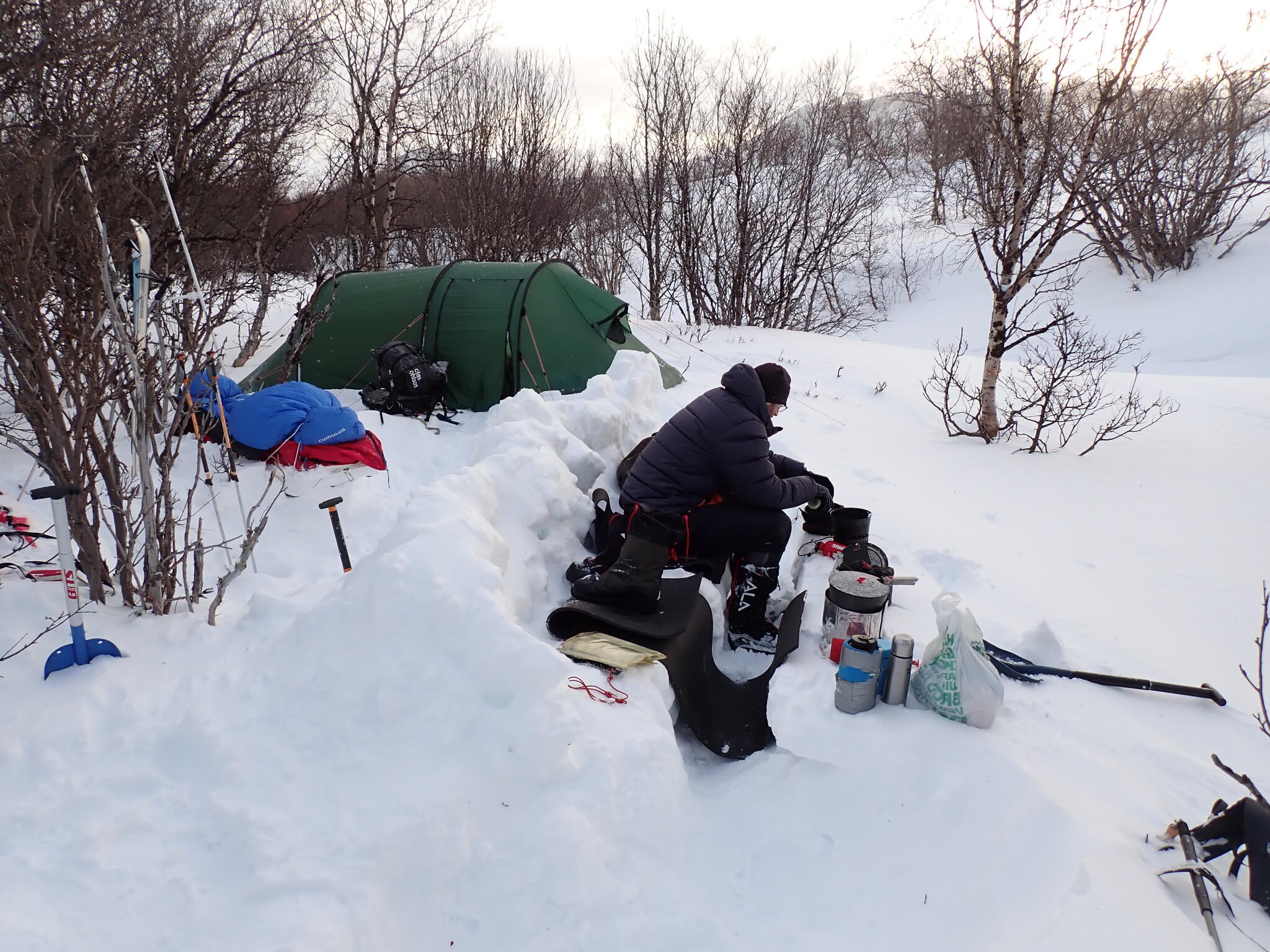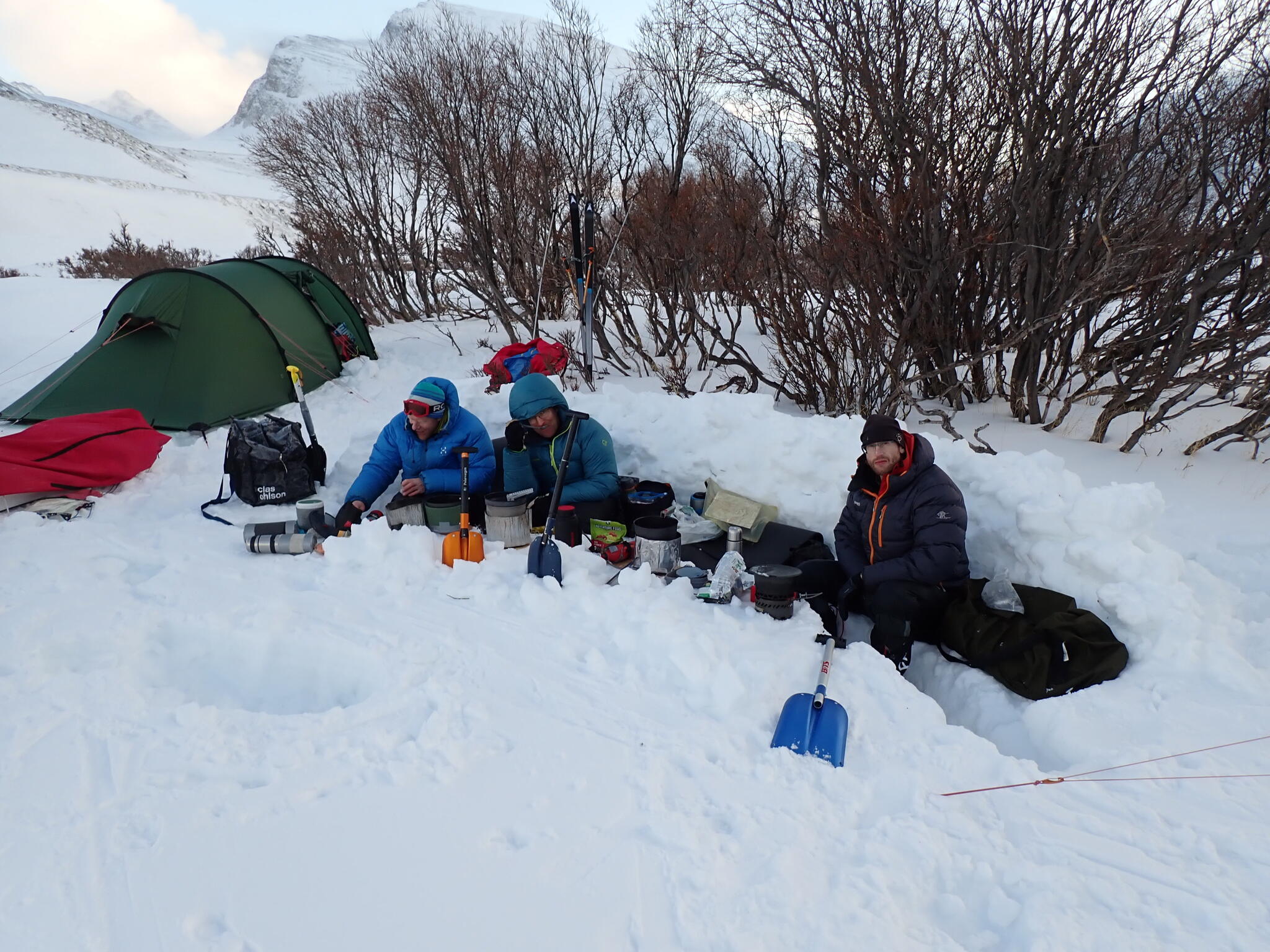I en liten svacka vid ån fanns stenhård snö i kanterna. Där slog vi läger. Björn och Andreas grävde fram en platt yta i en snödriva för sitt tält, medan jag och Magnus satte vårt tält på den stenhårda snöisen i botten av svackan.