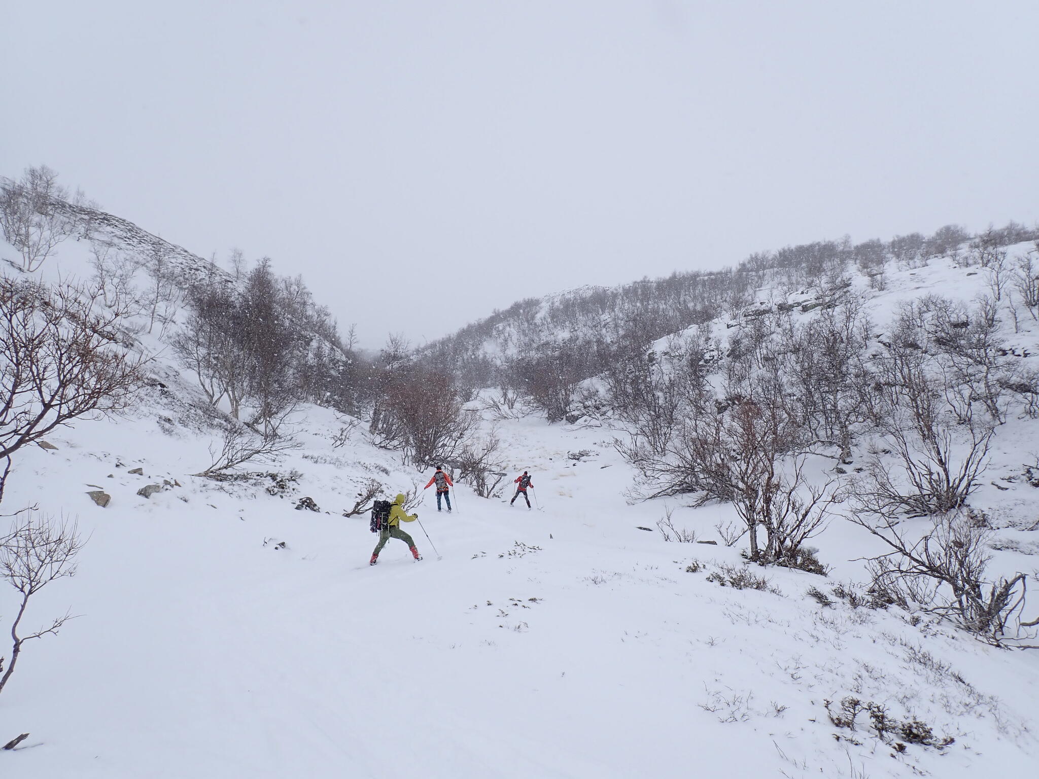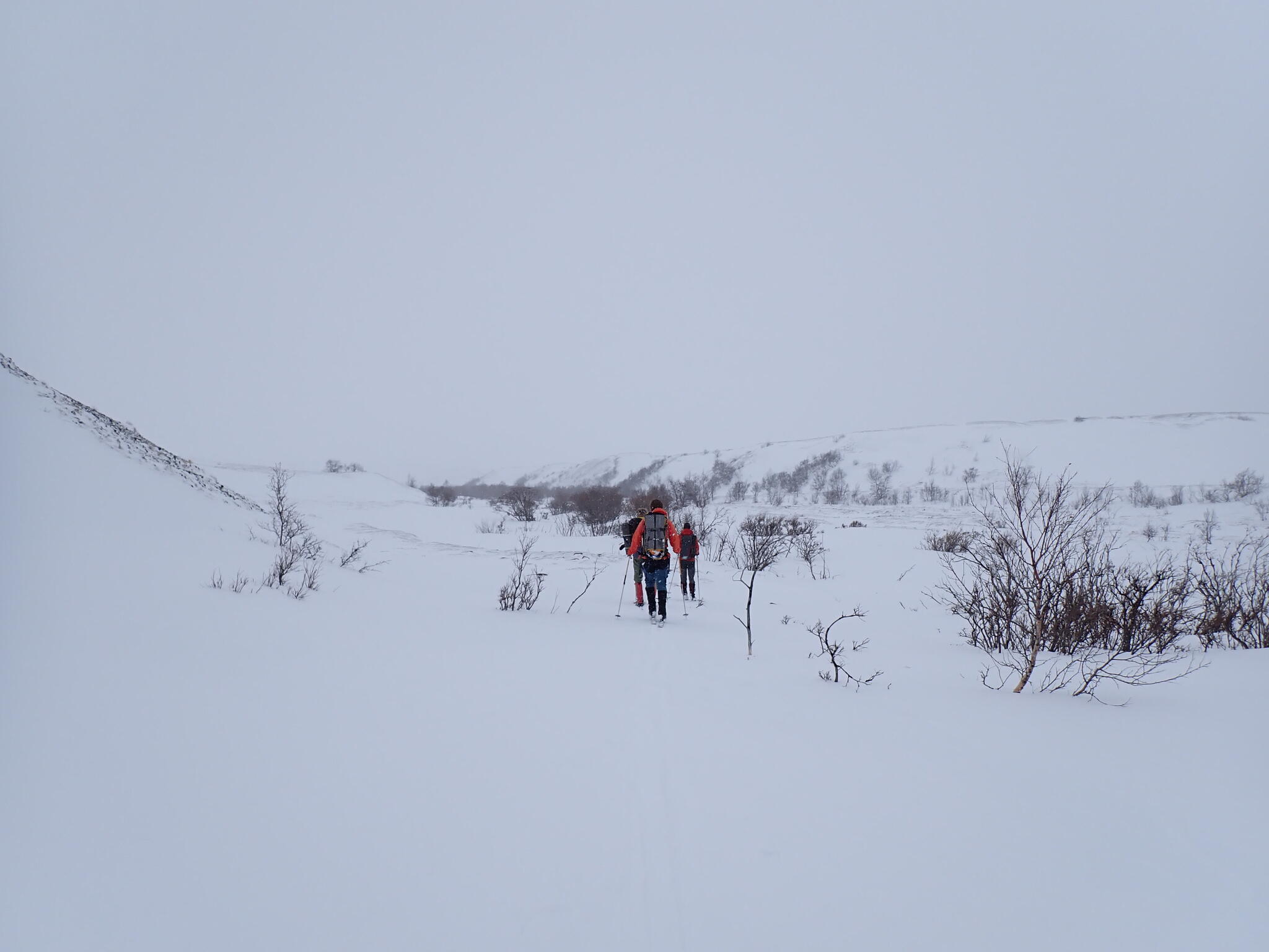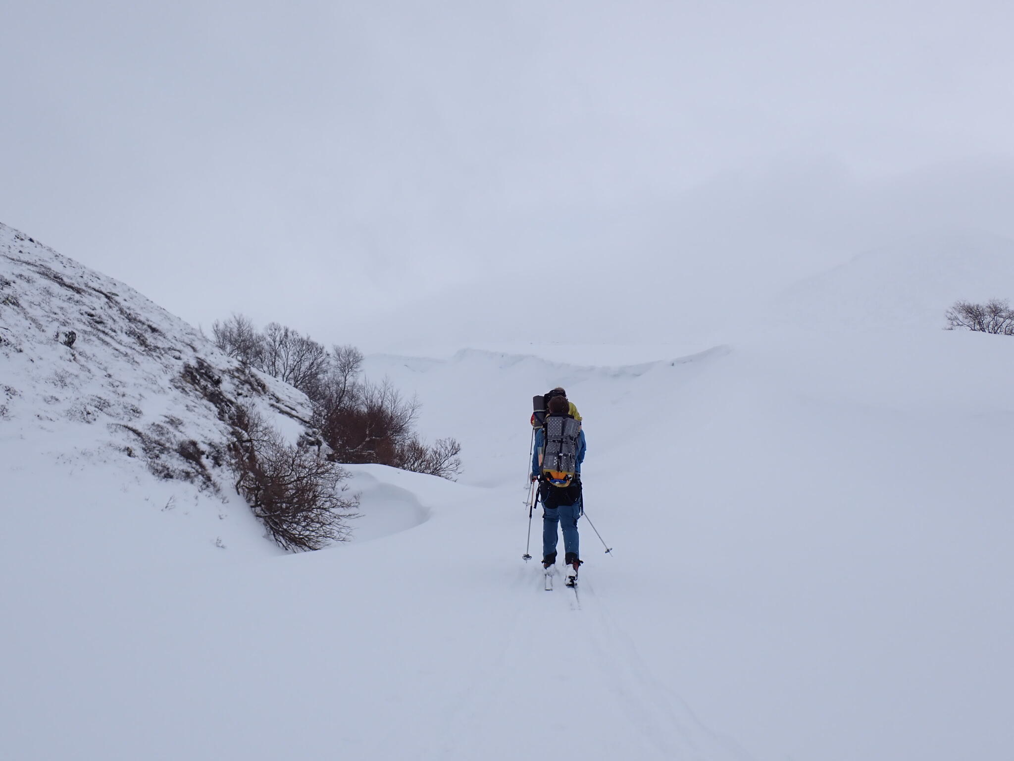 Vi behövde skida ner i bäckravin för att komma ner till den stora huvuddalen Dörålen. Mycket medvind och en hel del lutning, men det gick bra att komma ner. Snö yrde och bitvis brant.