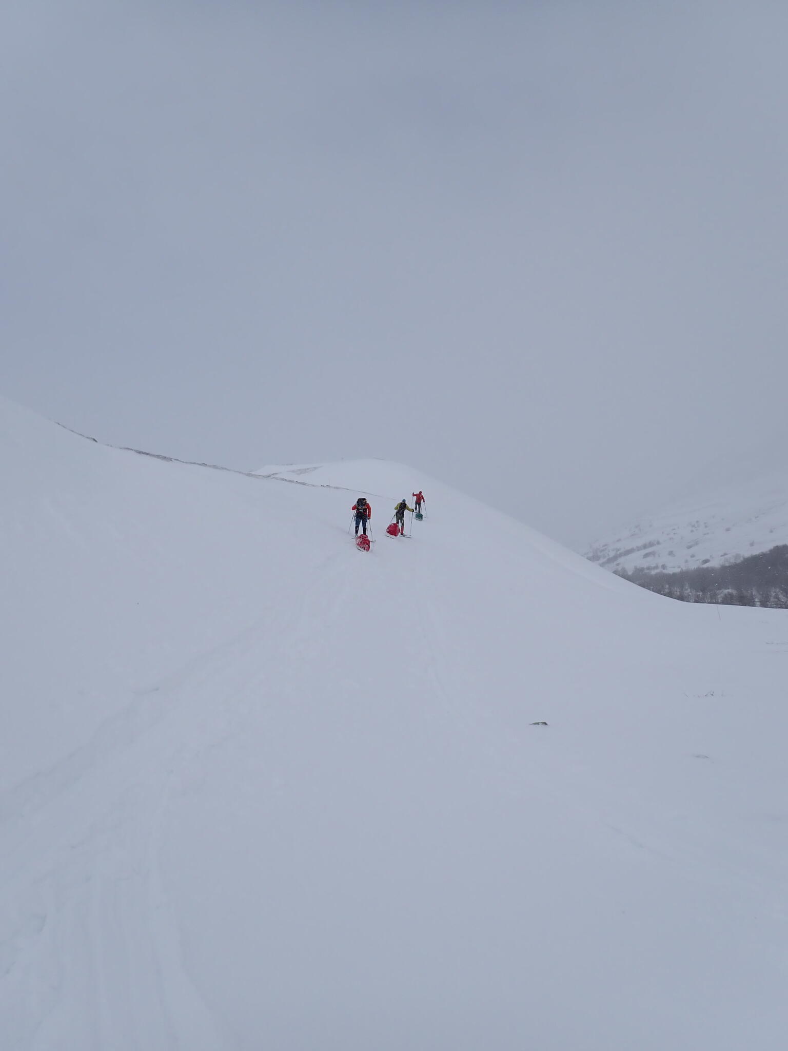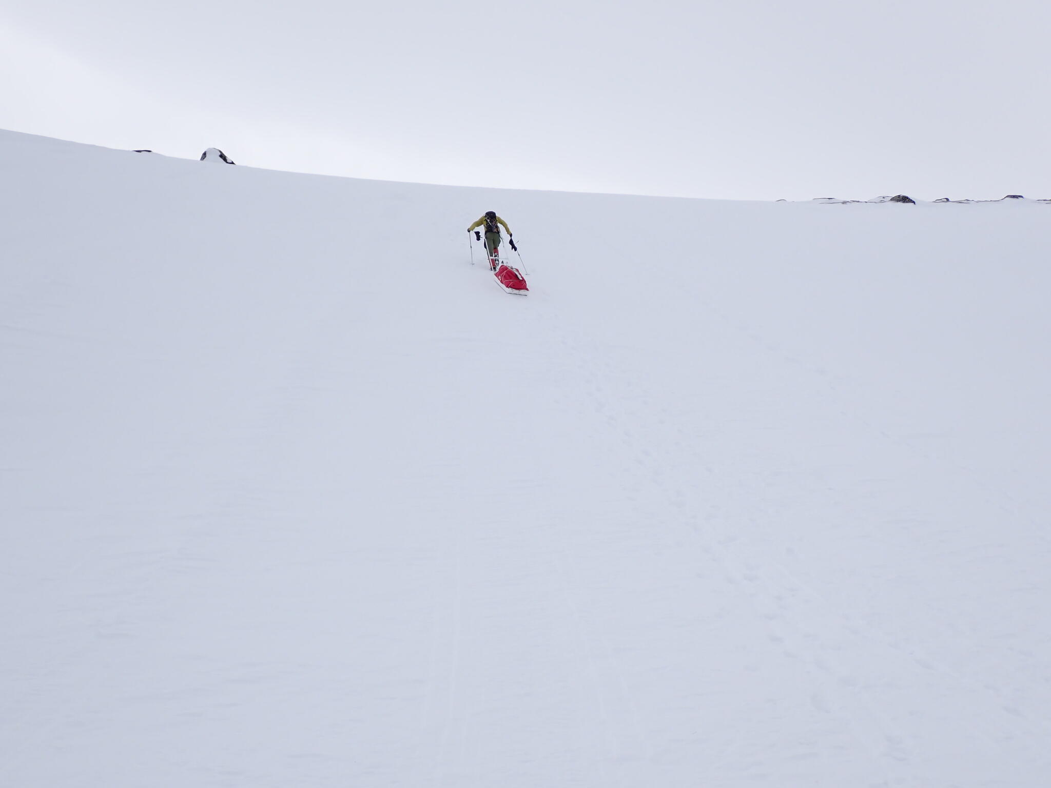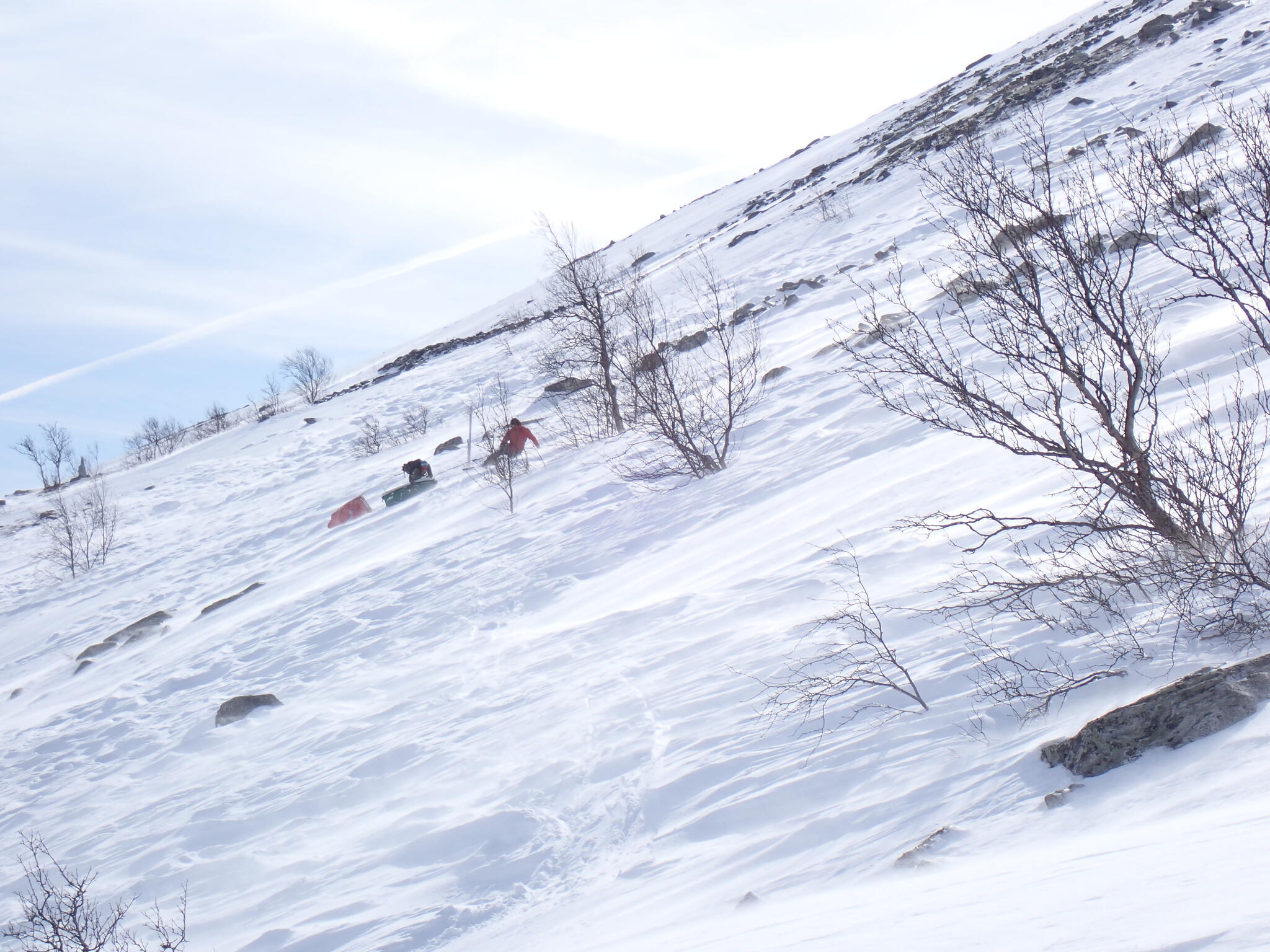 Men ganska snart kom vi till en hård brant sluttning som vi behövde skida längs. Frisk vind och hård skare puttade pulkorna neråt sluttning. Pulkorna kasade medan vi försiktigt tog oss fram på sluttningen. Vi var inte sugna på att tappa greppet och kasa ner för slänten. Vi tog oss över slänten till en liten ås.