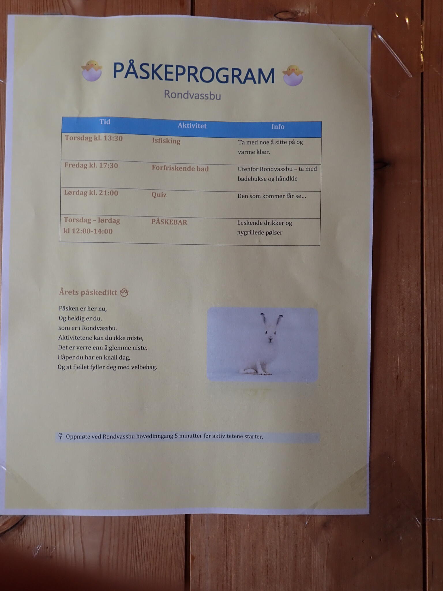 Jag kikade på fjällstationens påskprogram, som var uppsatt på väggen. De såg ut att ha haft roliga aktiviteter, med bad i vak och skidåkning.