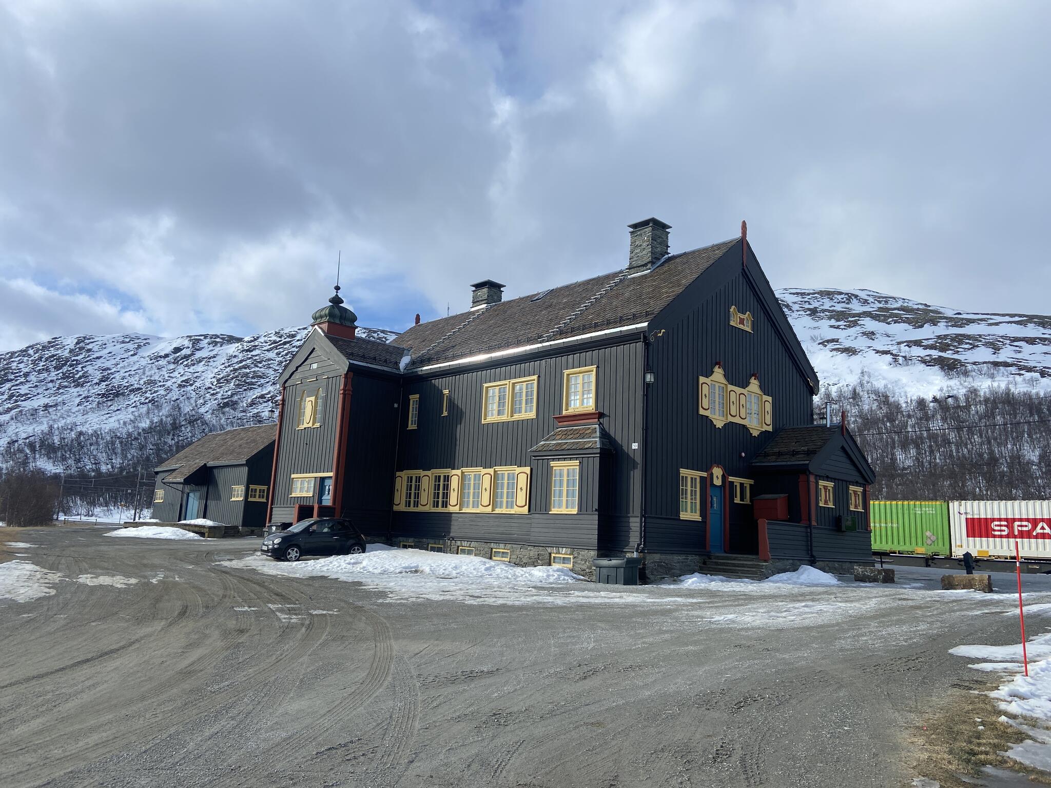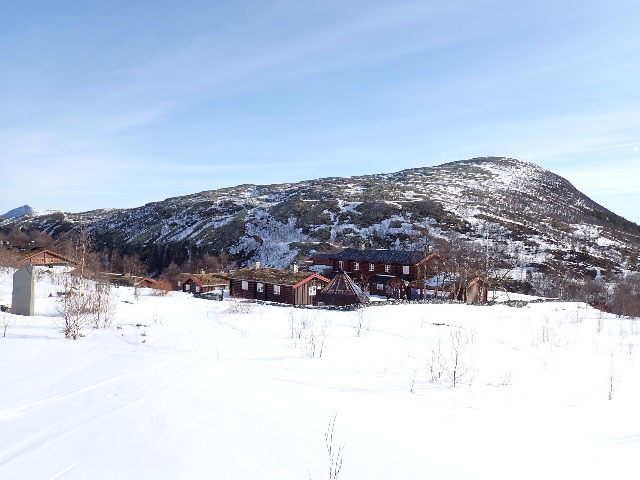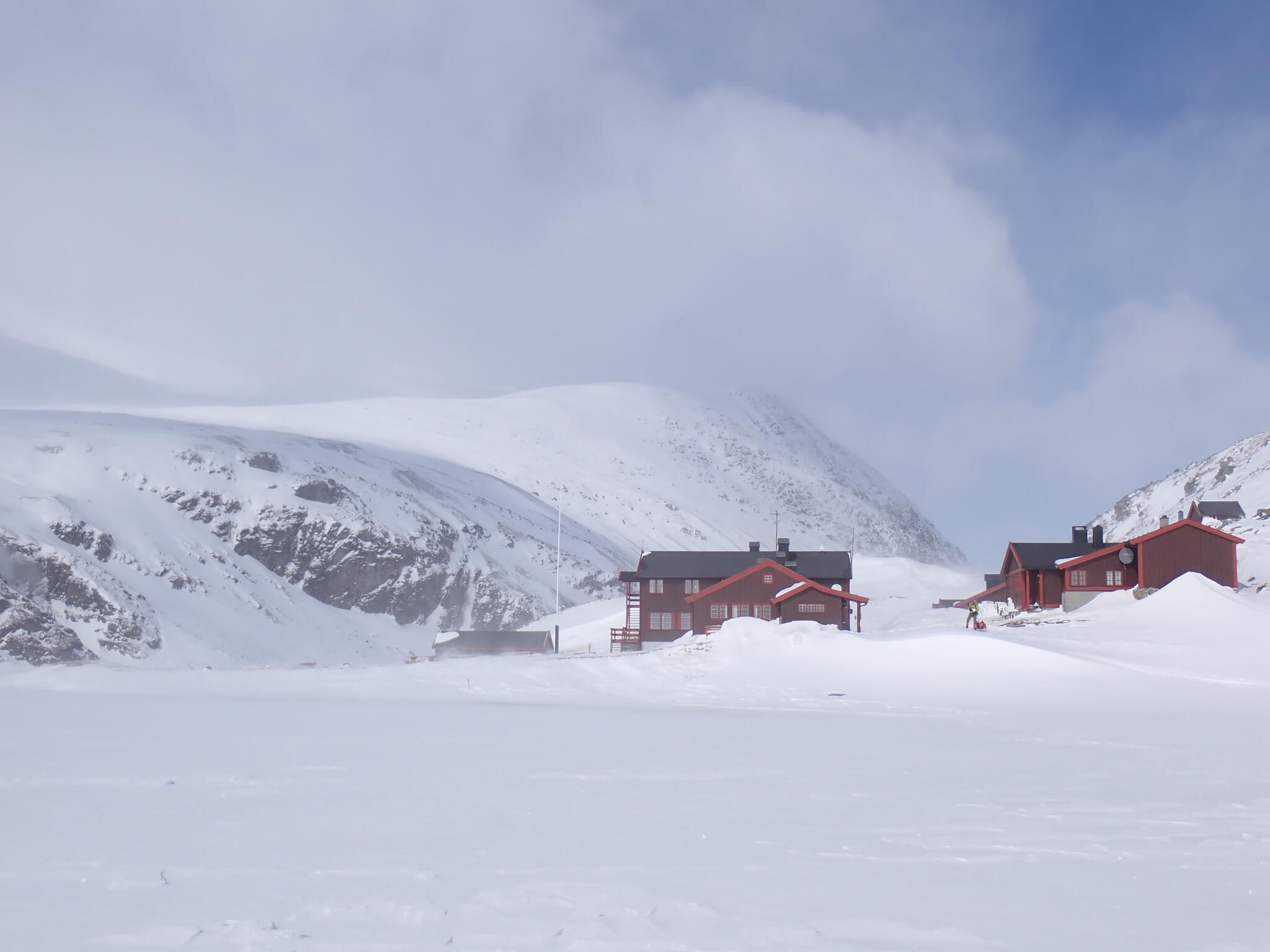 Skidade runt stationen och kikade. Huvudbyggnaden stängd. Stugan som är för självhushåll (självbetjänt) gick vi in i med DNT-nyckel. Där åt vi lunch. Blåste och snöade mycket ute. Mysigt och fint i stugan.