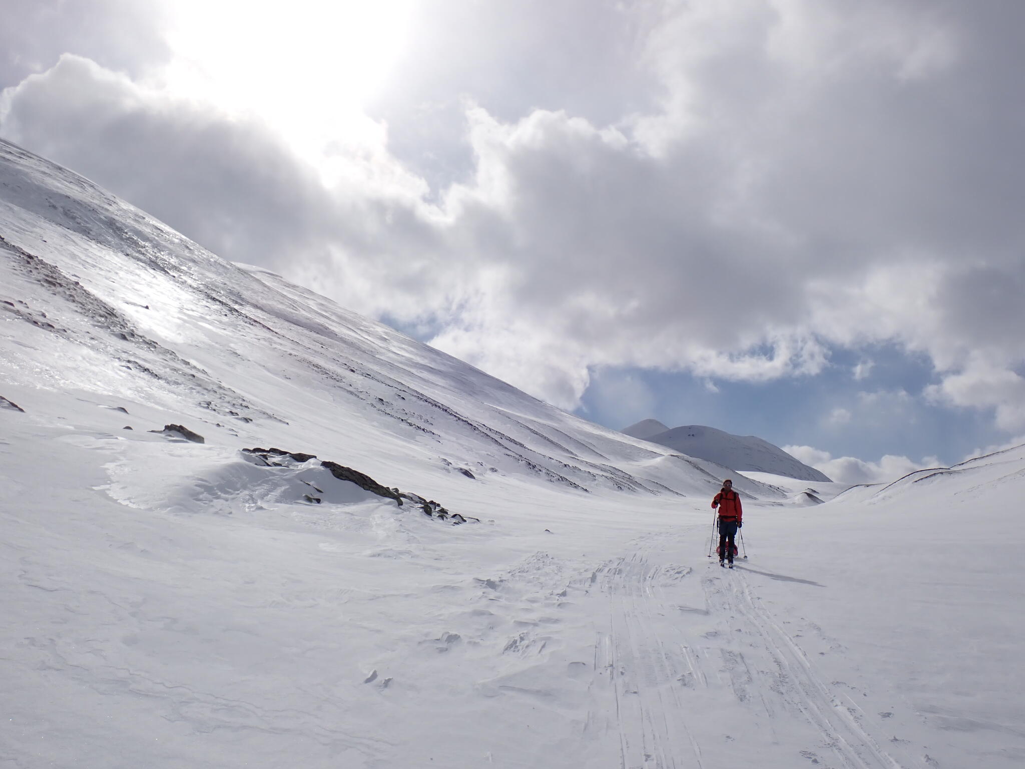 Vi hade möjlighet att skida lite till denna dag. Topptur eller skida längre ner? Det började blåsa mer. Kallare vindar. Molnen rörde sig snabbt över topparna. Det kände som att det var dags att hitta läig tältplats.