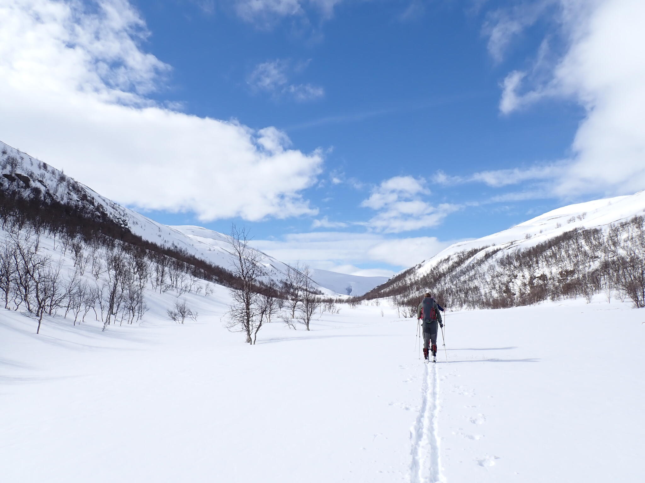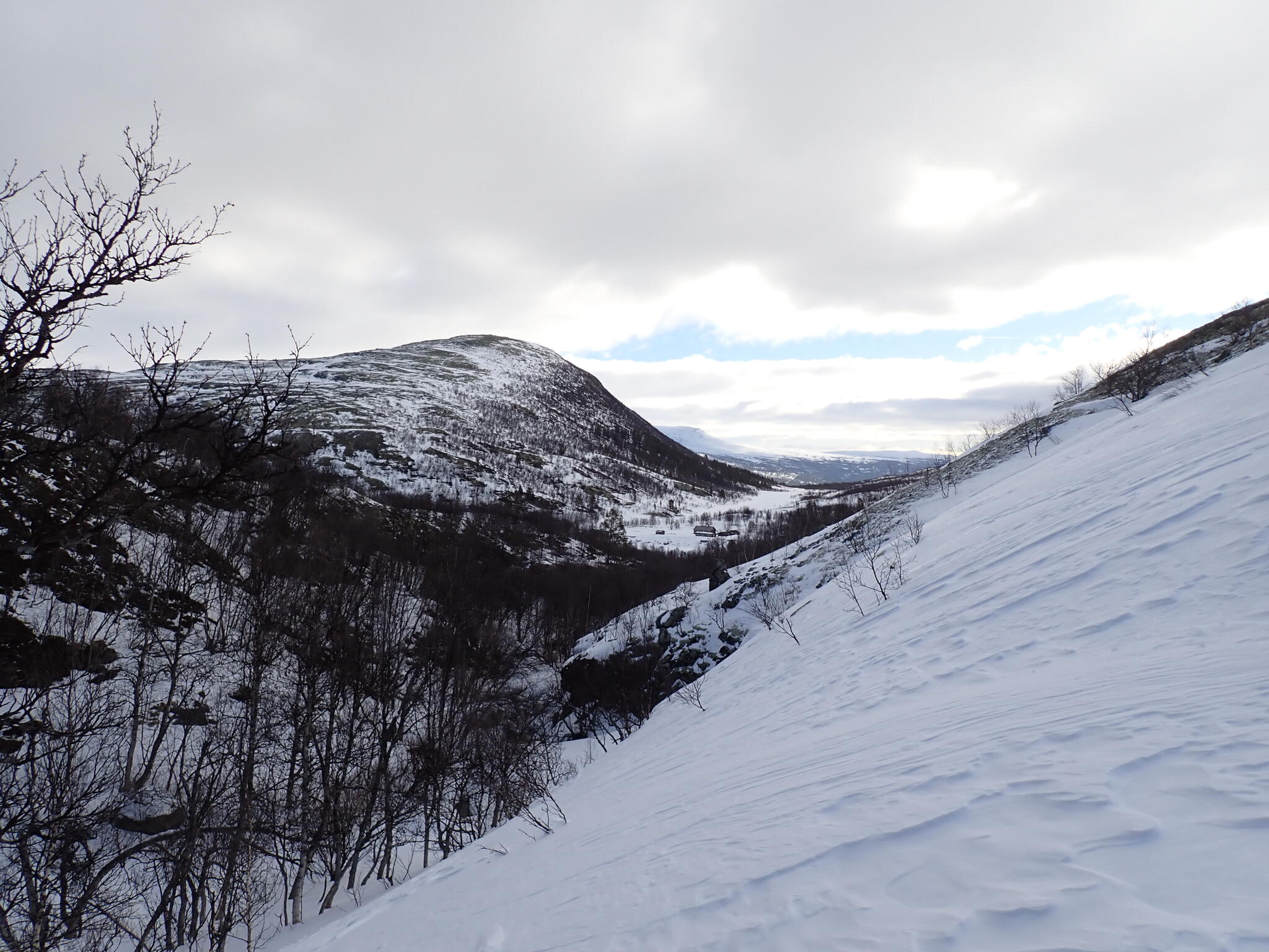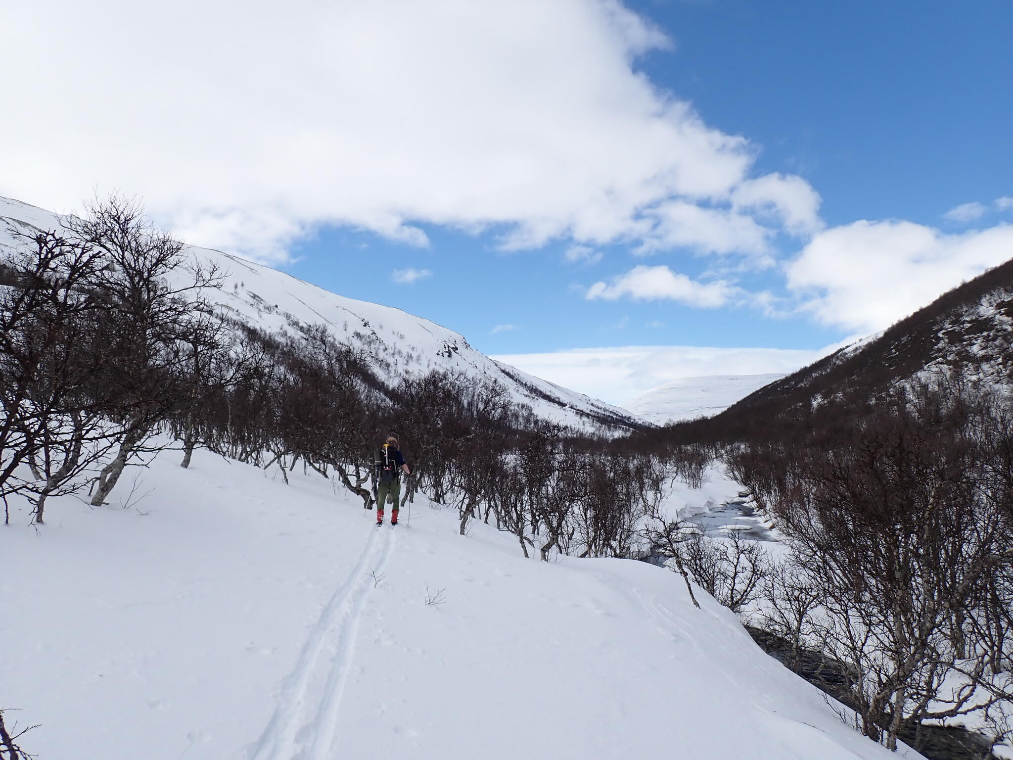 Vi hade på kartan sett ut den lite trängre Djupdalen som en eventuell passage. I början var dalgången skogsbevuxen med fjällbjörkar och vide. En skoter hade kört i dalen, vilket gav hopp om att det skulle gå att ta sig fram. Det var ibland trångt bland träd. Skidade ibland på ån Haverdalsåe. Såg strömstare. Efter ett par km öppnade dalen upp sig och det fanns mer snö och färre träd. Den ökade snömängden fick en att känna att vi nu hade kommit till ett lite snösäkrare område.