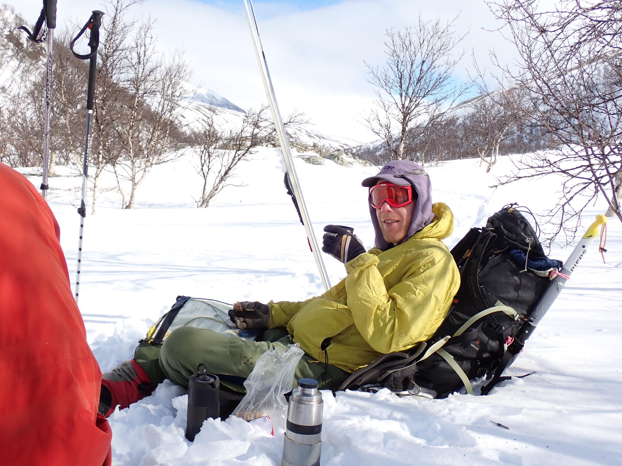Lunch i glänta i fjällbjörkskog. Soligt och varmt.