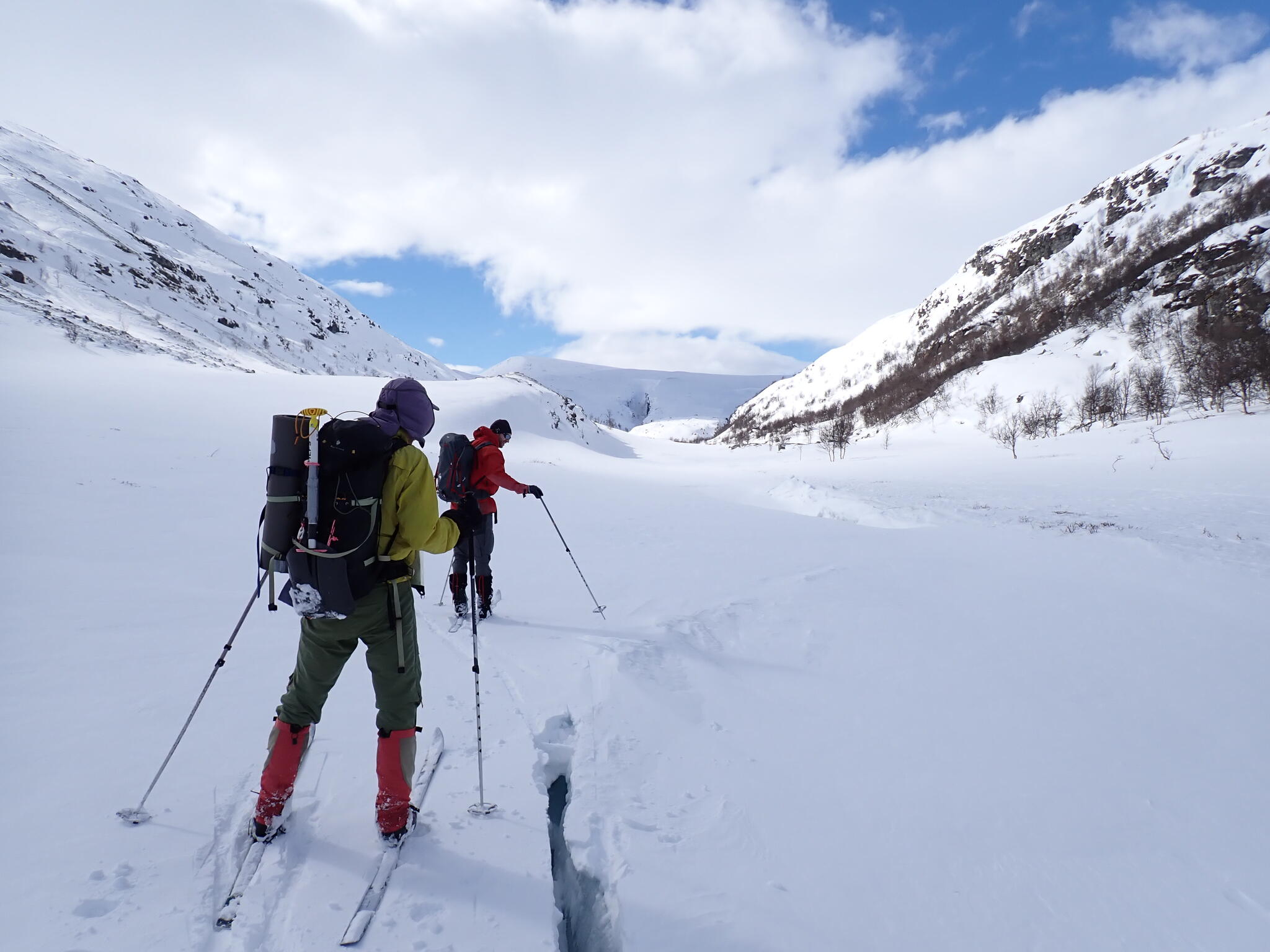 Sedan skidade vi in till slutet av dalen. Magnus höll på att fastna med skidan i en spricka.