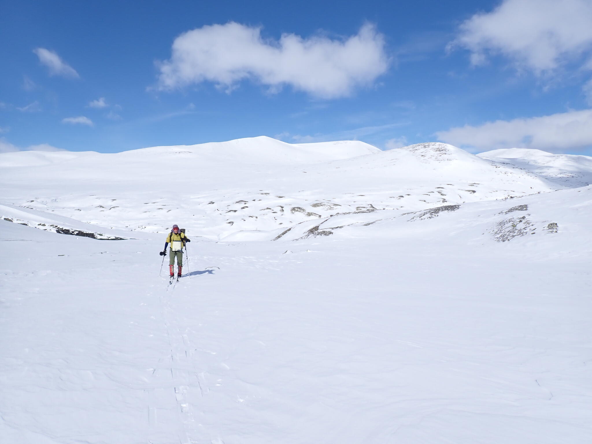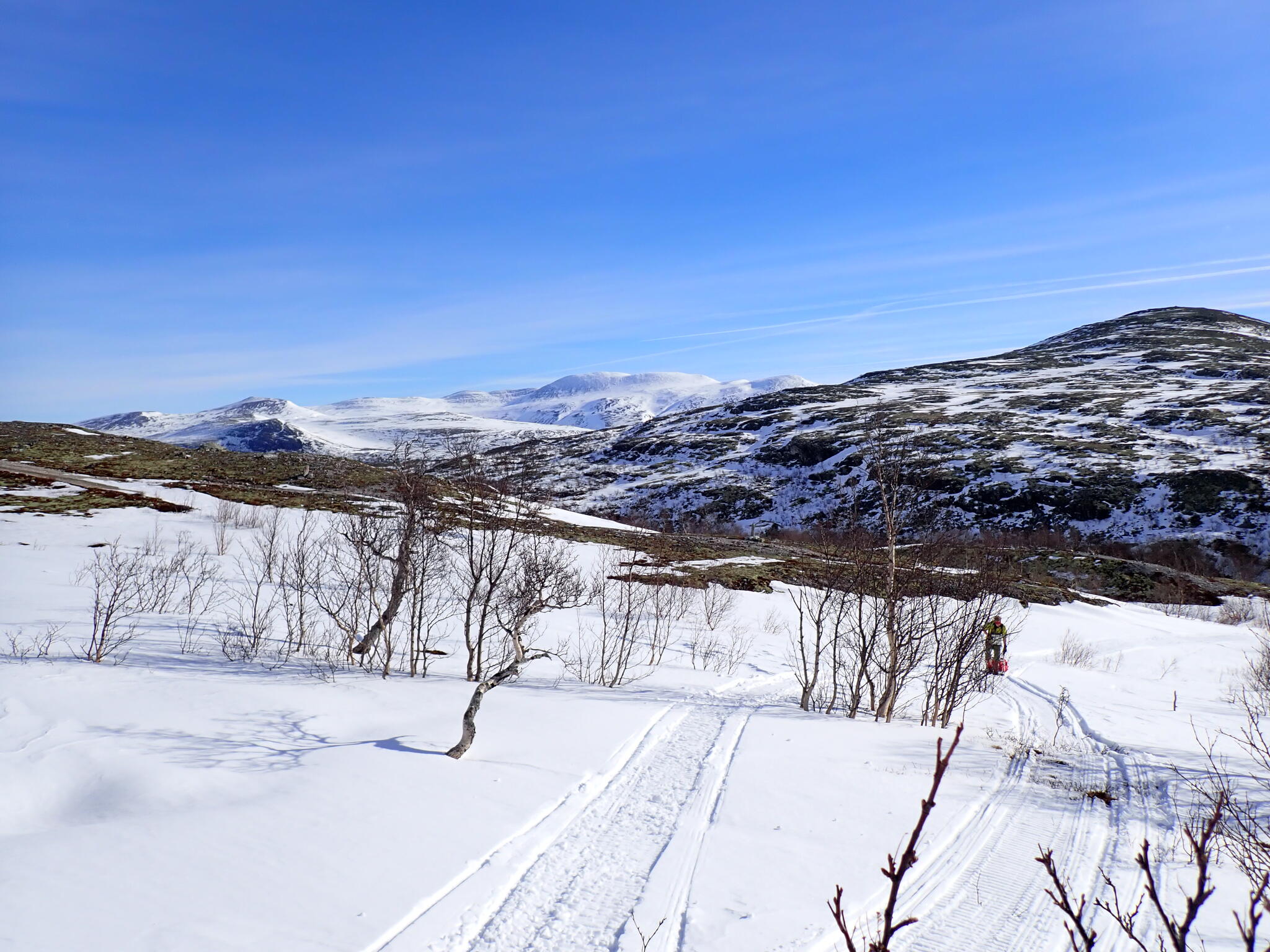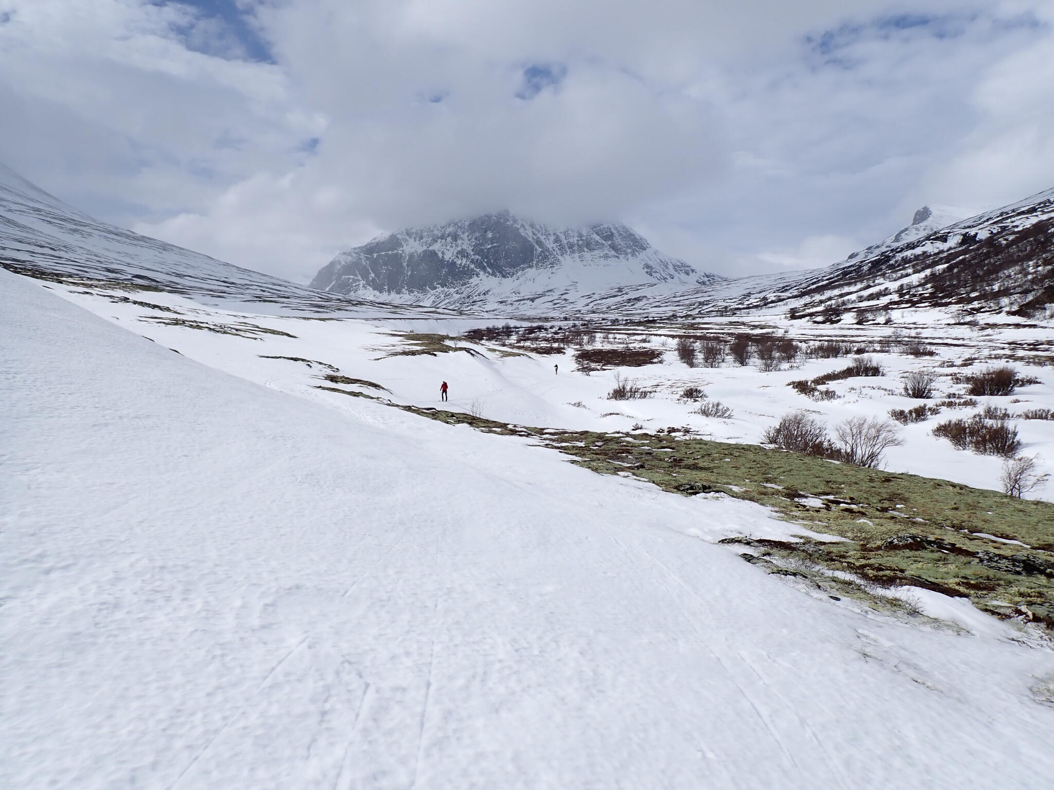 Det blev bättre sikt och vi skidade iväg på en eftermiddagstur runt ett litet fjäll: Neverbuhöe. Vi började med att skida upp i Vidjedalen. Varmt och soligt. Dalen är bitvis trång och när jag kikade på kartan insåg jag att jag och Anja gick där 2013 på vår fjällvandring i Rondane. på väg mot Högronden.