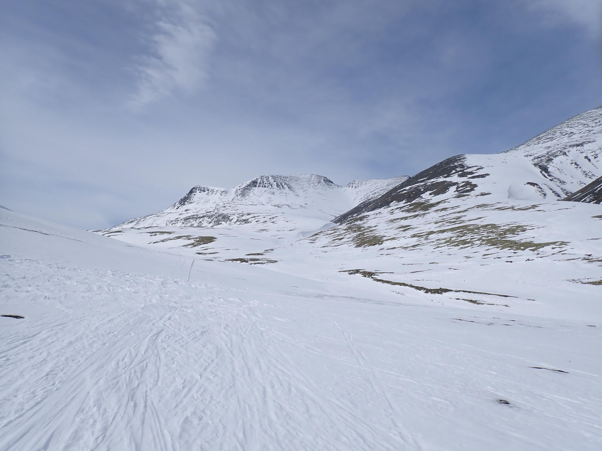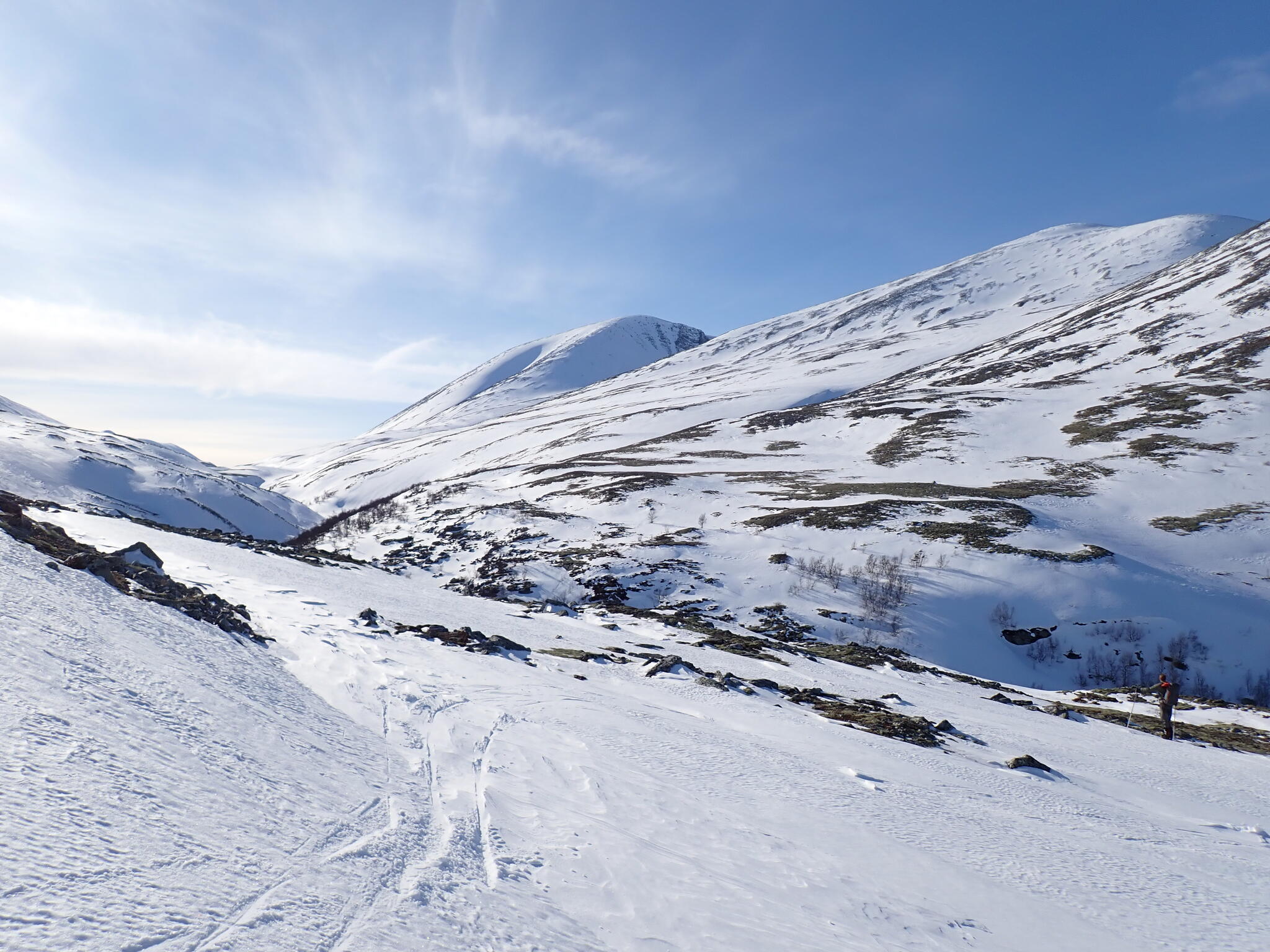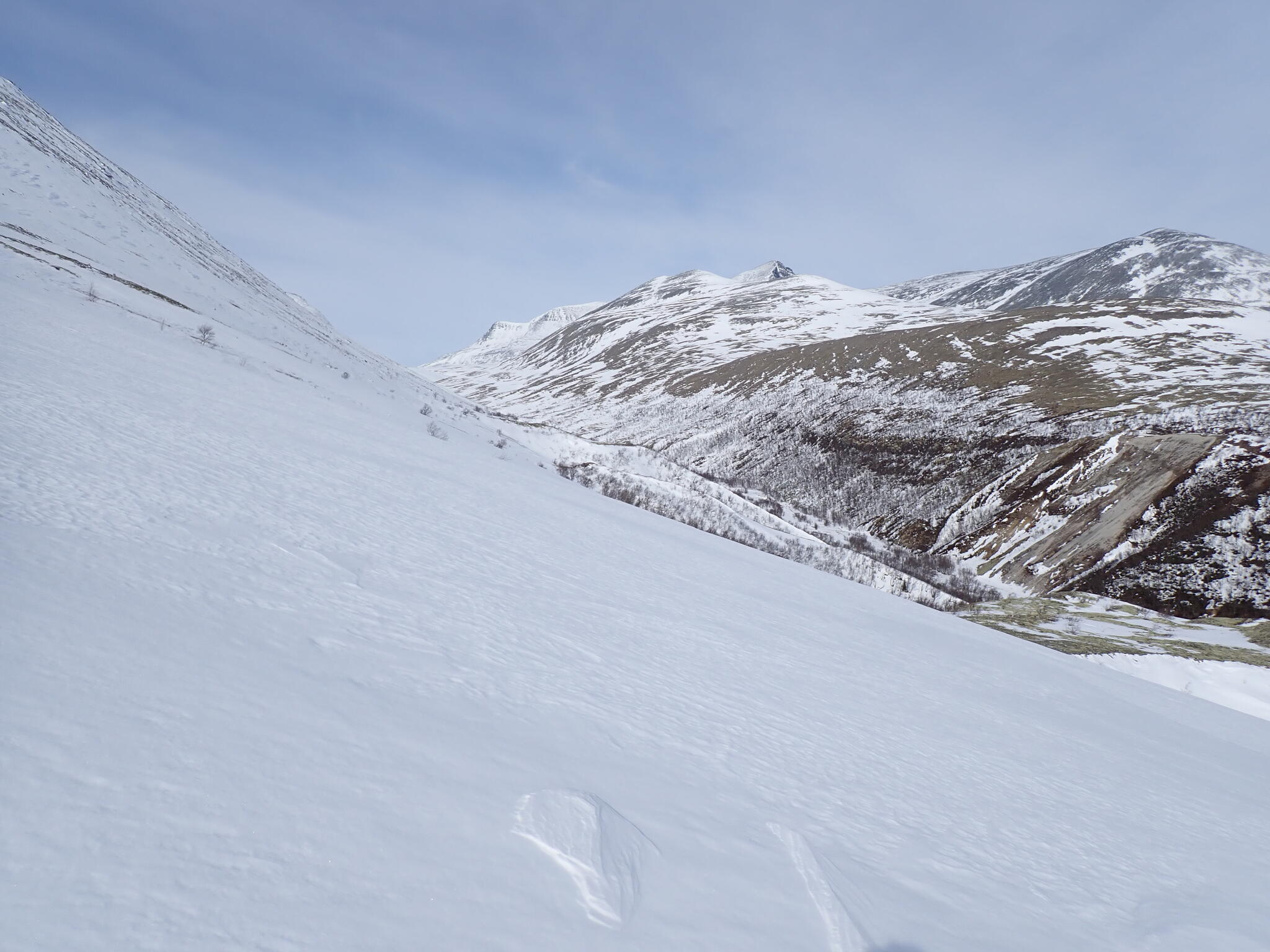 Vi kom in i Hornflågådalen. Gott om snö och det fanns flera fina fjäll som lockade till besök.
