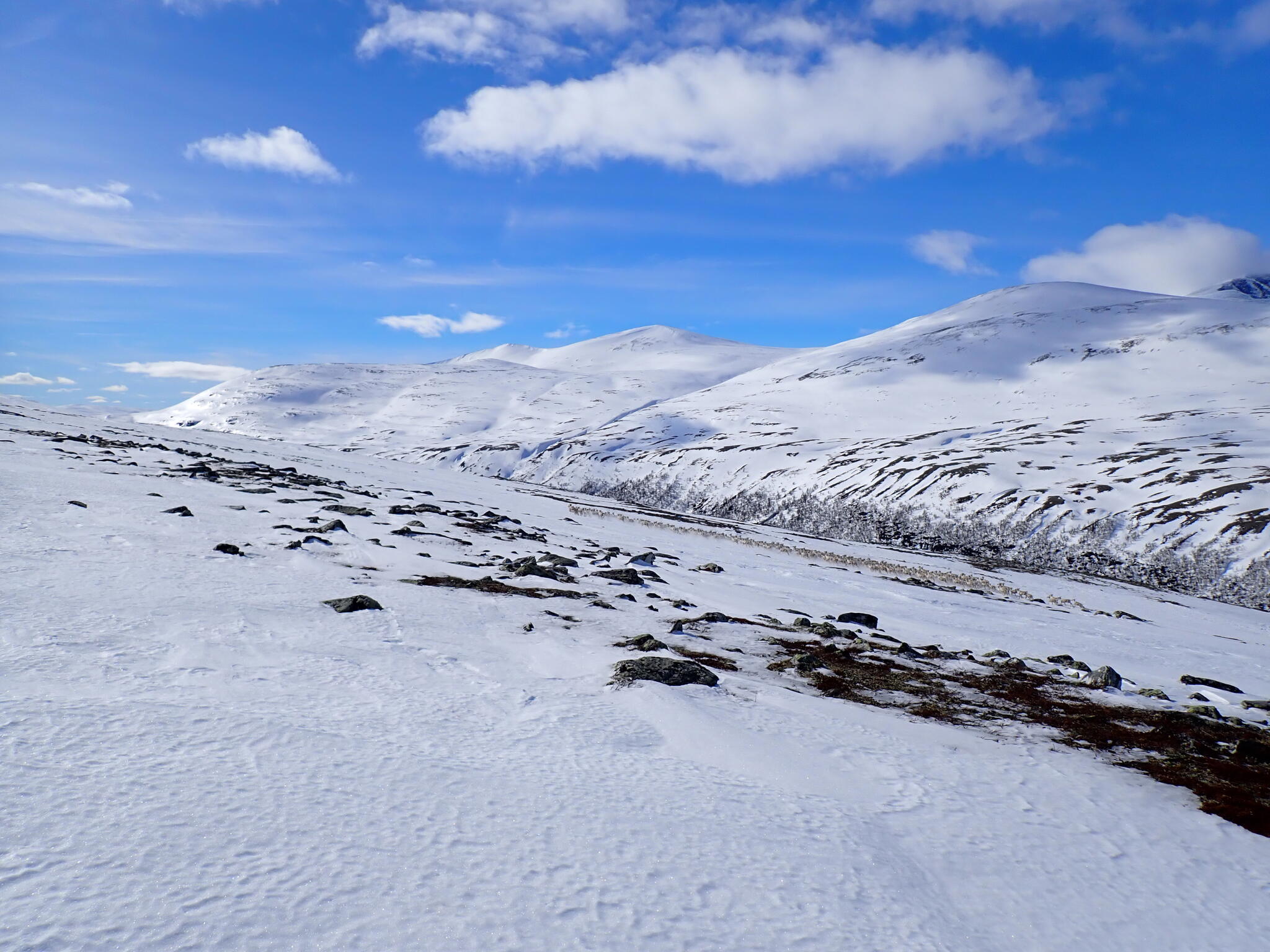 När vi väl kom över rygg och in i dalen blev det ok att skida då vi hittade snösträngar och snöfält lite här och var. Soligt och varmt.