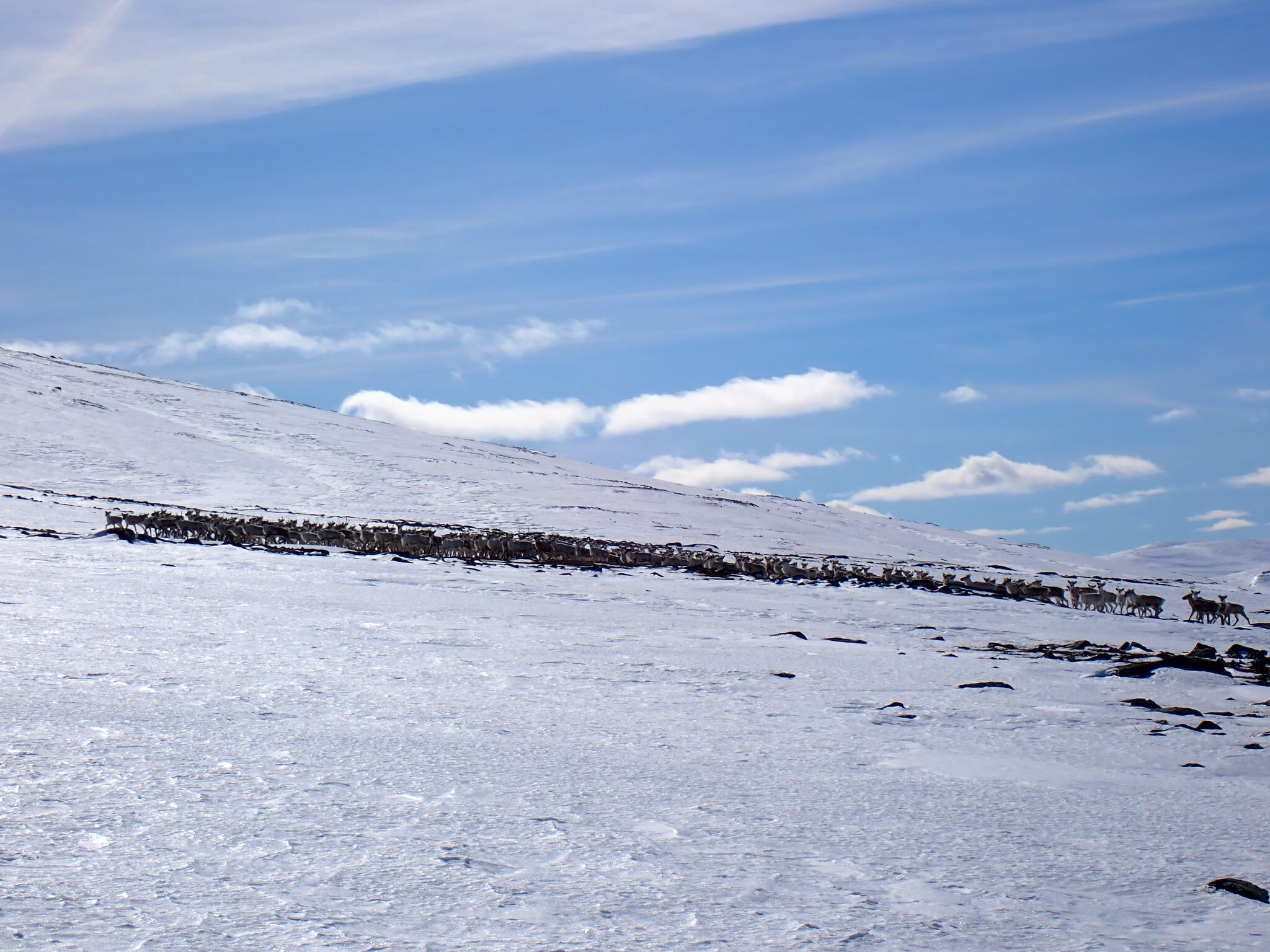 Nu skulle vi ner i Musvoldalen igen och siktade på ett ställe där det såg ut att korsa dalen. På väg ner i dalen såg vi en stor flock vildrenar. Häftigt! Vi stog stilla och lät dem passera.