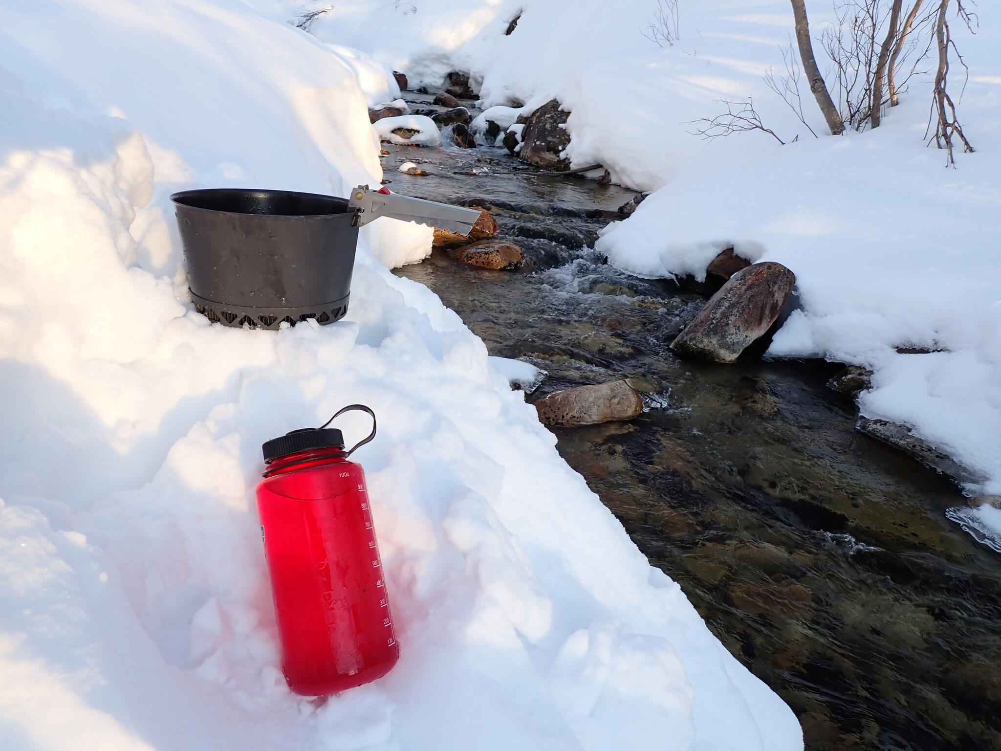 Jag hade iordningställt en plats vid ån där vi kunde hämta vatten. Lyxigt på vintertur med rinnande vatten vid lägerplatsen.