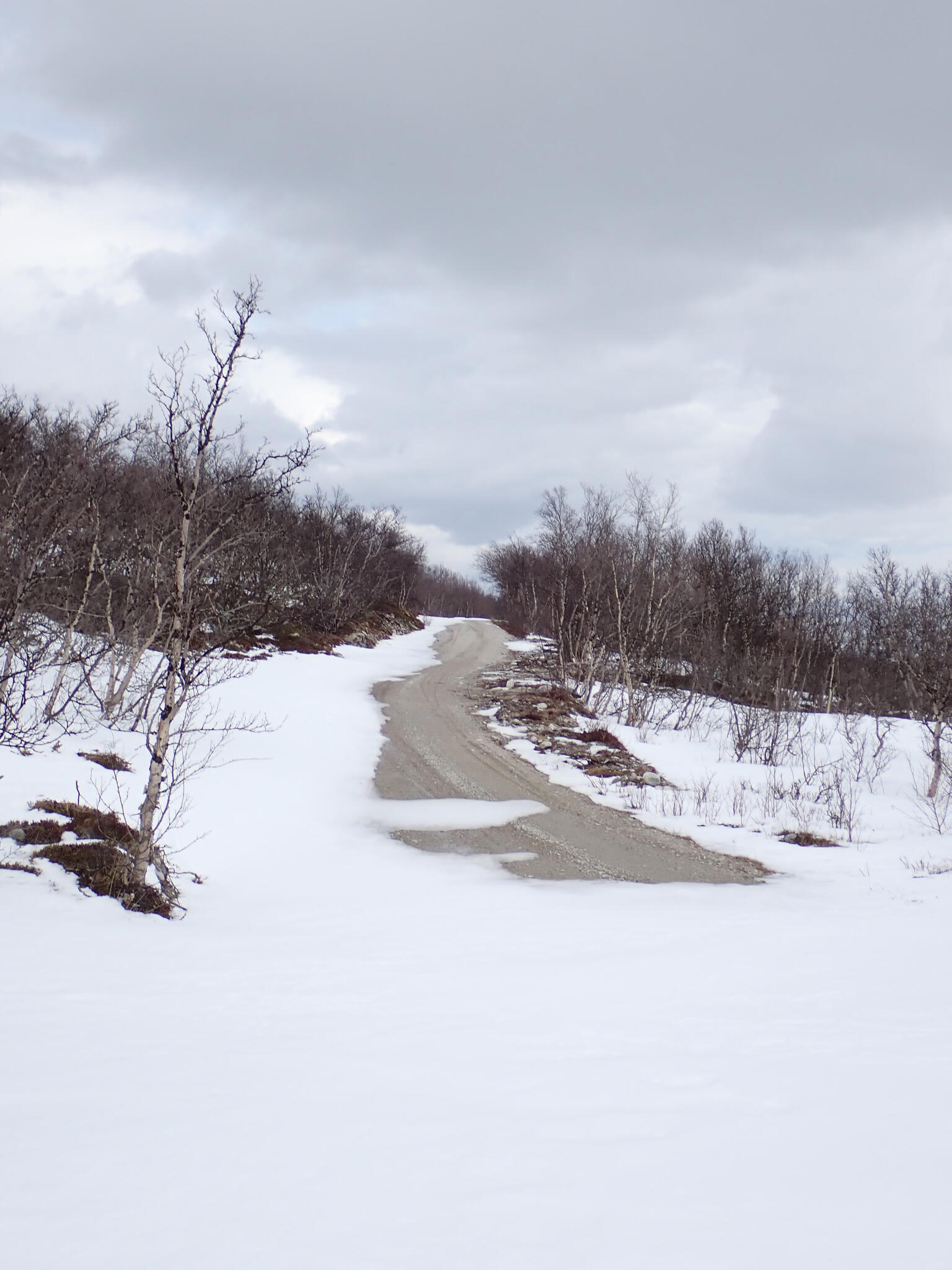 Efterhand blev det mer öppet runt vägen och snötäcket nästan obefintligt. Ofta skidade vi endast på 3 cm nysnö, som nog kommit senaste dygnet. Vid sidan om vägen var det barmark.